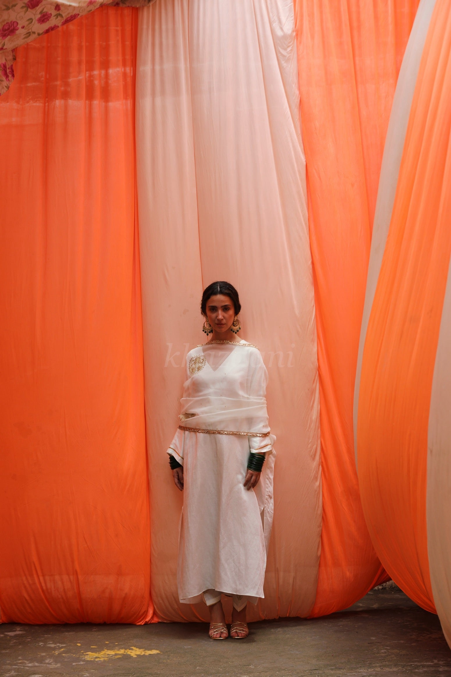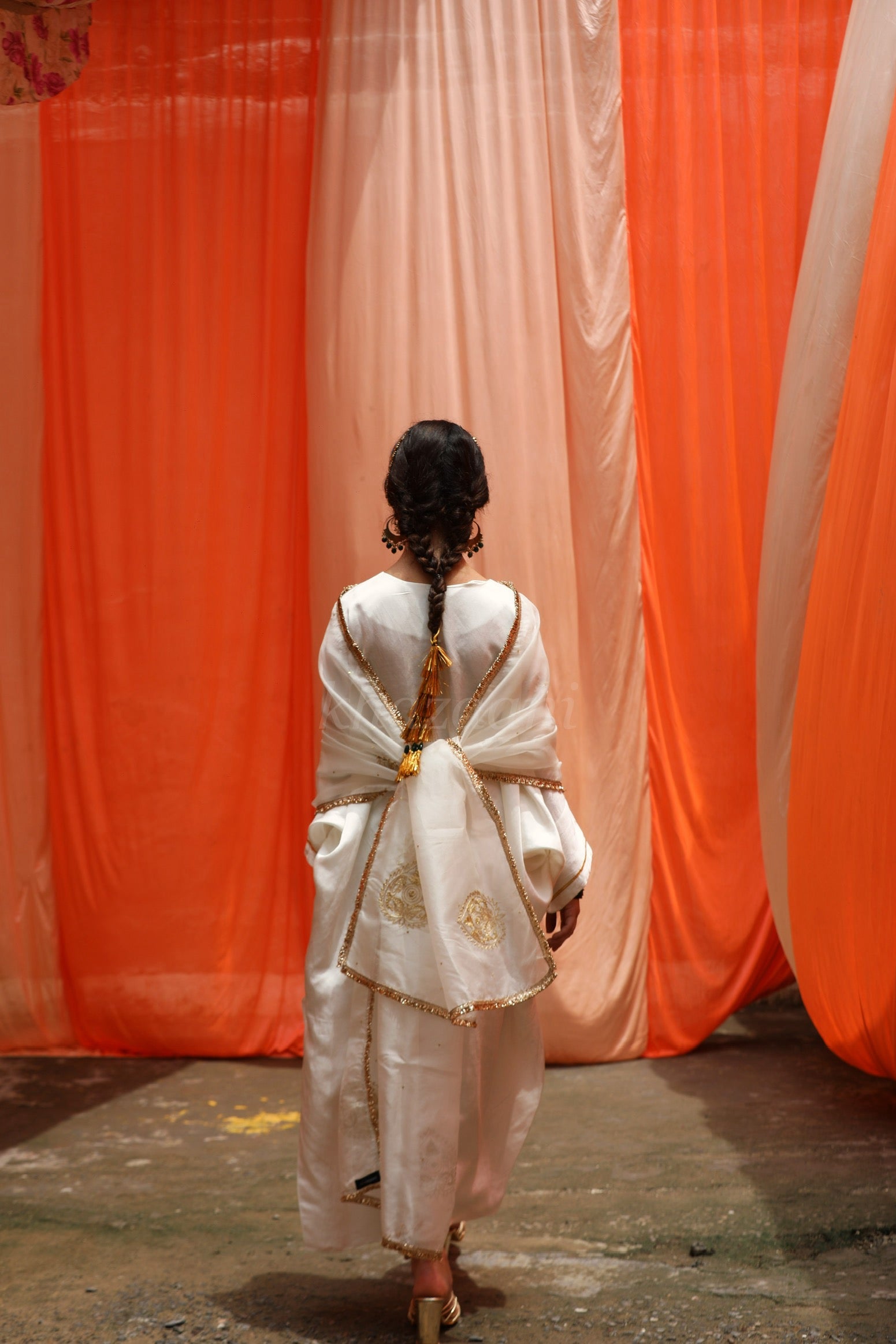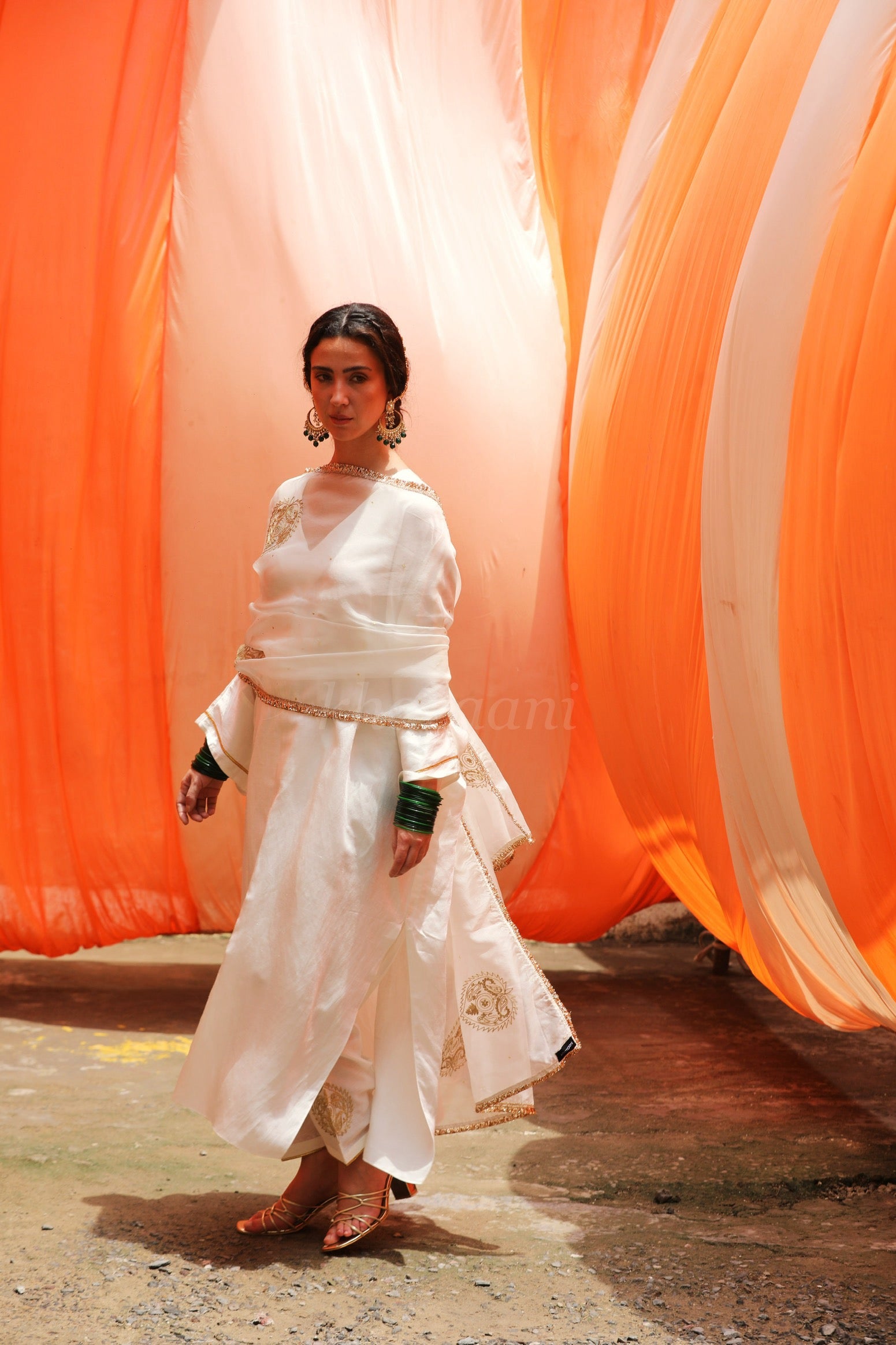 A satin silk kaftan kurta worn with salwar and an organza dupatta; highlighted with signature Romi motif and kiran.