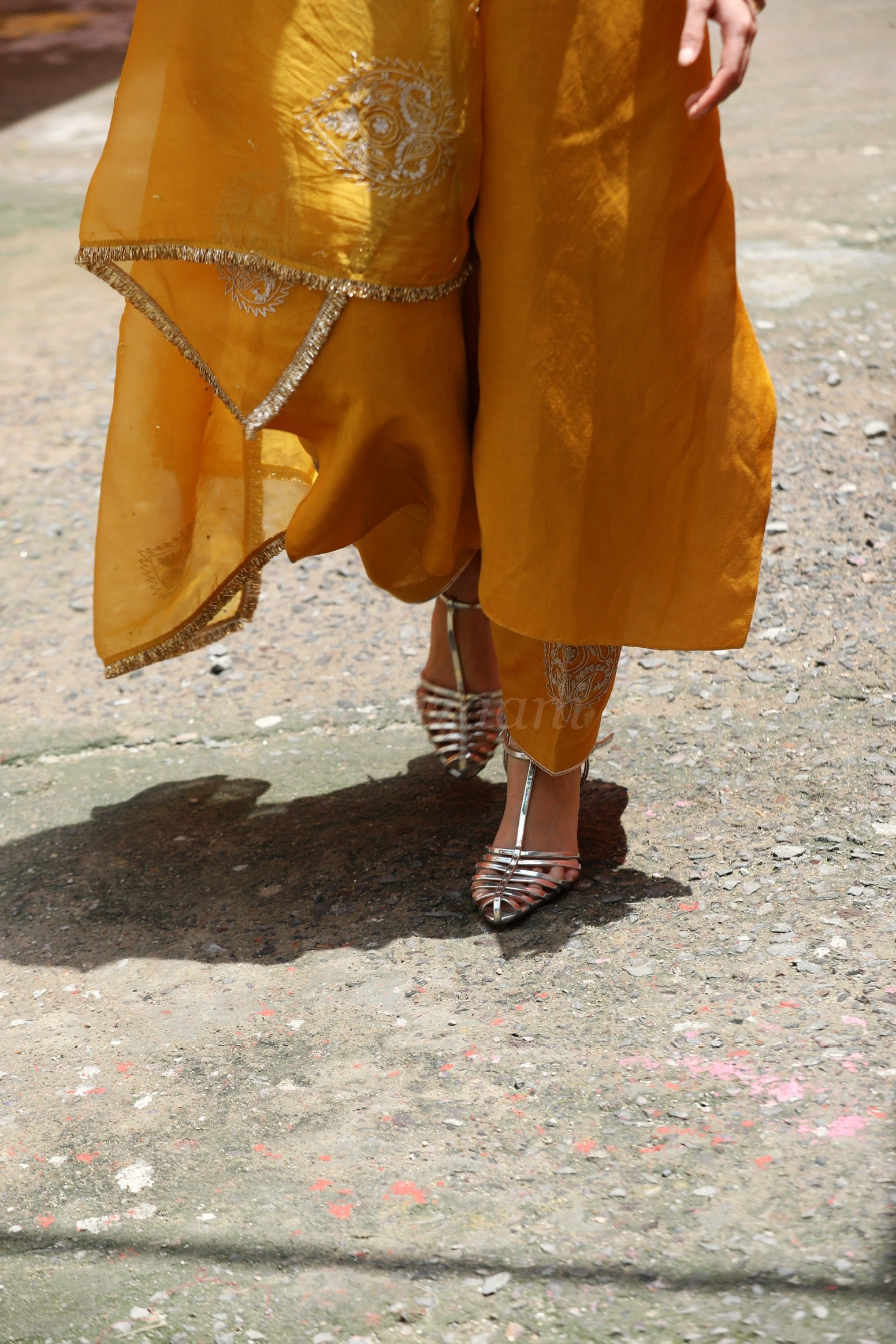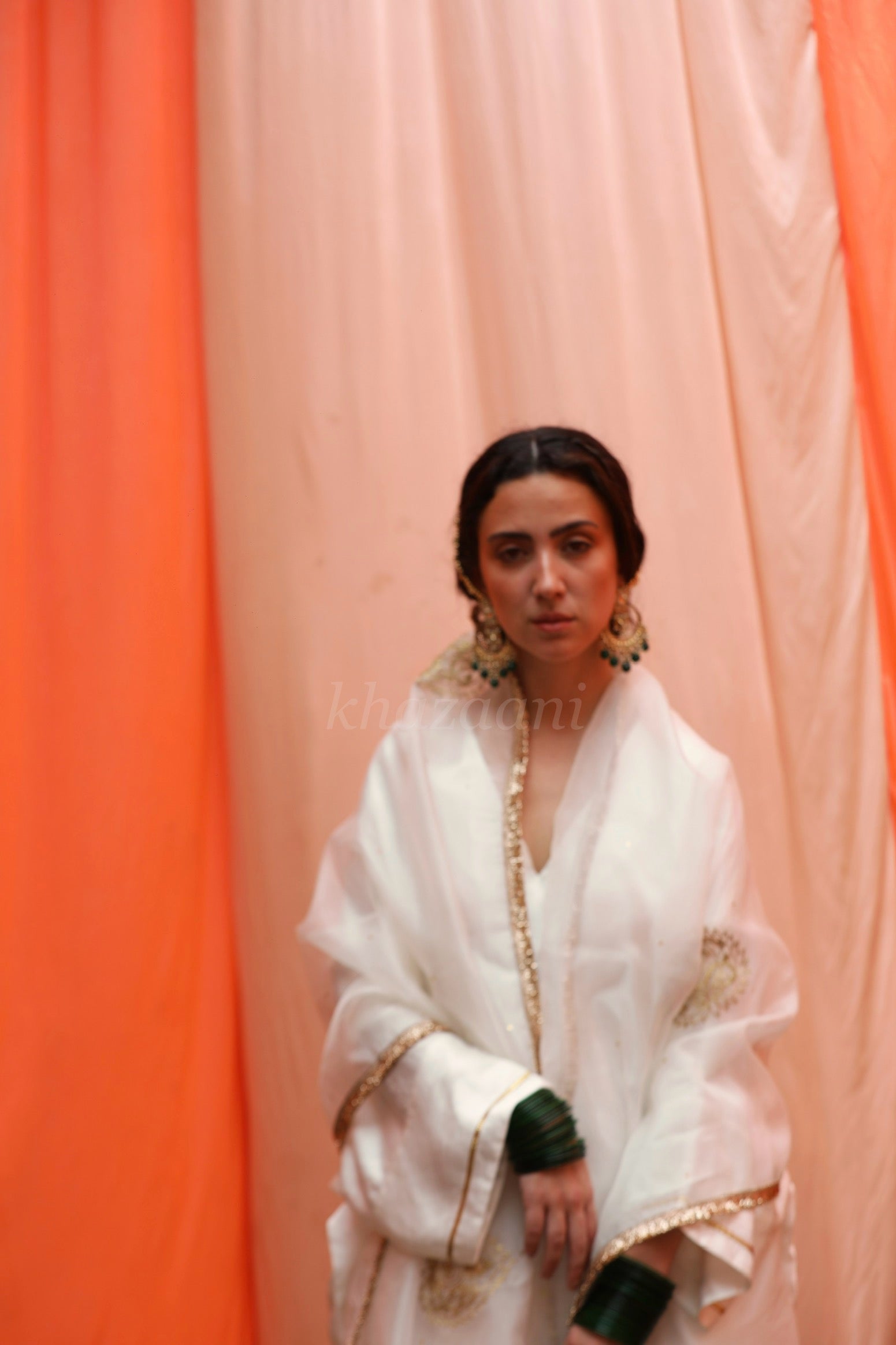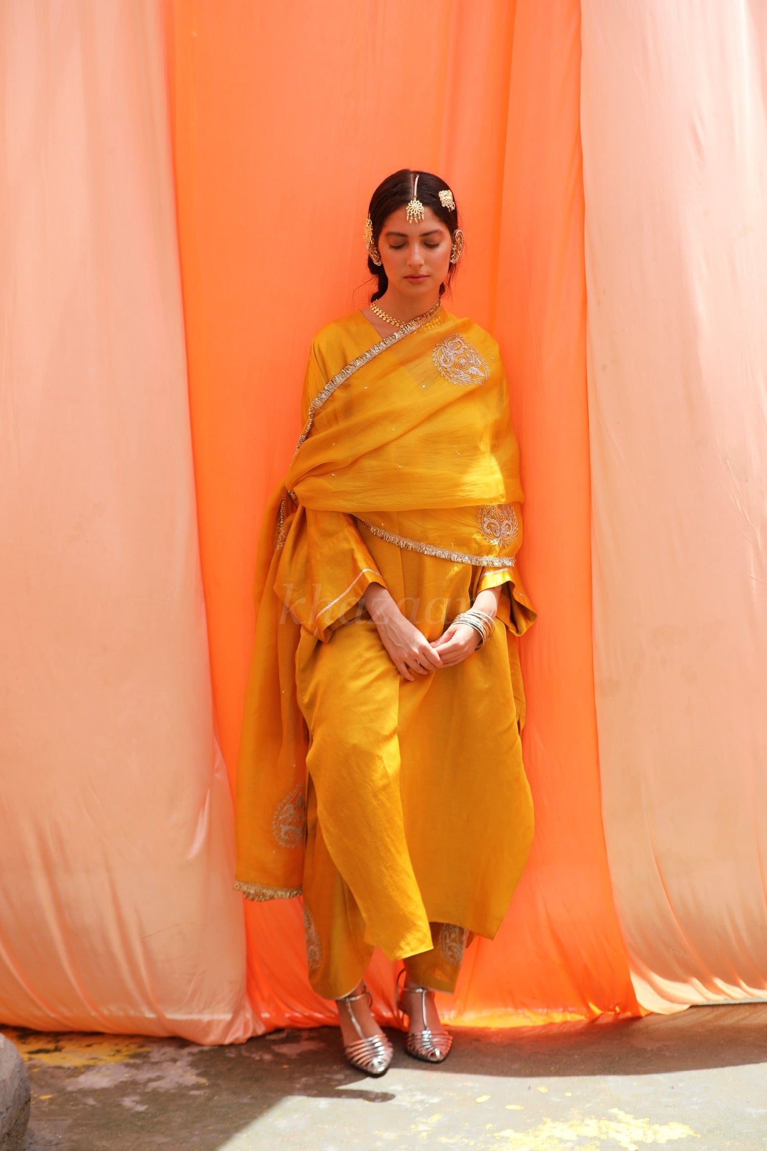 A satin silk kaftan kurta worn with salwar and an organza dupatta; highlighted with signature Romi motif and kiran.