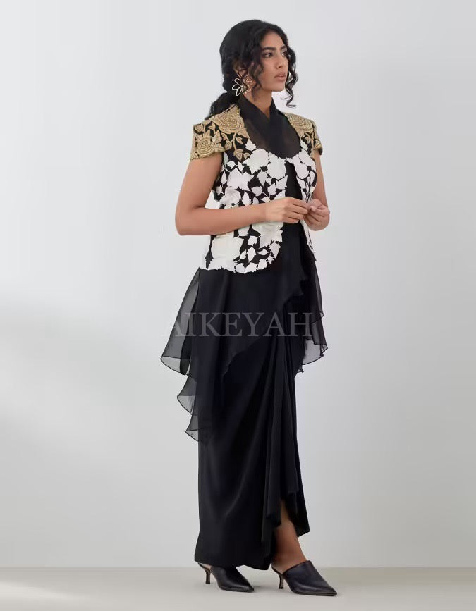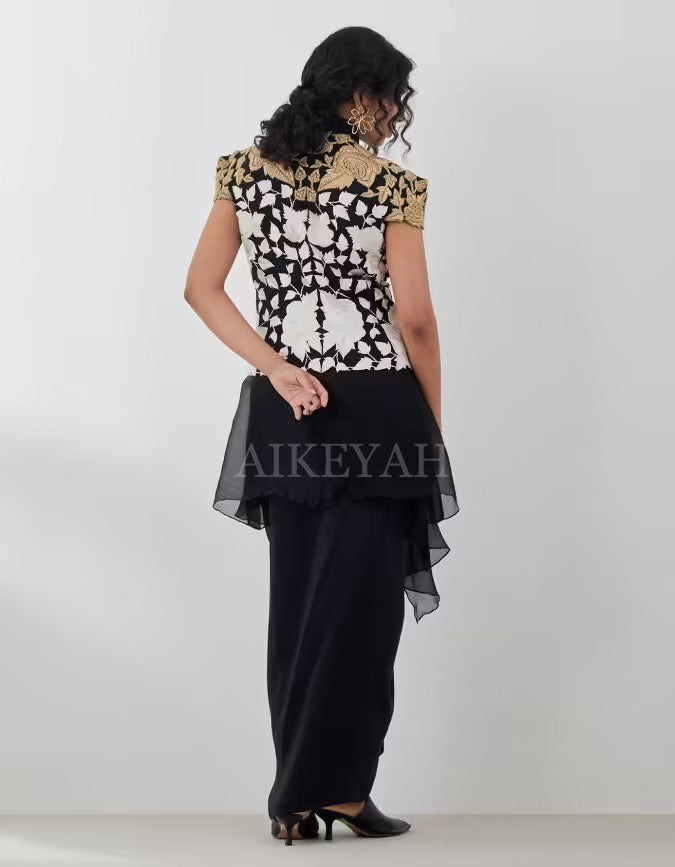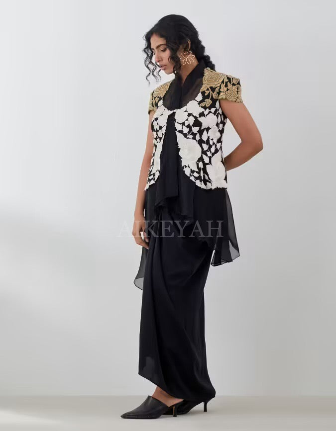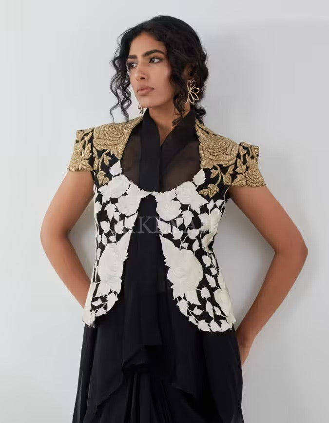 A classic signature jackets with glass beads highlighted shoulders, worn with an organza sheer top and a silk skirt.