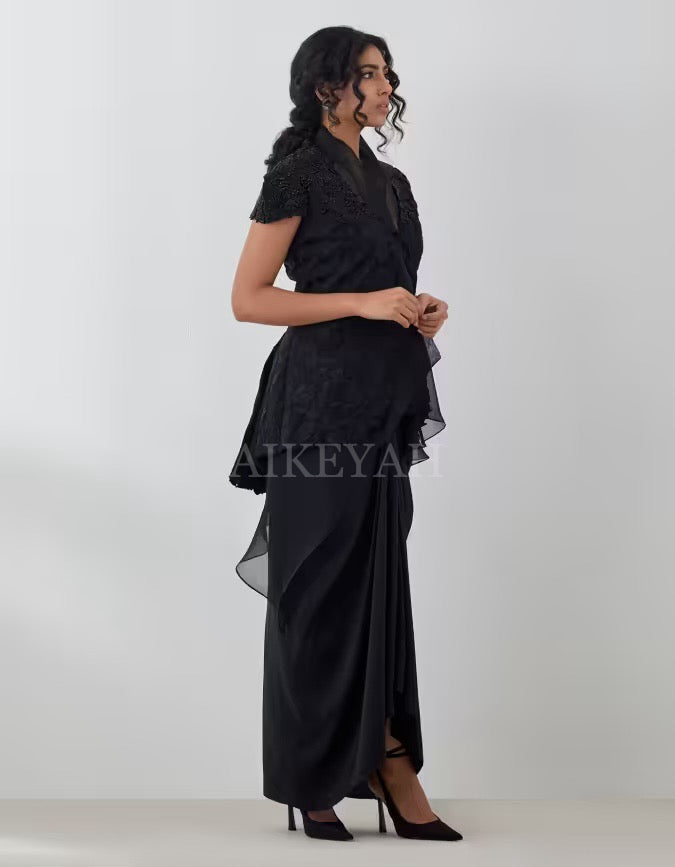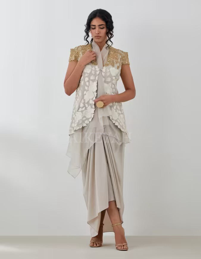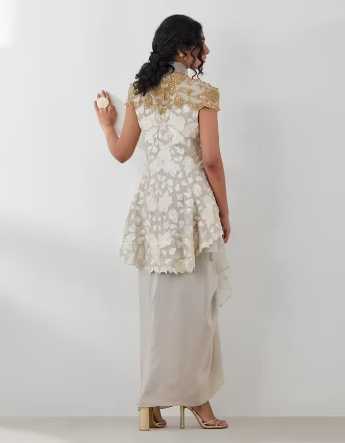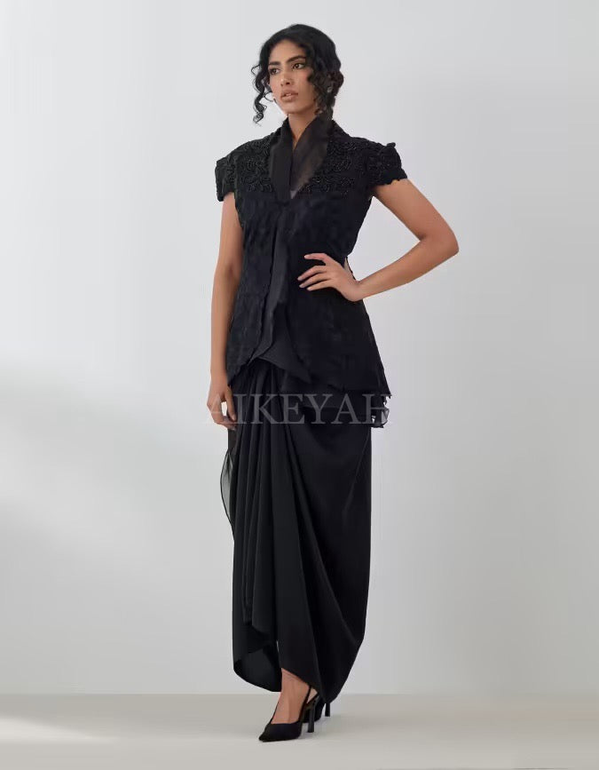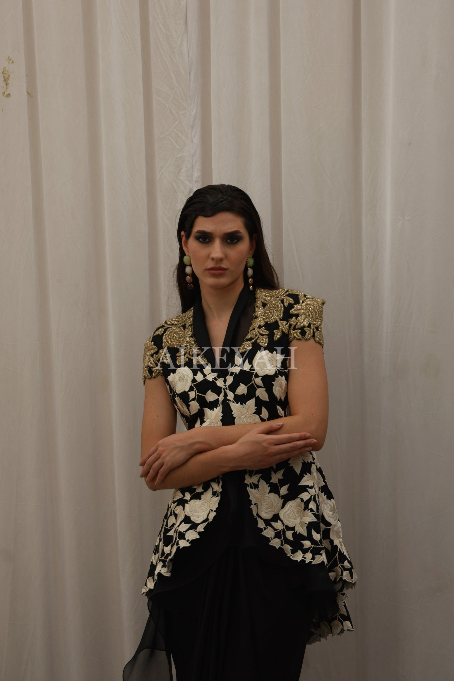 An embroidered signature jacket highlighted with gold / black embroidery, worn with an organza top and silk skirt.