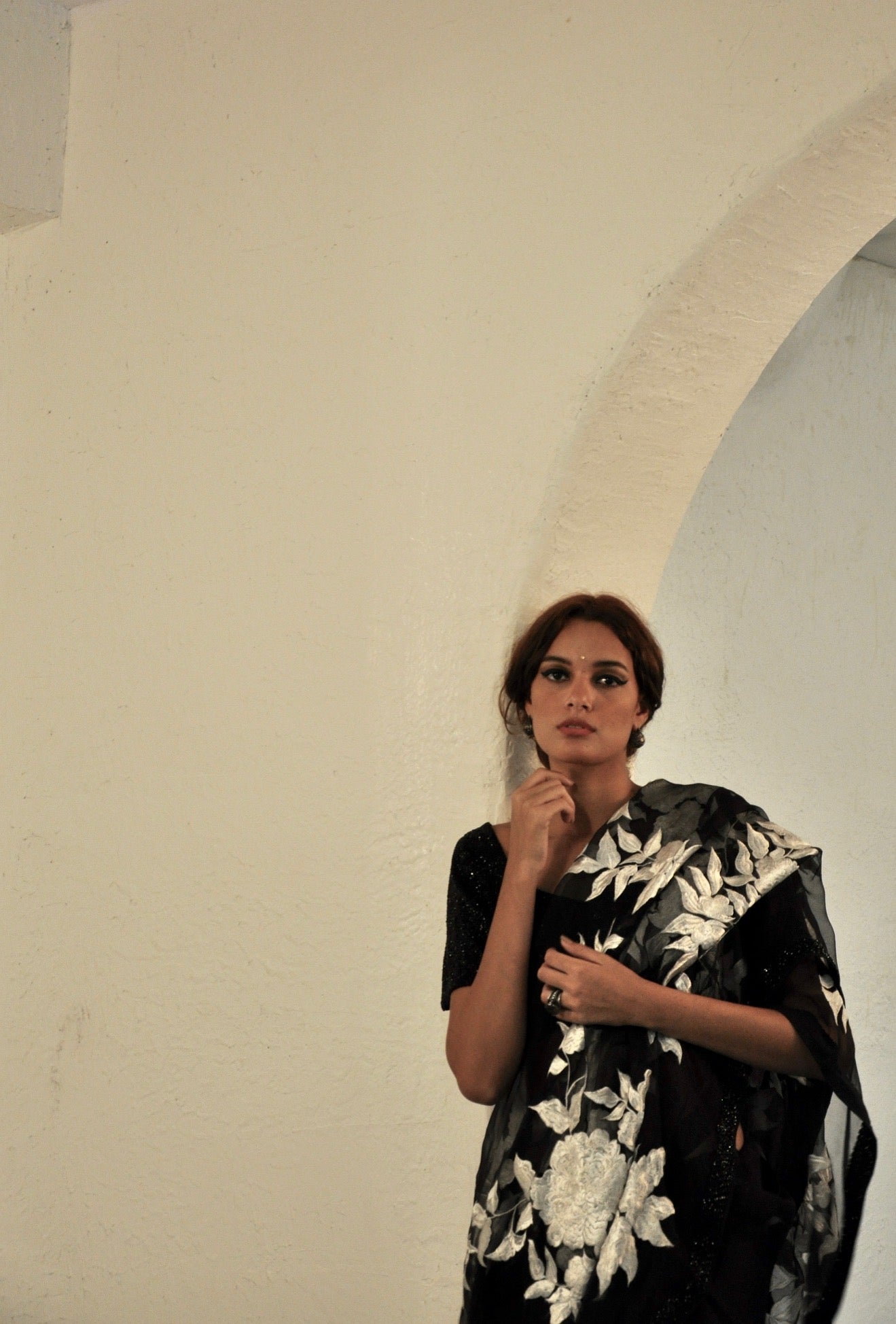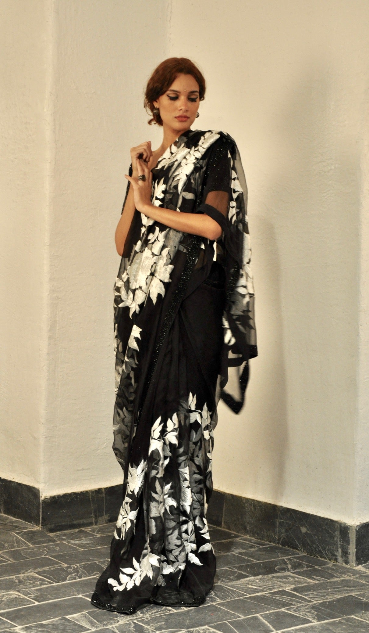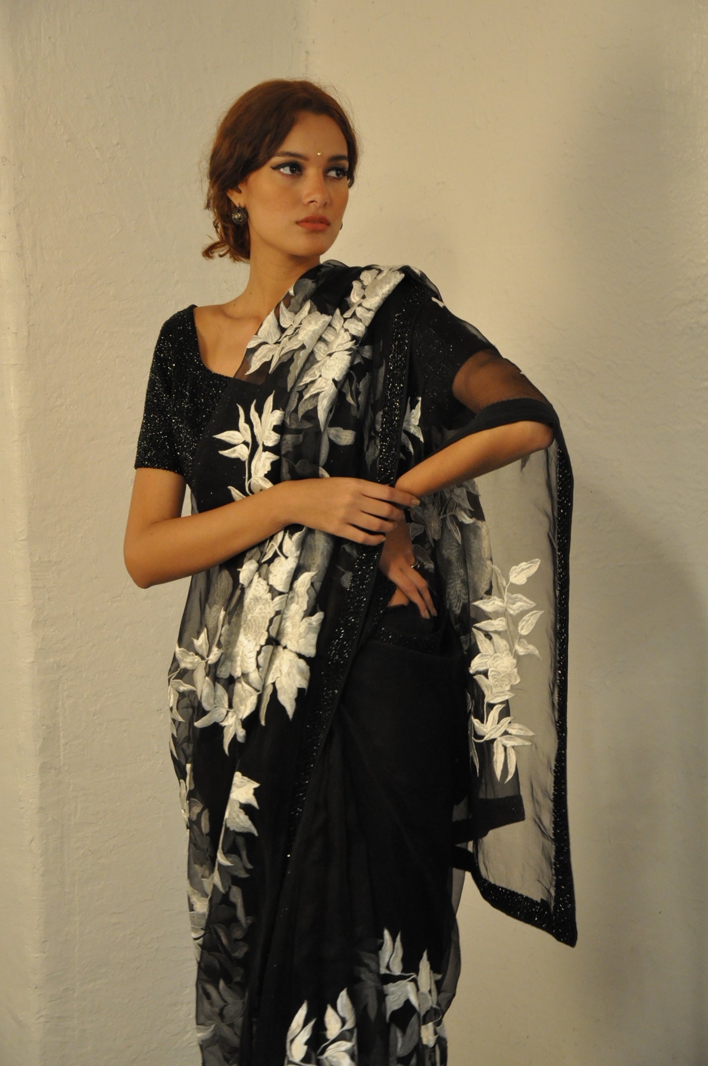 A fully embellished glass beads embroidered blouse is worn with a black organza sari thread embroidered in off white with borders highlighted with glass beads.