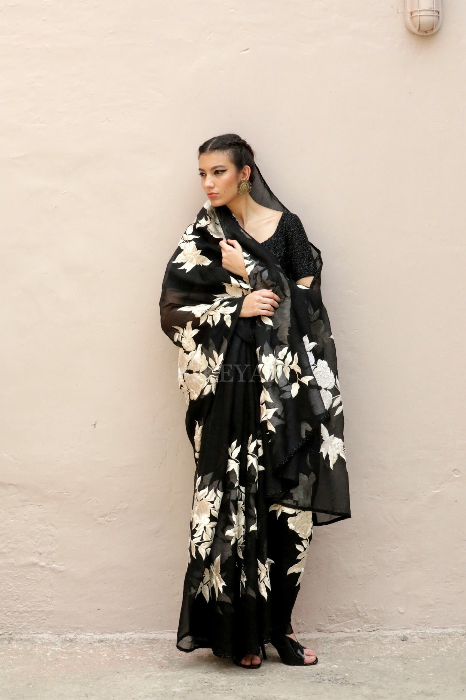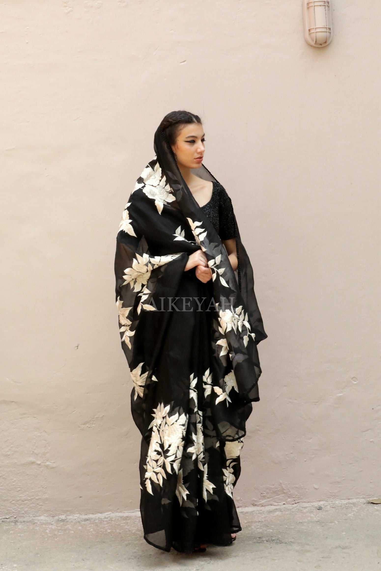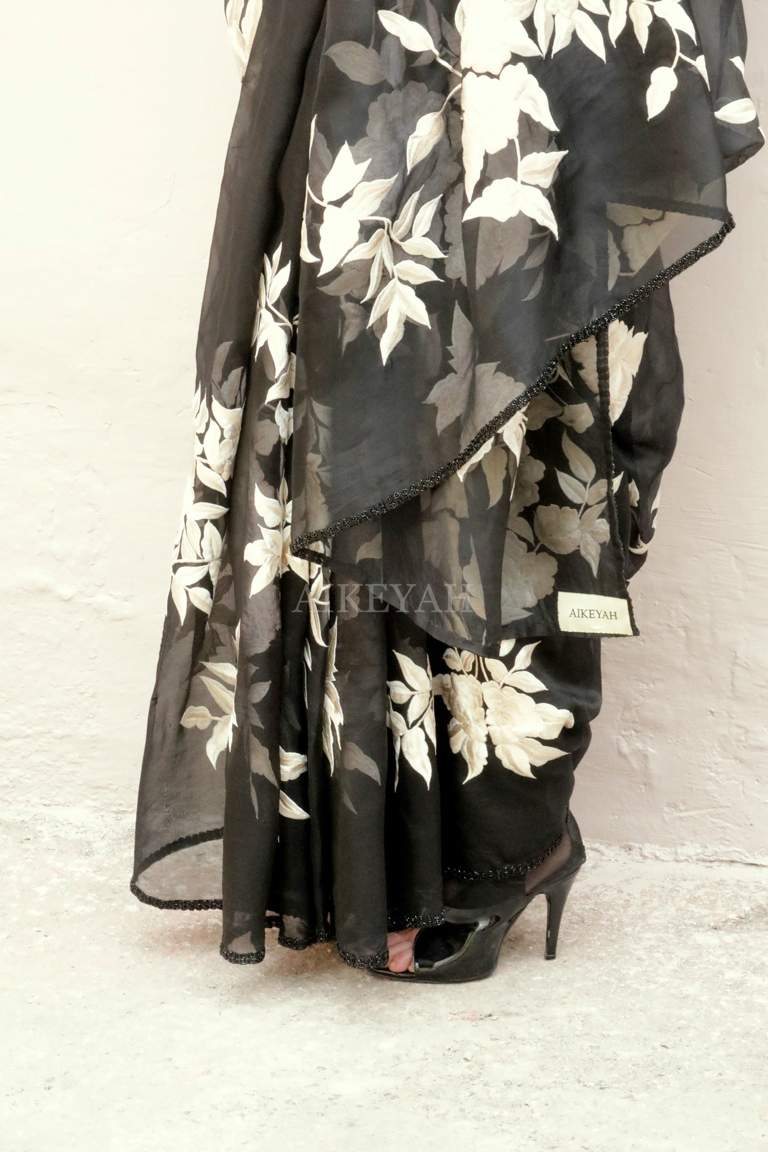 A fully embellished glass beads embroidered blouse is worn with a black organza sari thread embroidered in off white with borders highlighted with glass beads.