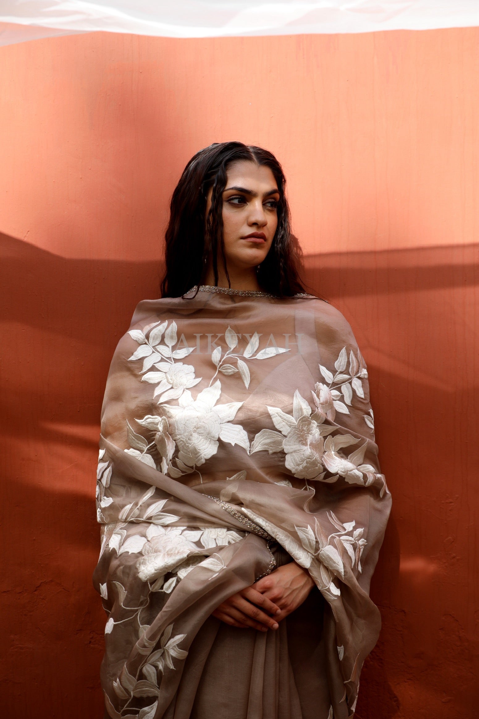 A Light grey organza sari thread embroidered with the edges highlighted in glass beads.