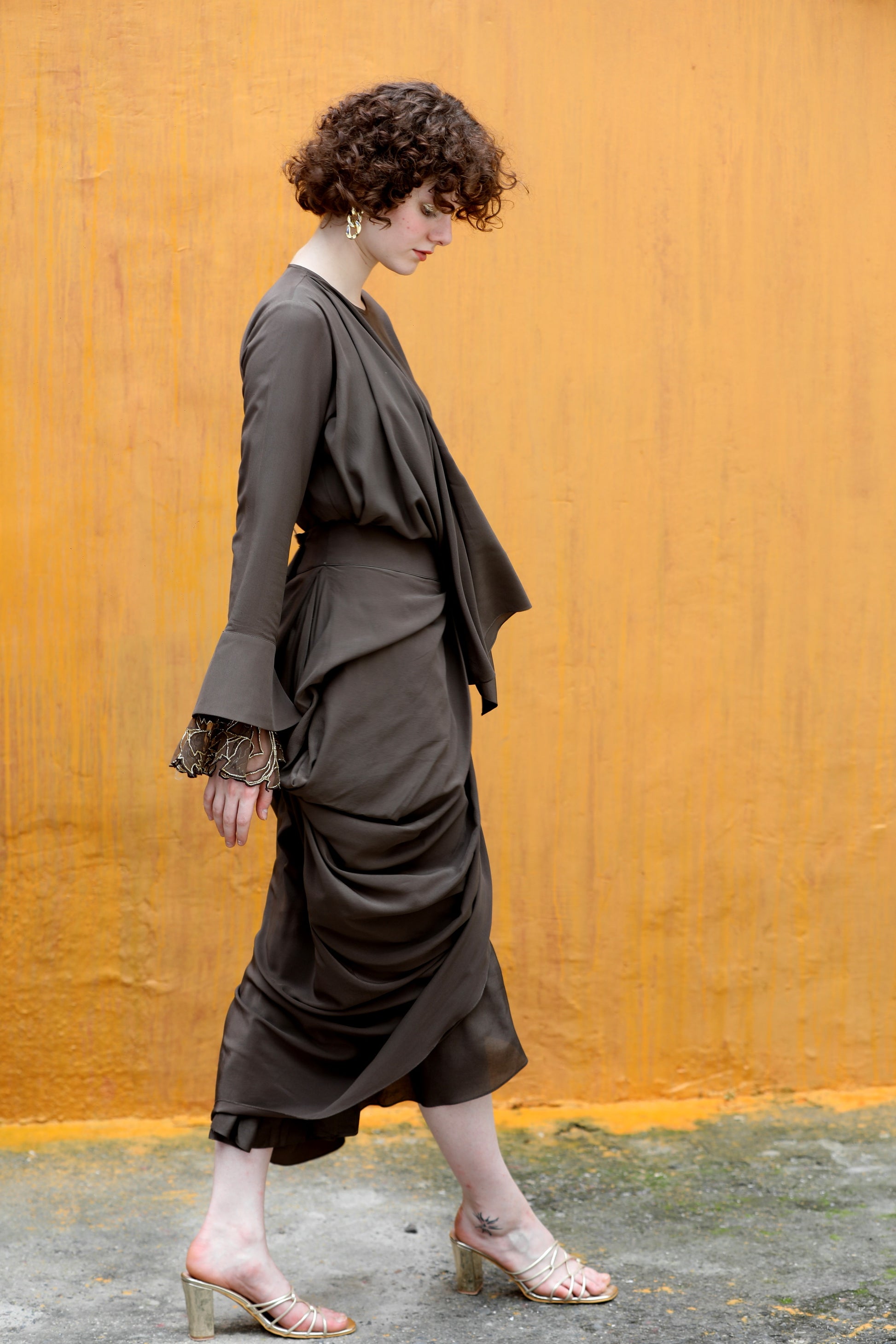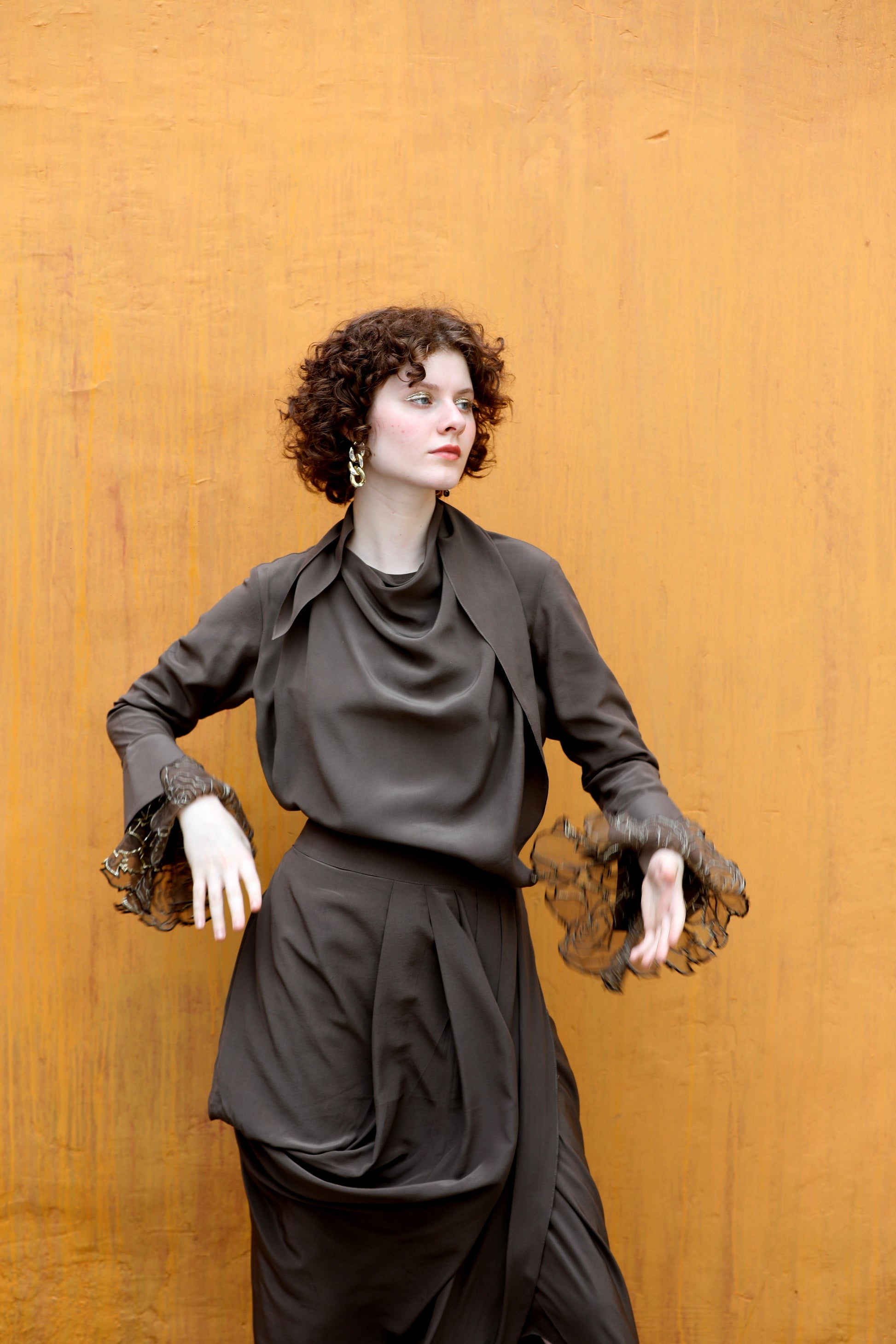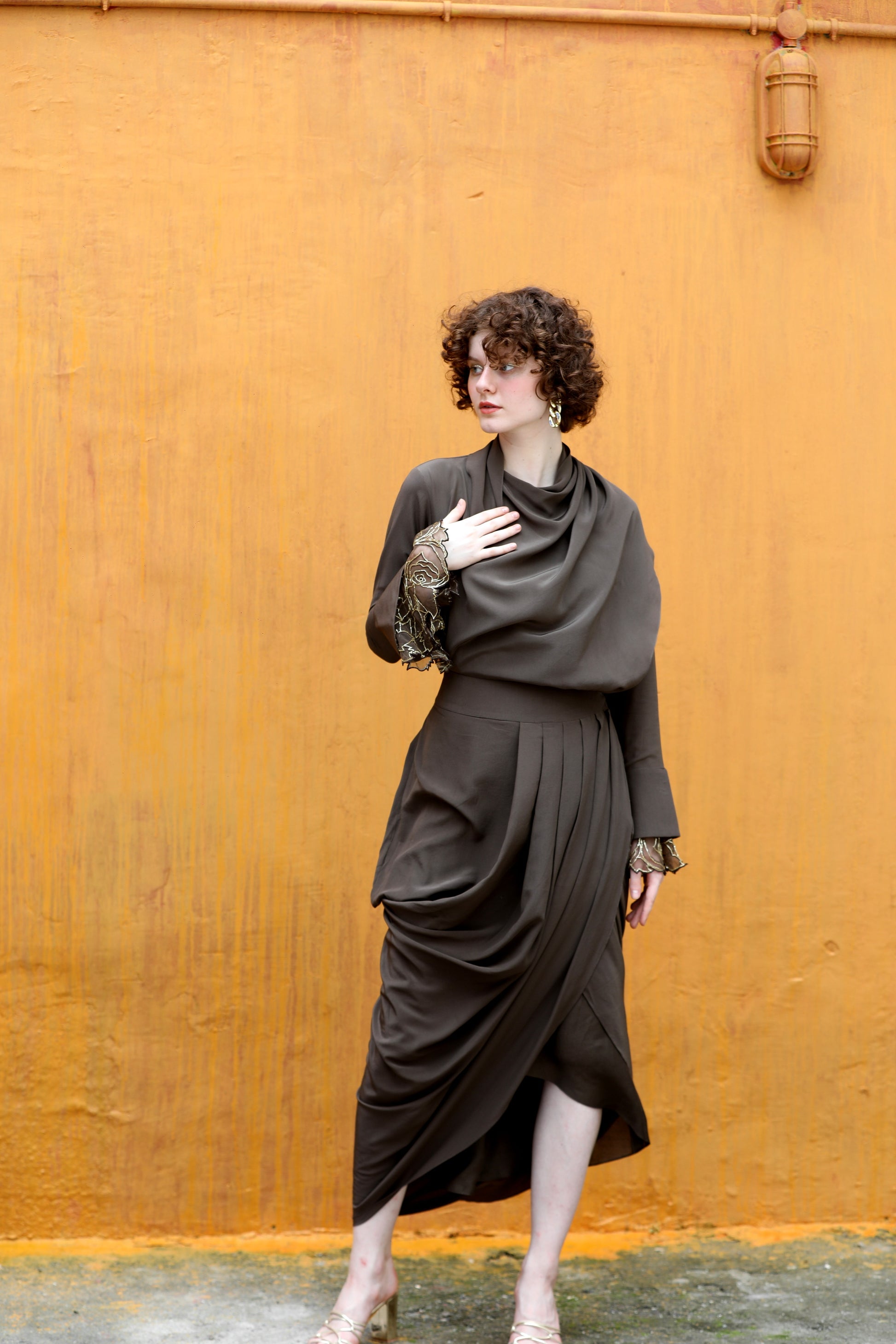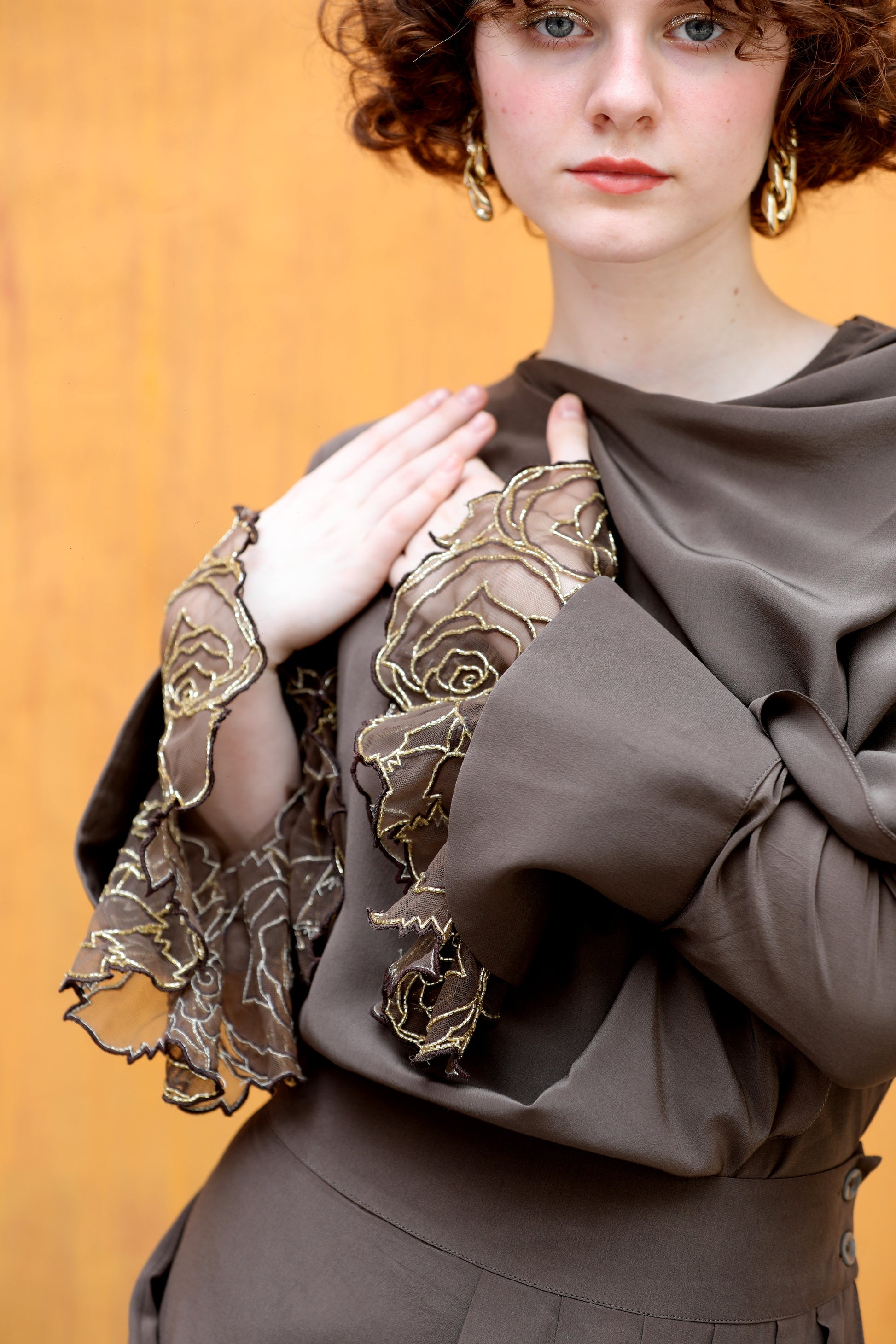 An Oxford Brown crepe draped top with Victorian era inspired sleeves highlighted with signature applique and gold glass beads, tucked in a crepe cowl skirt.