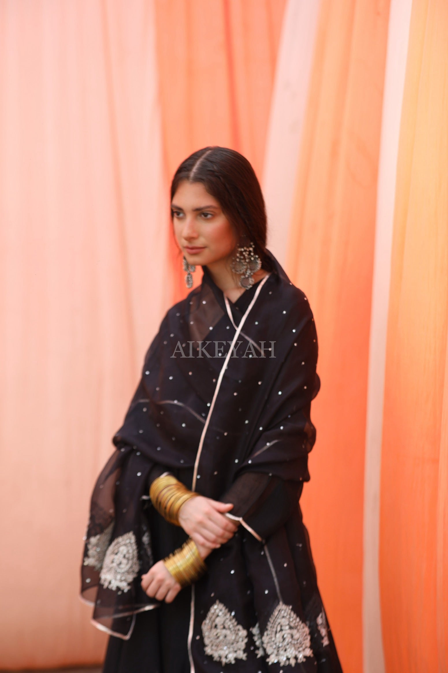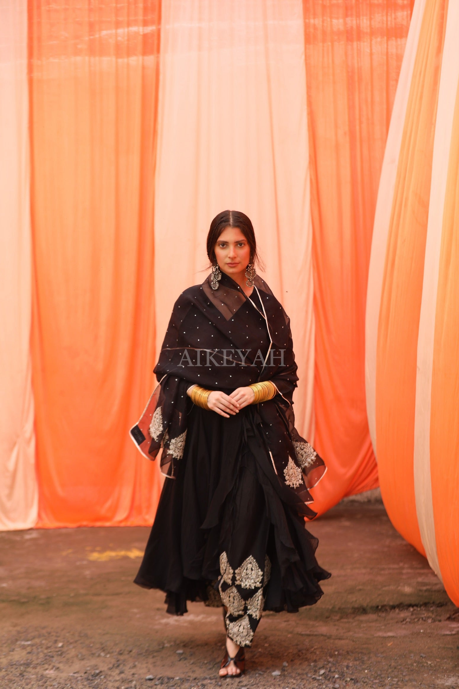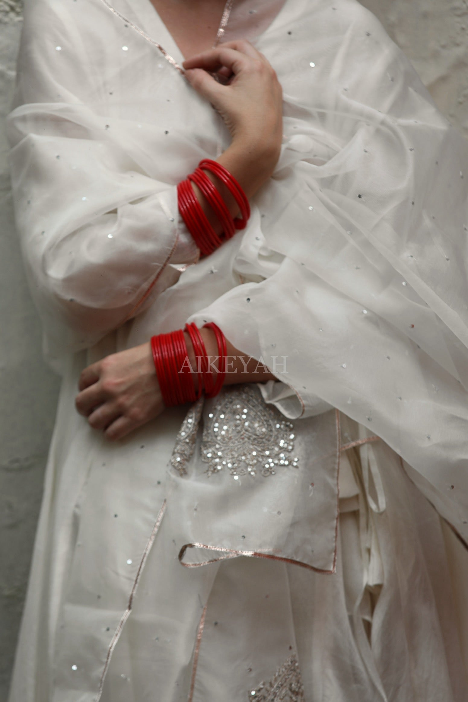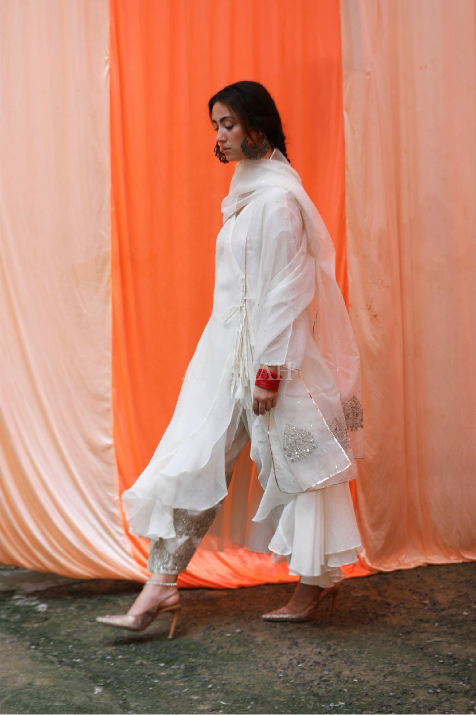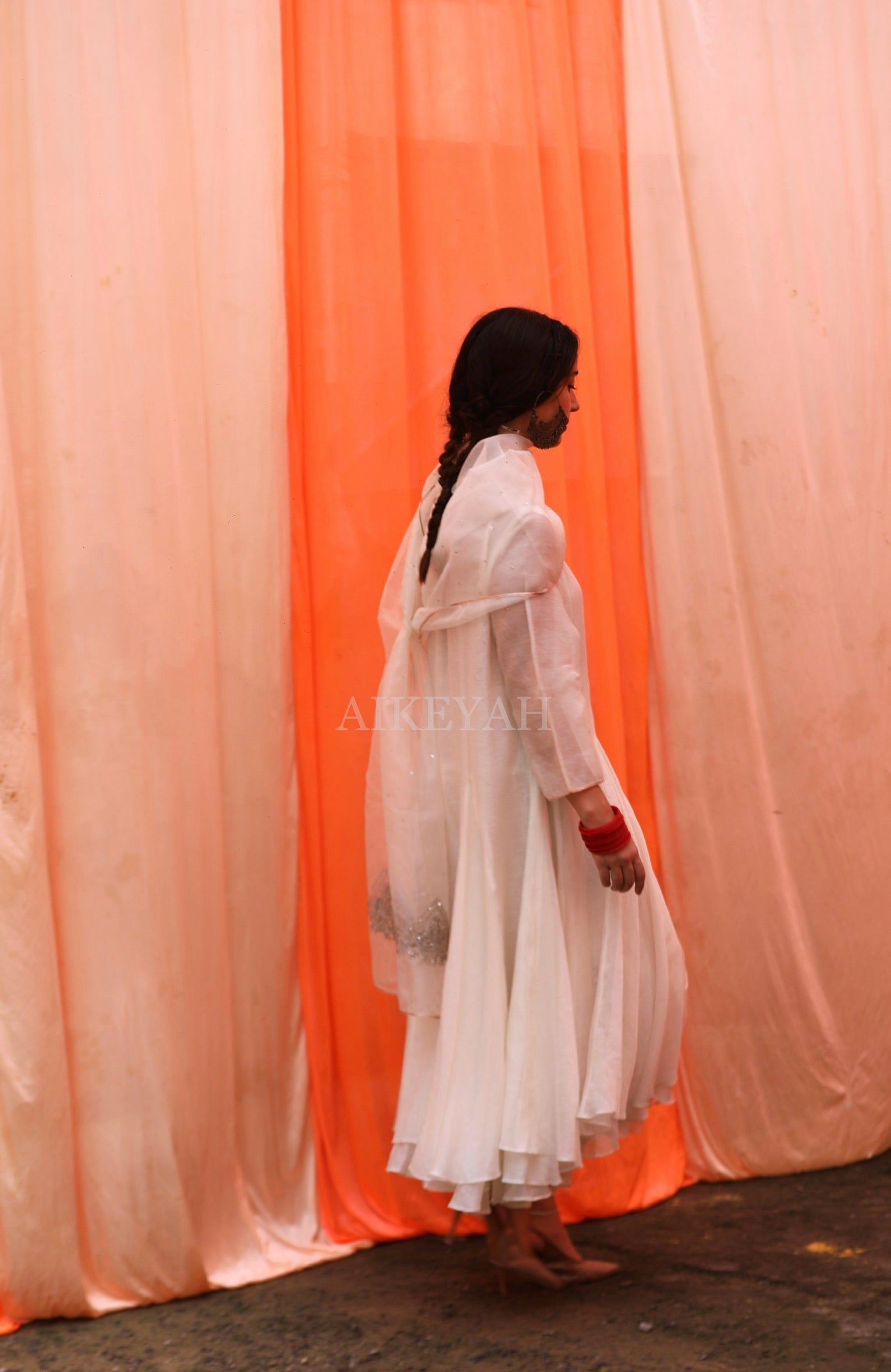 A Chanderi Kalidar worn with an embroidered salwar and an organza dupatta.