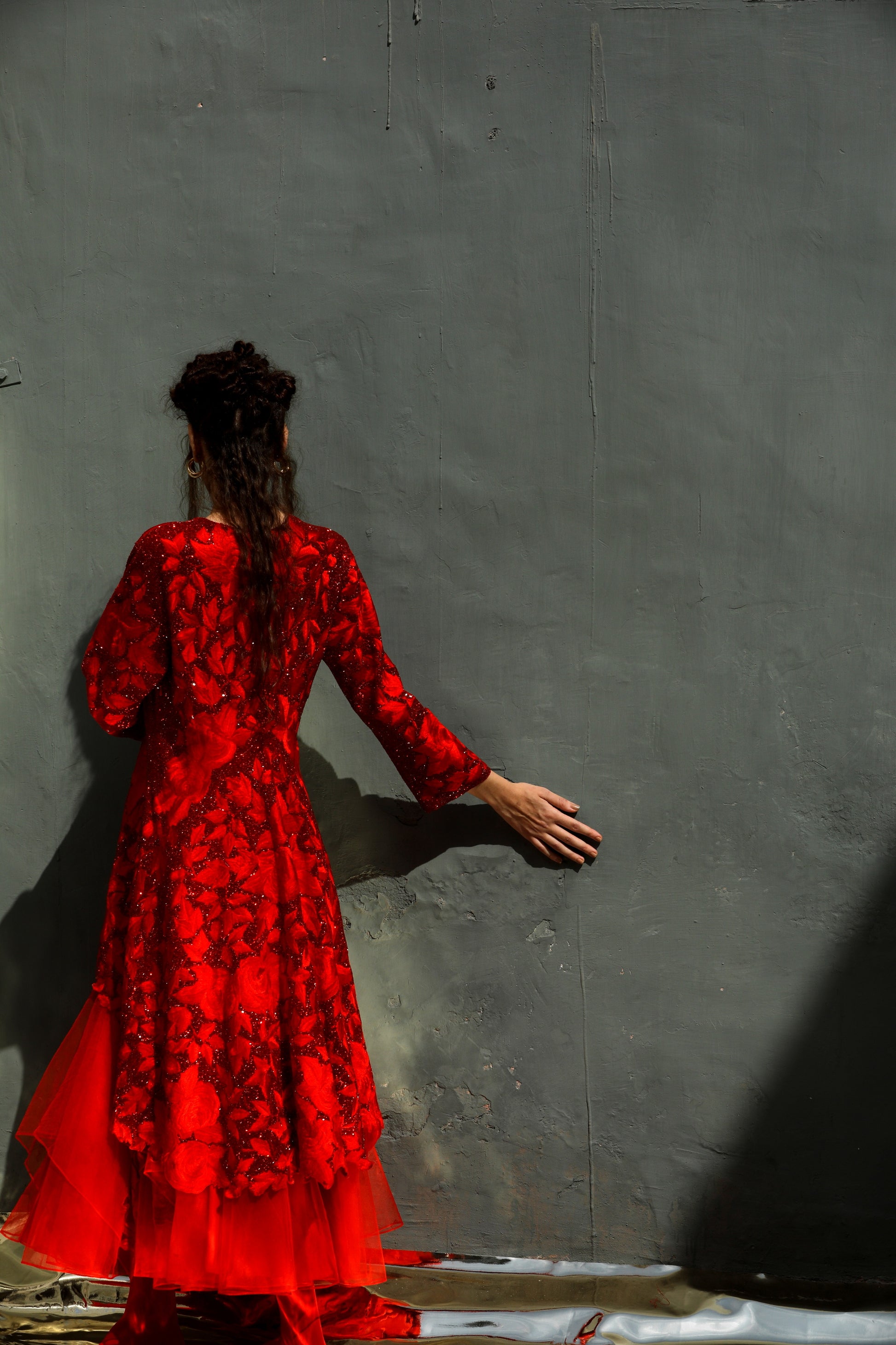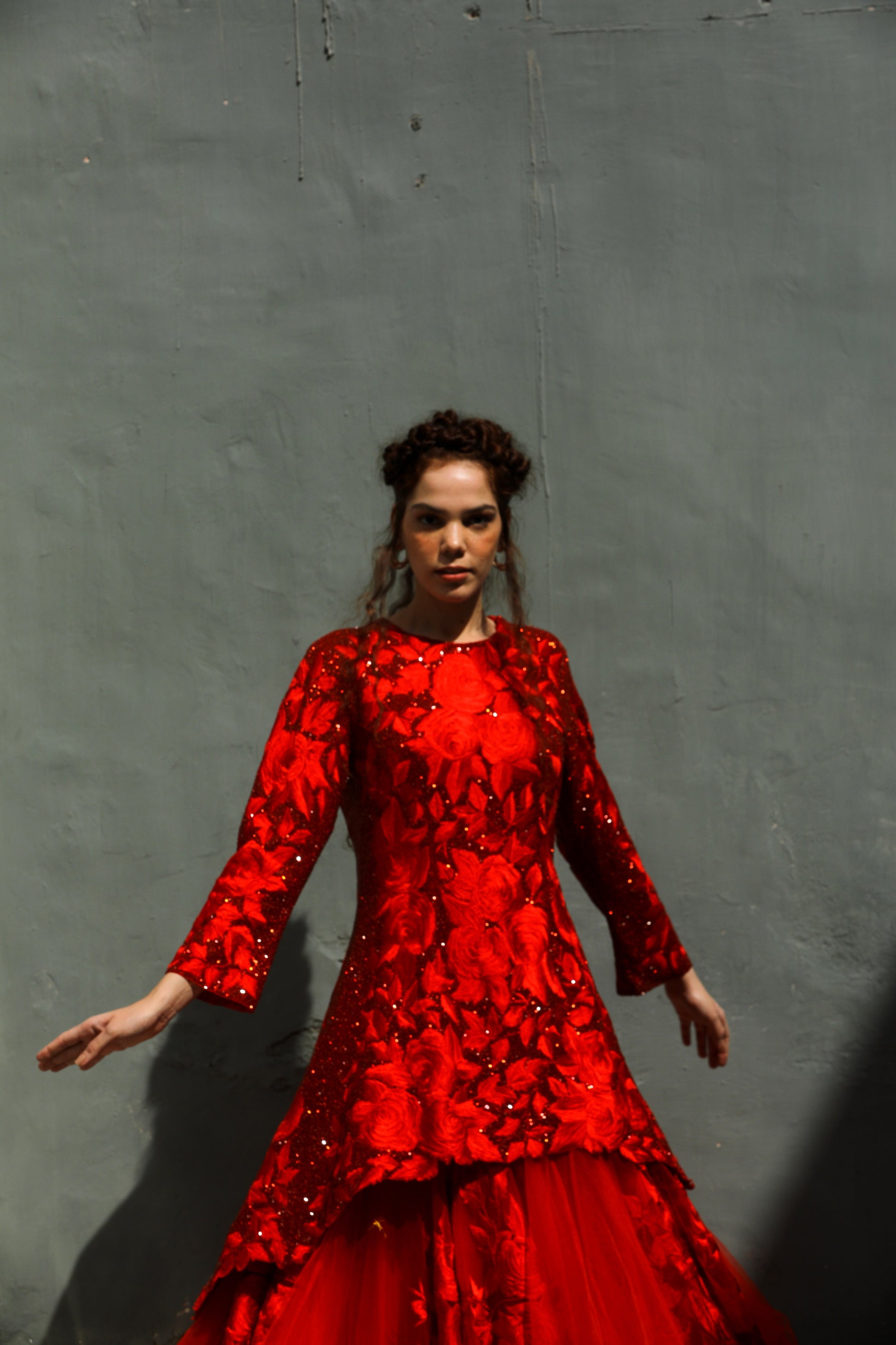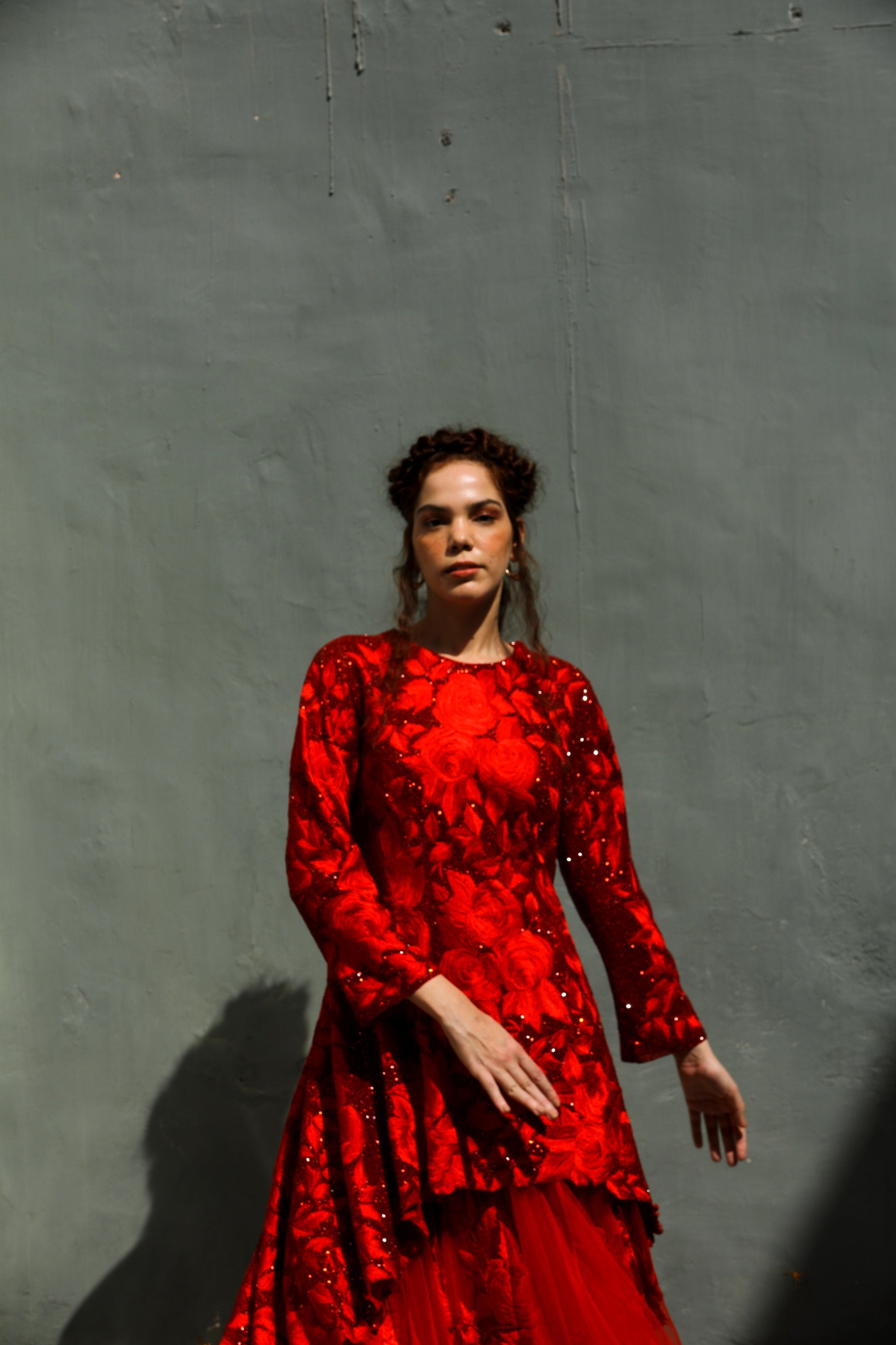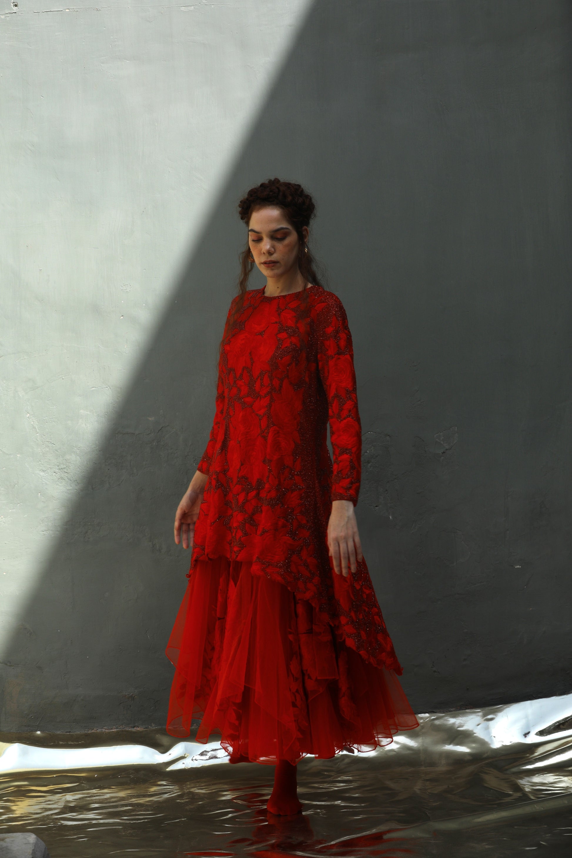 A red on red glass beads highlighted long and short kurta worn with a tulle embroidered skirt comes with a tulle dupatta