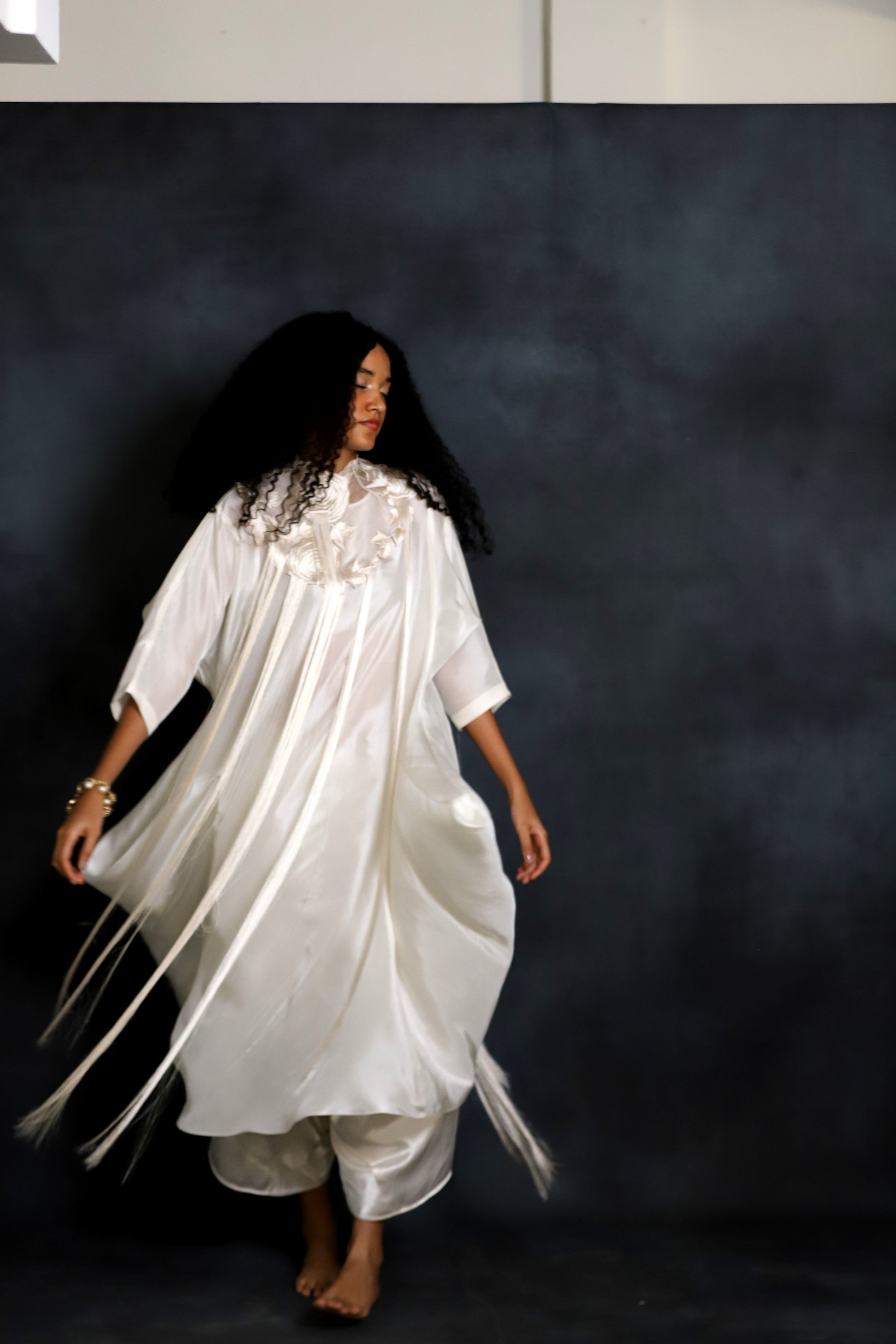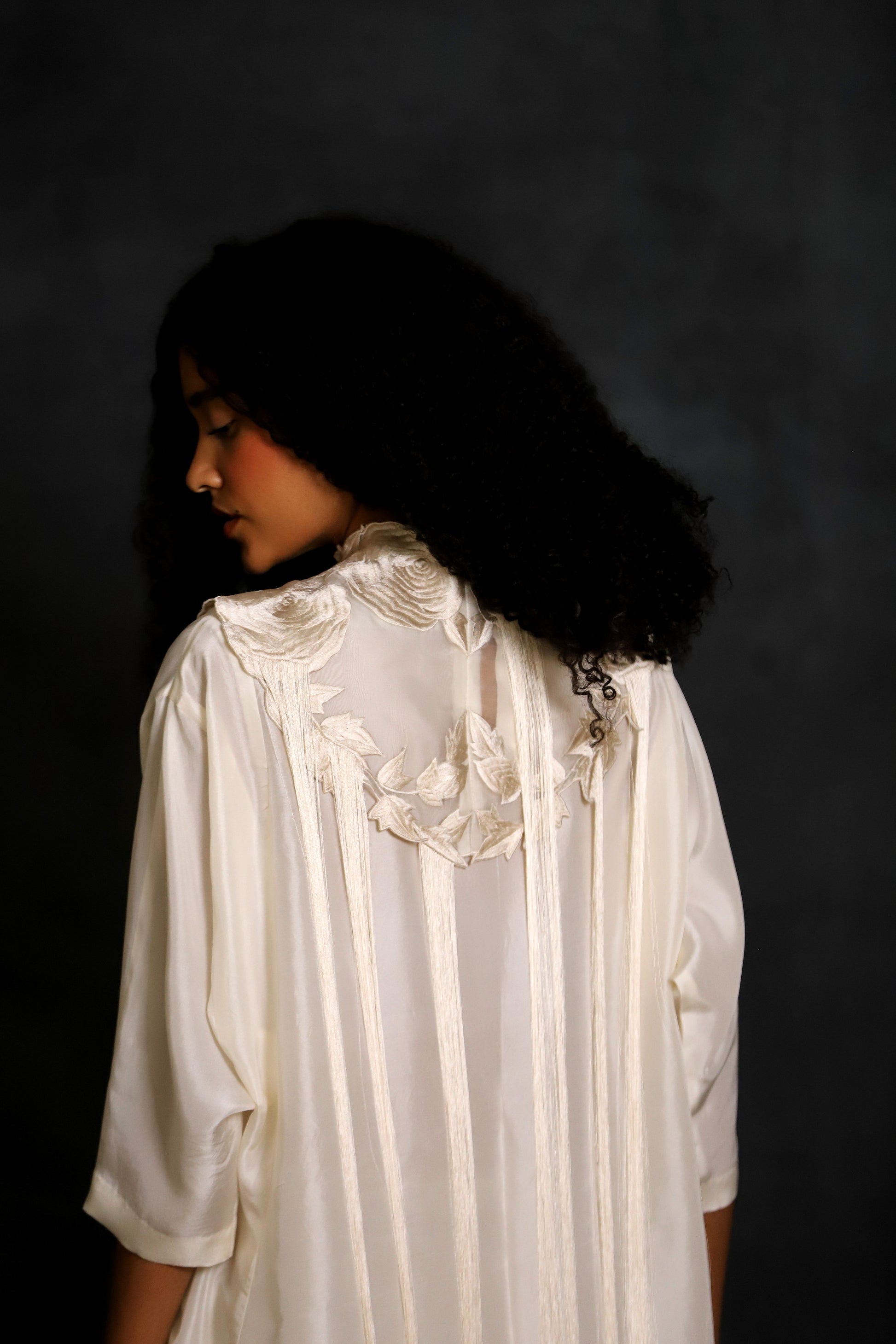 An Offwhite silk cowl kurta worn with mashru silk asymmetric pants adorned with an organza embroidered collar with thread hangings.