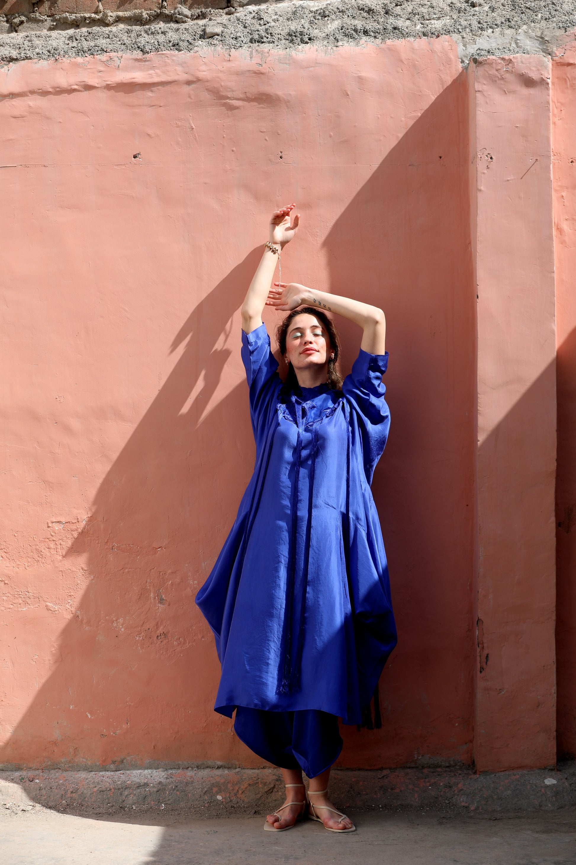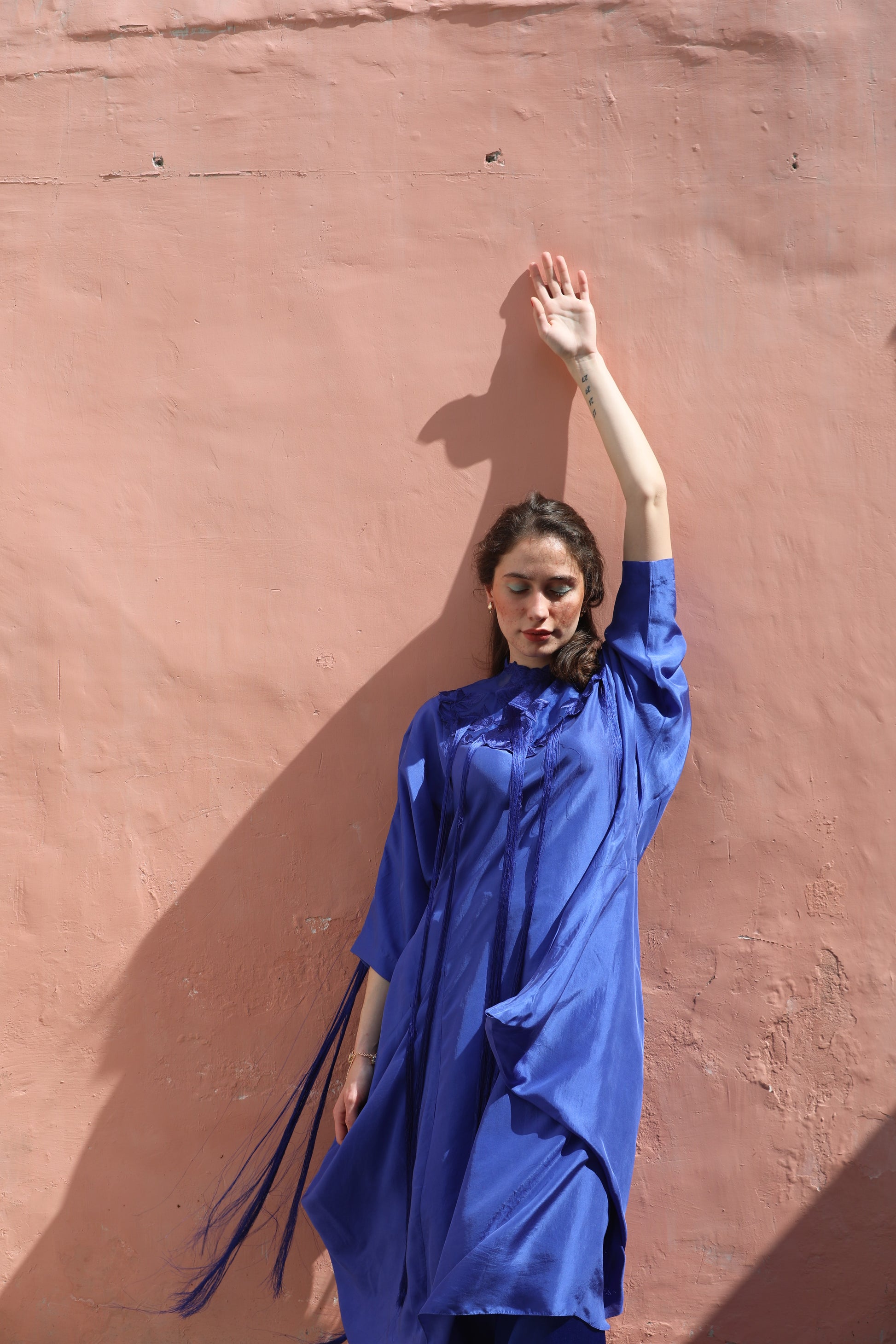 A Silk cowl kurta worn with mashru silk asymmetric pants adorned with an organza embroidered collar with thread hangings.