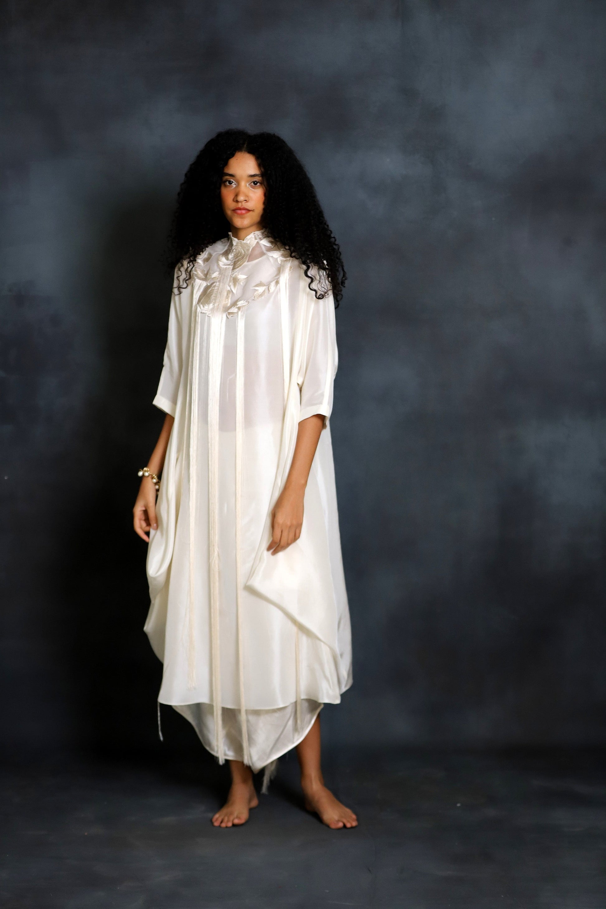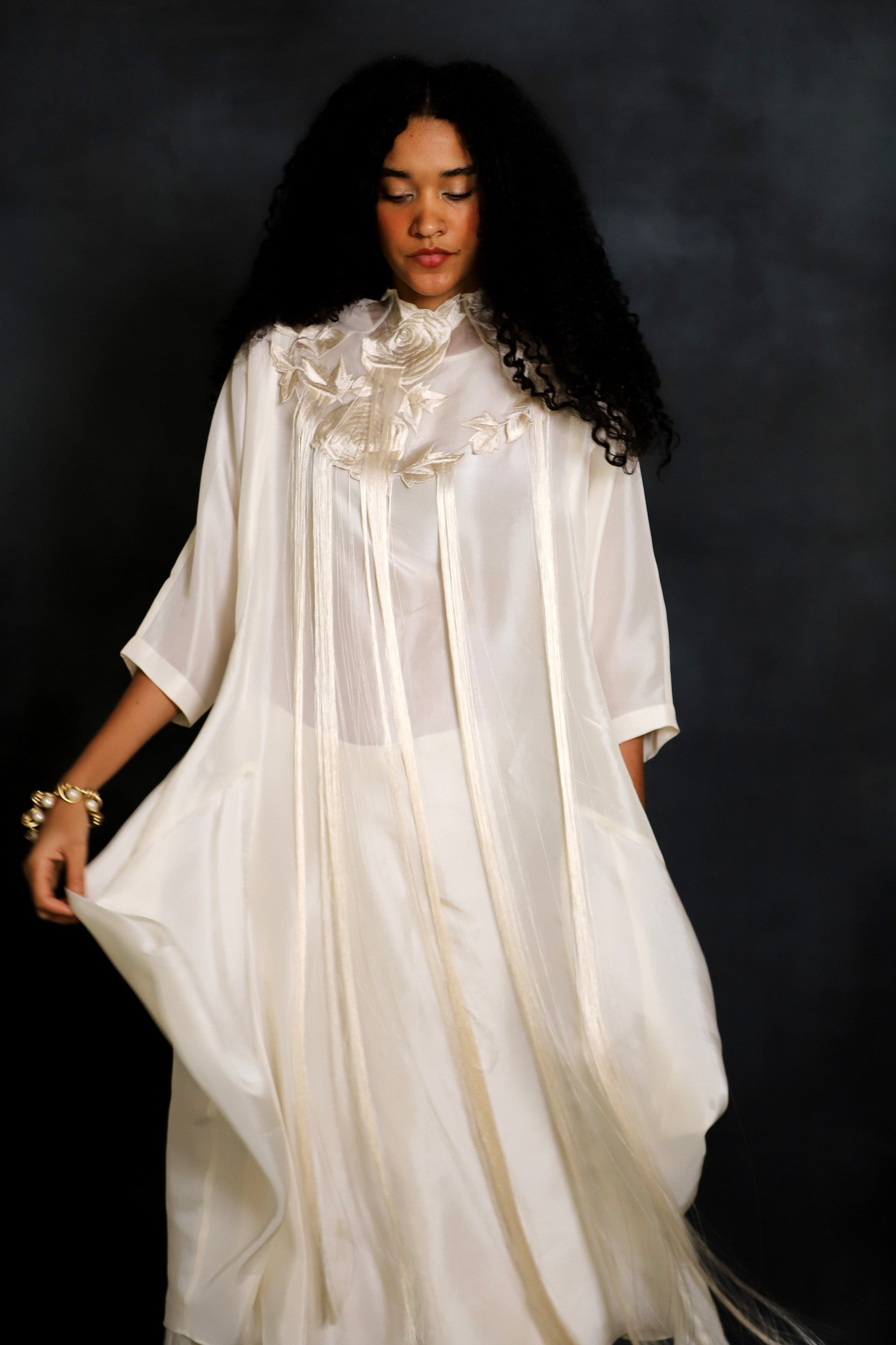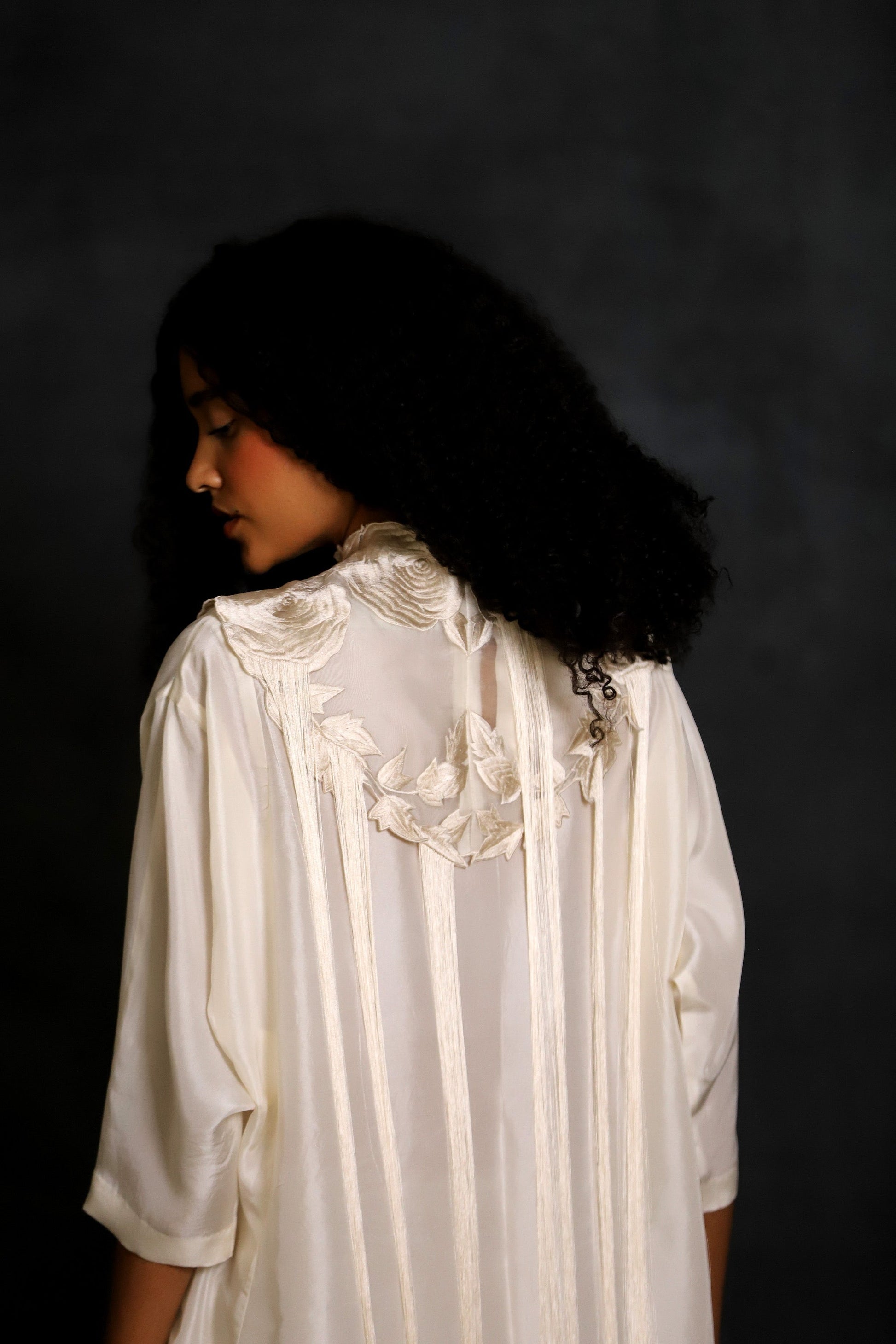 An organza embroidered collar with thread hangings.