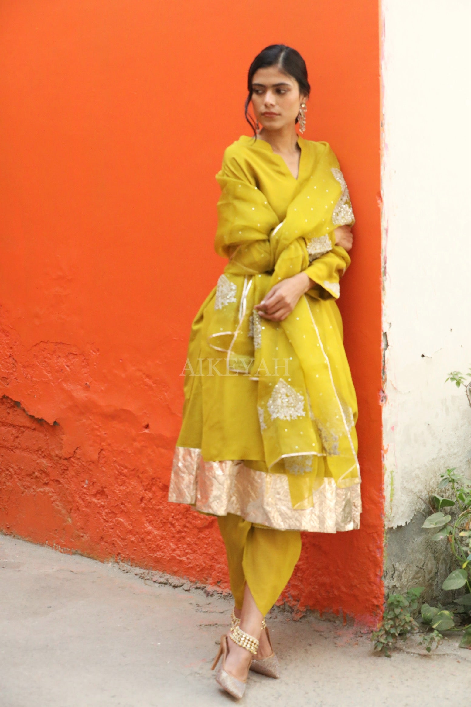 A silk tunic worn with signature ghagra dhoti highlighted with gota and an embroidered dupatta.
