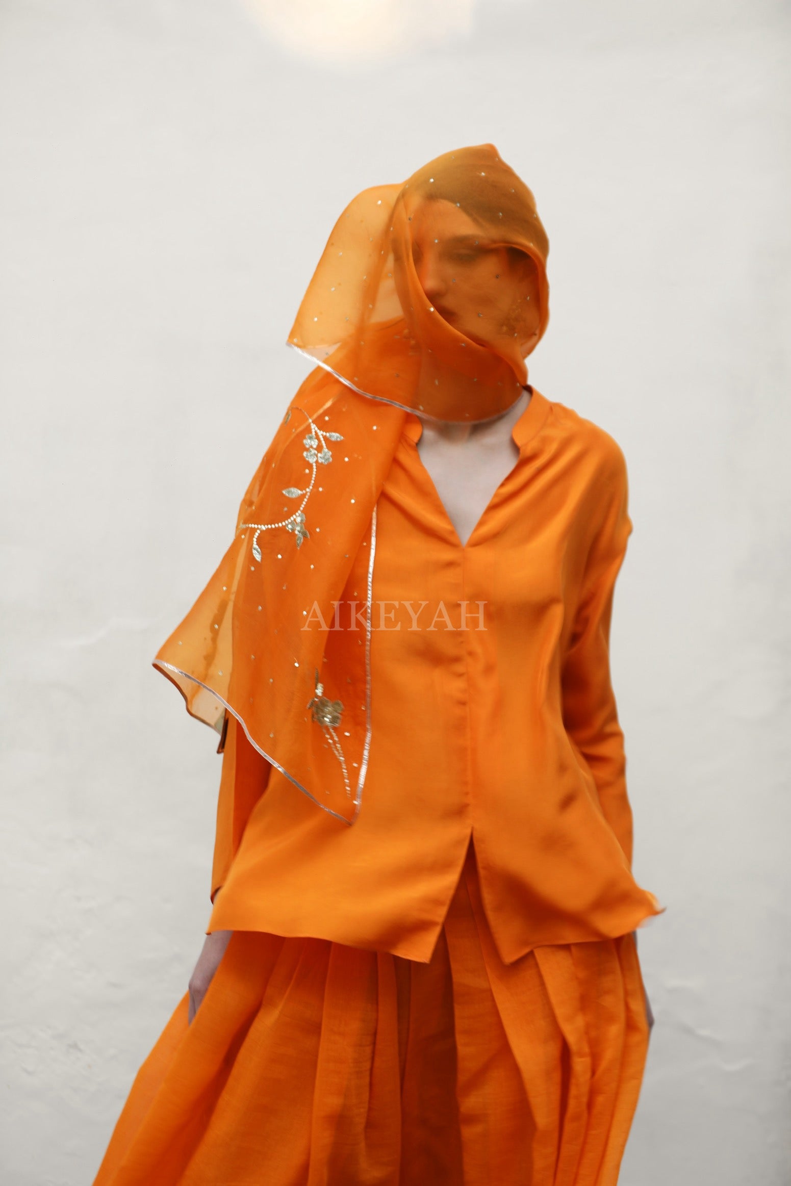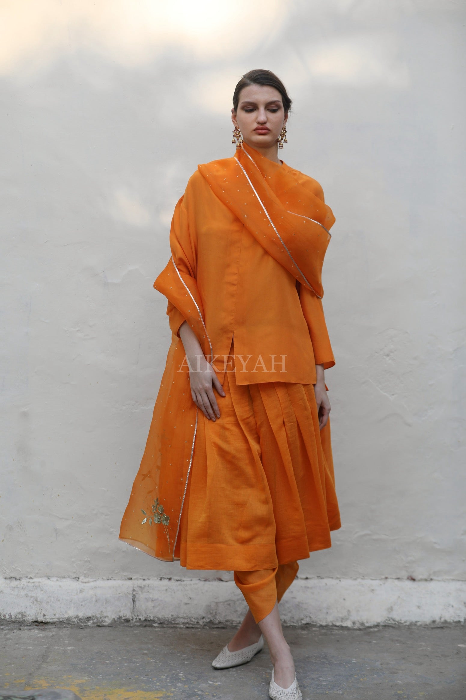 A silk tunic worn with signature ghagra dhoti and an embroidered dupatta.