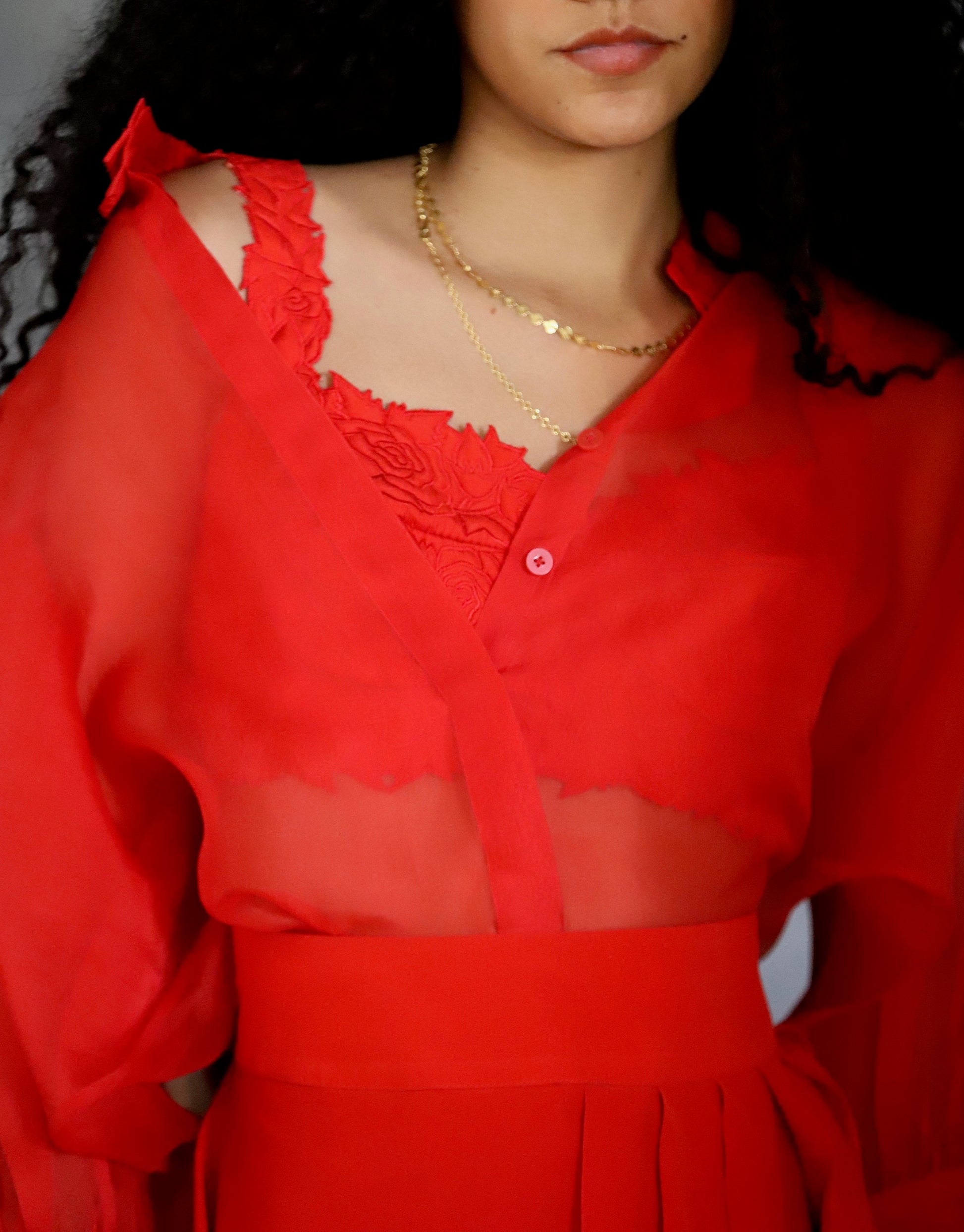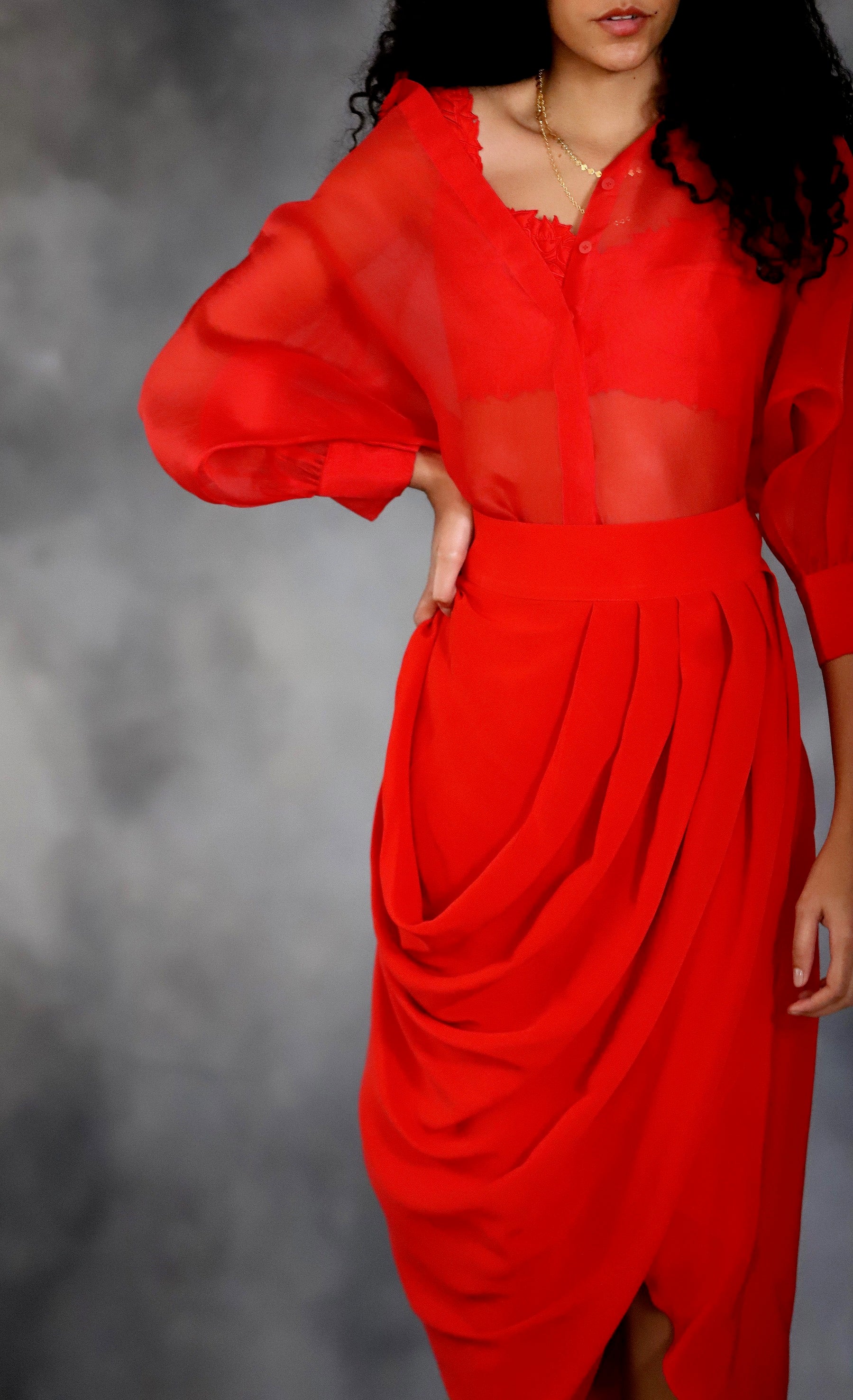 An organza shirt worn with a quilted silk bralette clubbed with a crepe cowl skirt.