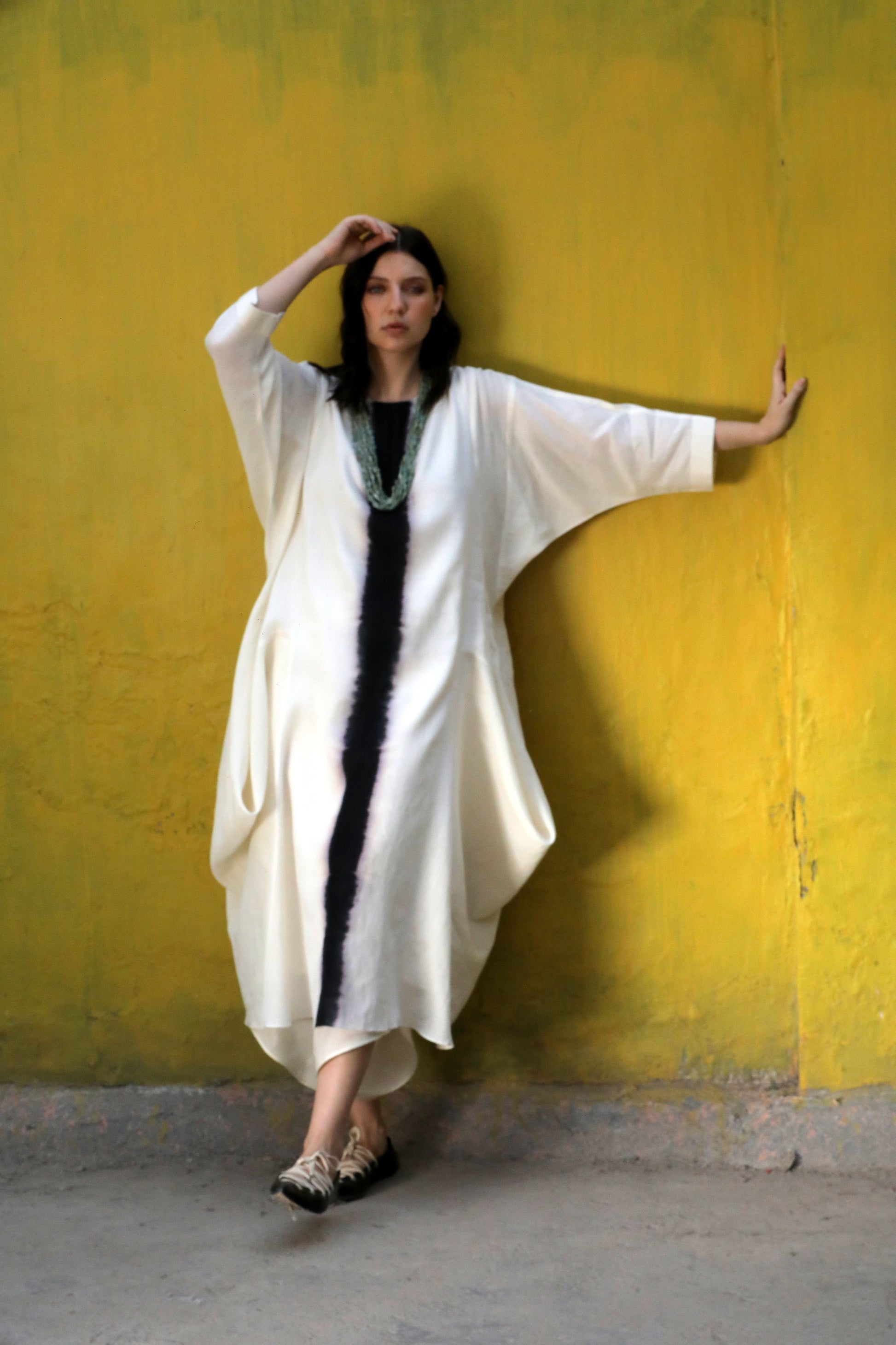 A Cotton kaftan in Offwhite with shibori in black worn with asymmetric Shantung signature low crotch pants.