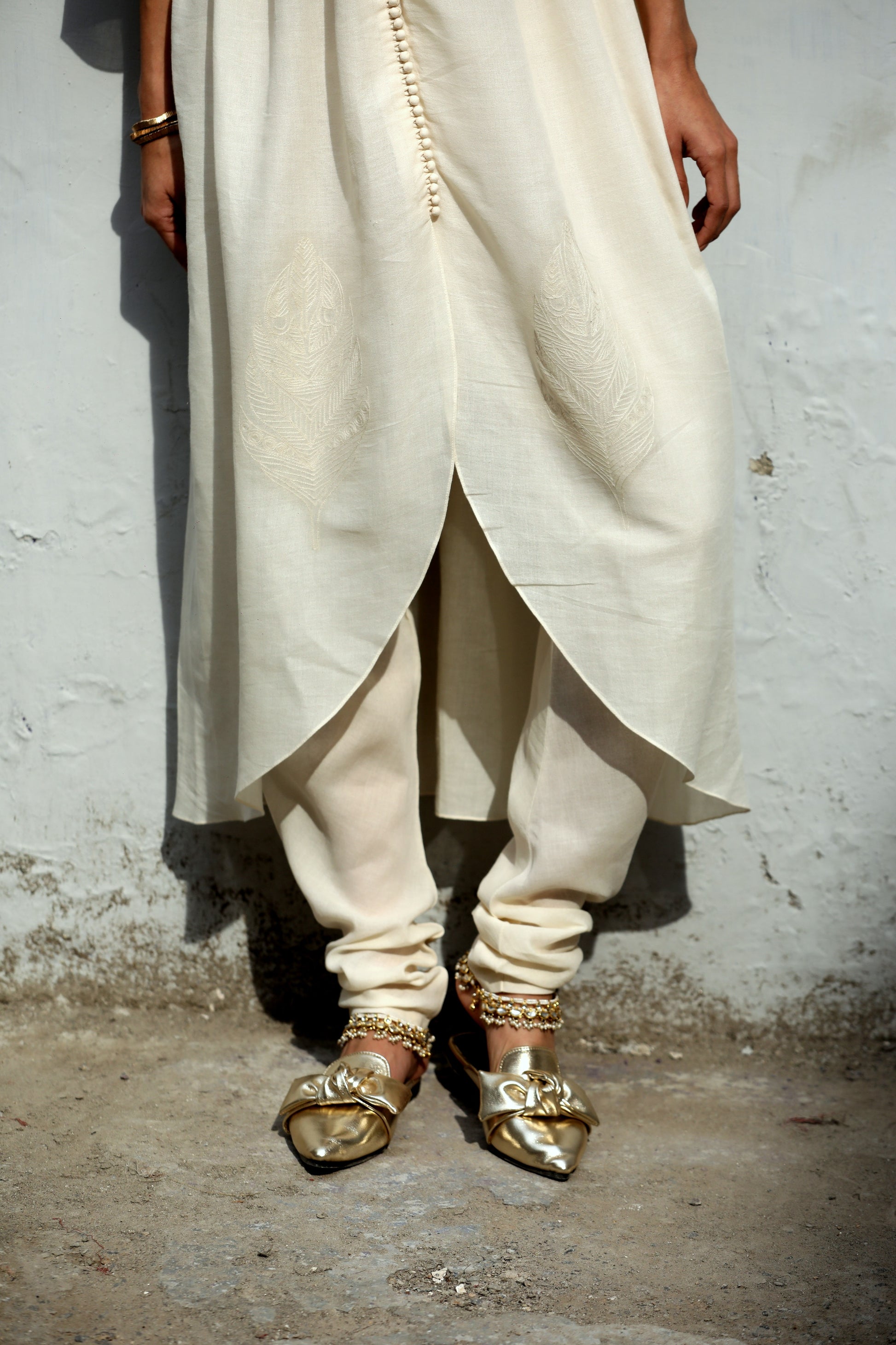 'Dogri Suthan' is a roomy churidar, a comfortable silhouette around the knees ending with gathers at the ankles.