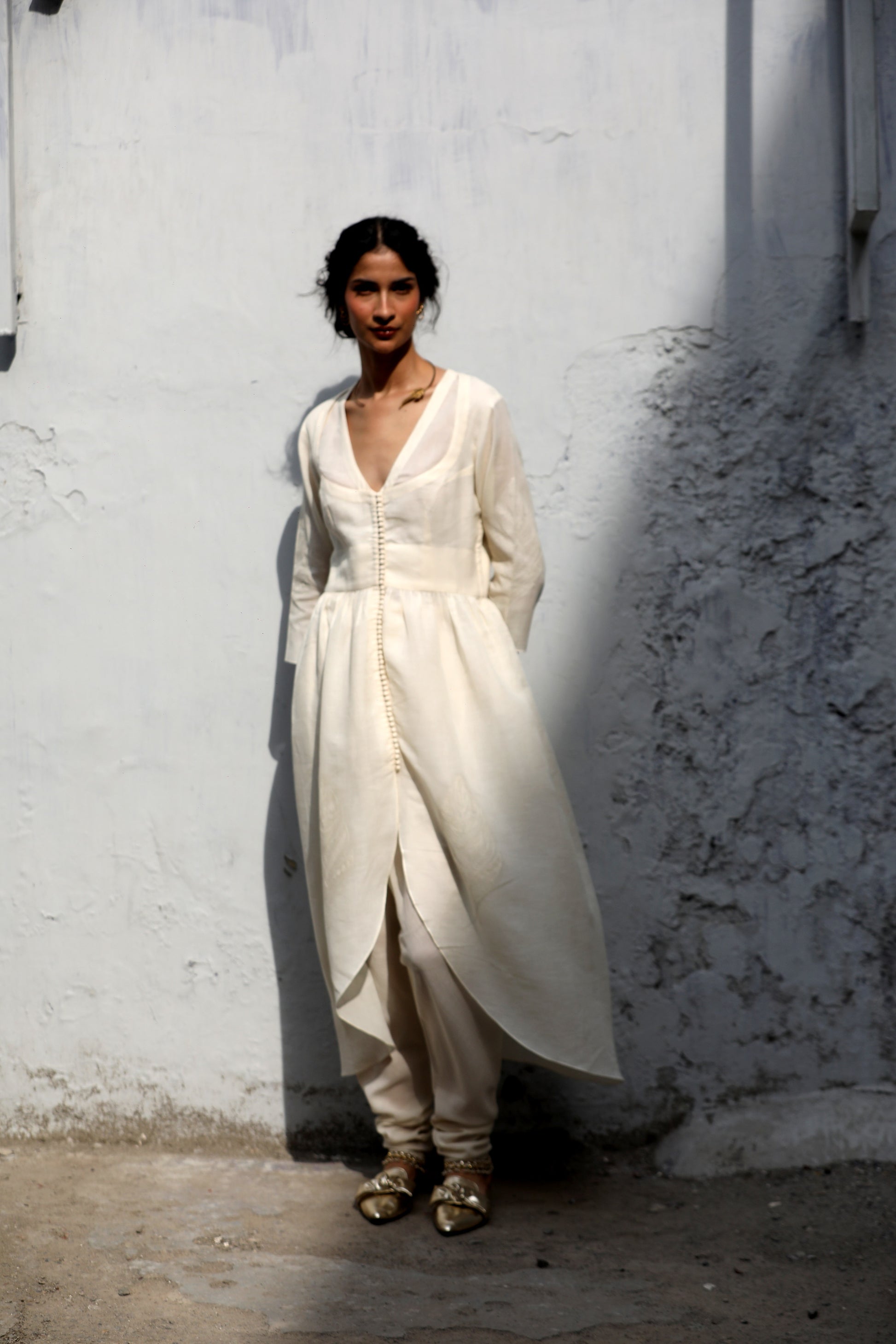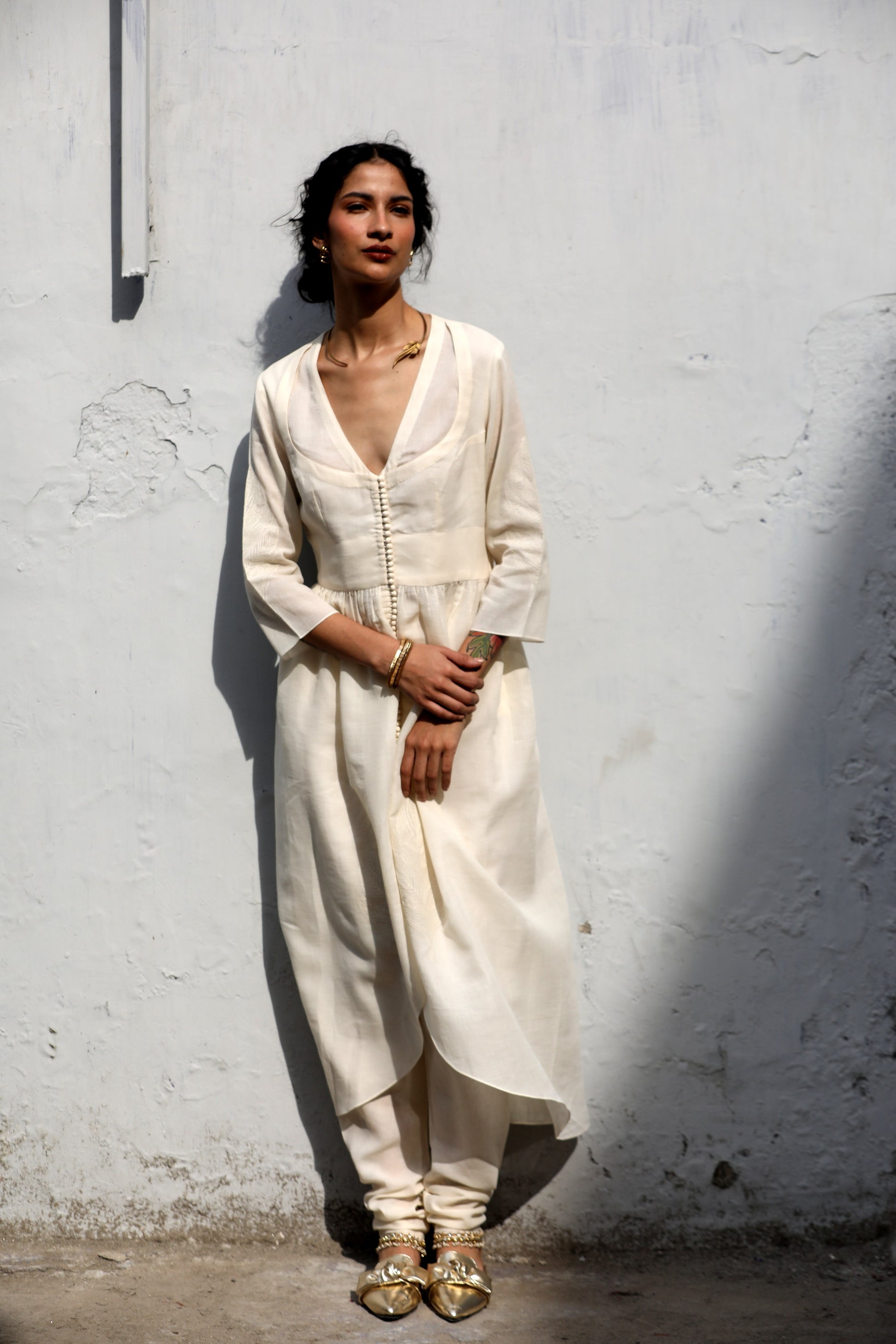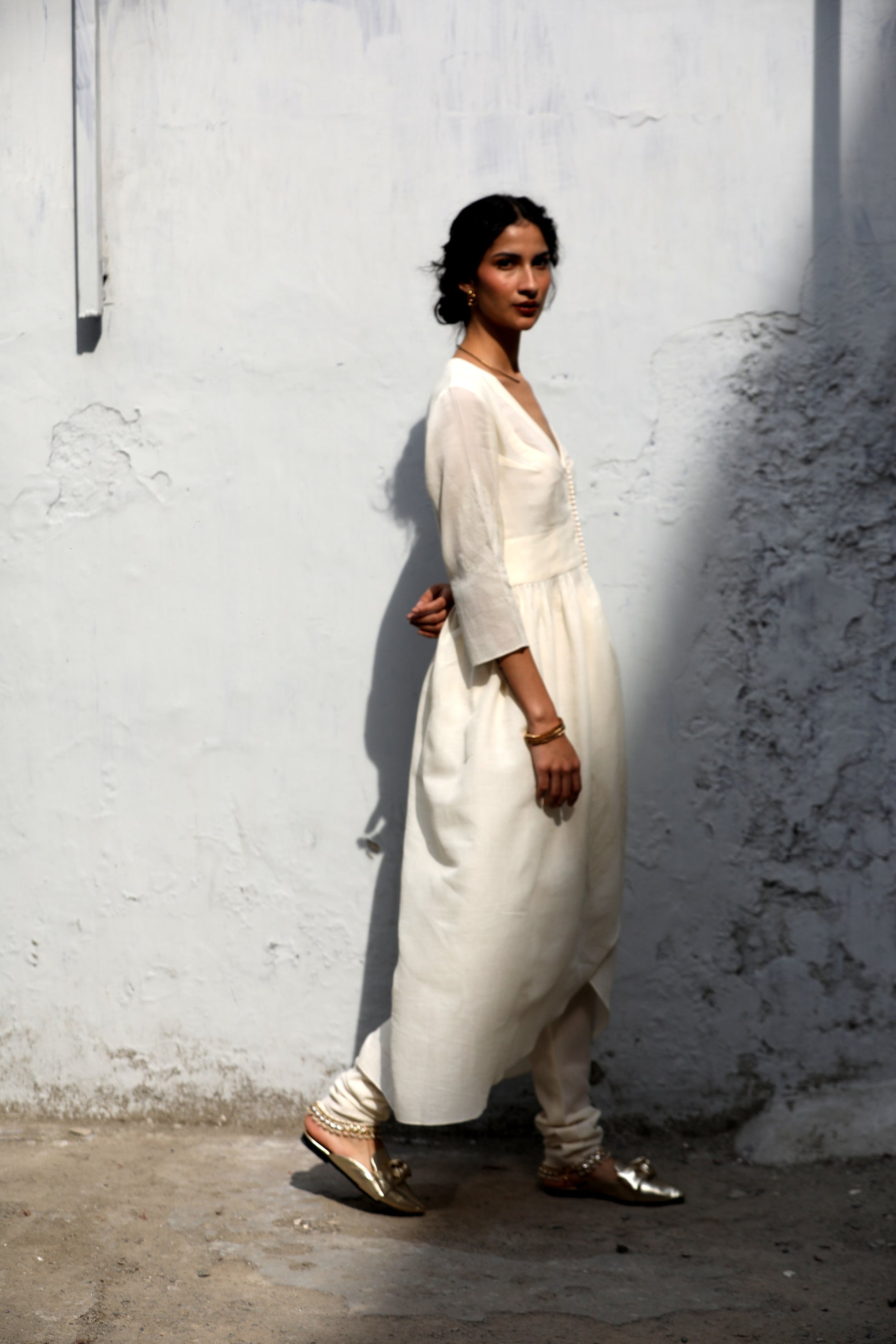 A cotton button down kurta worn with a 'dogri'.
