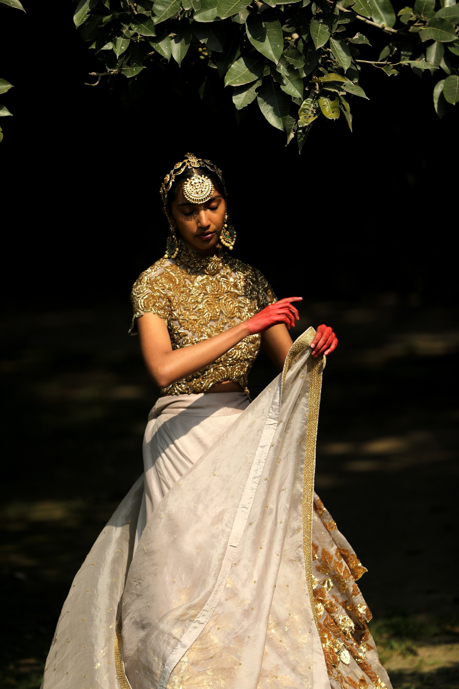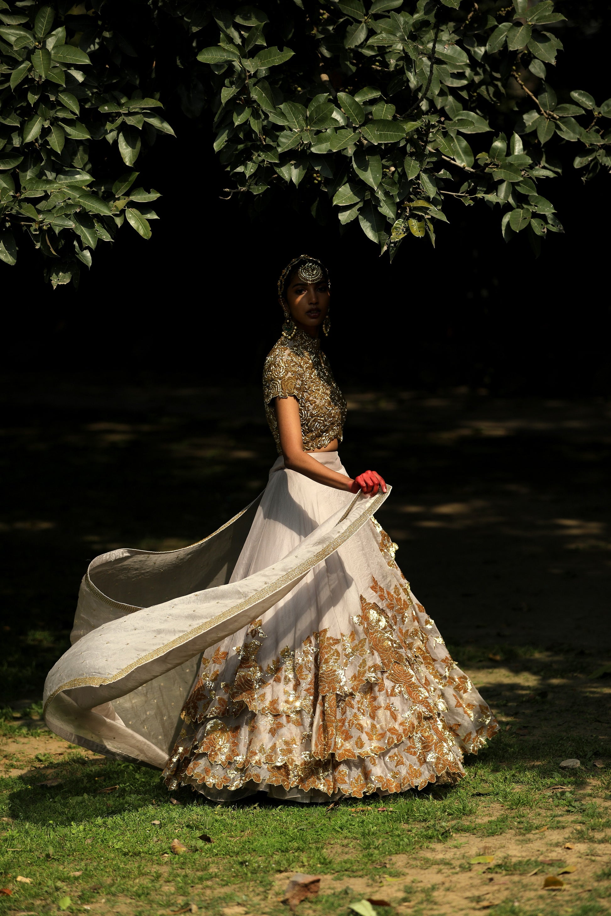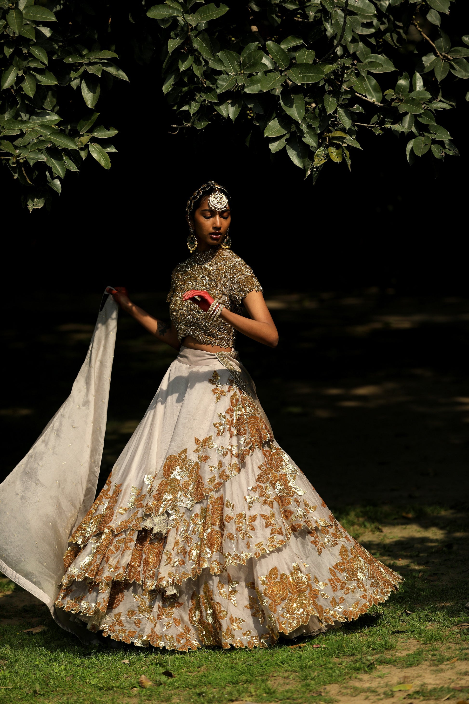 Layers of Organza in light grey embroidered in gold sequins worn with a gold embroidered choli and an organza dupatta.