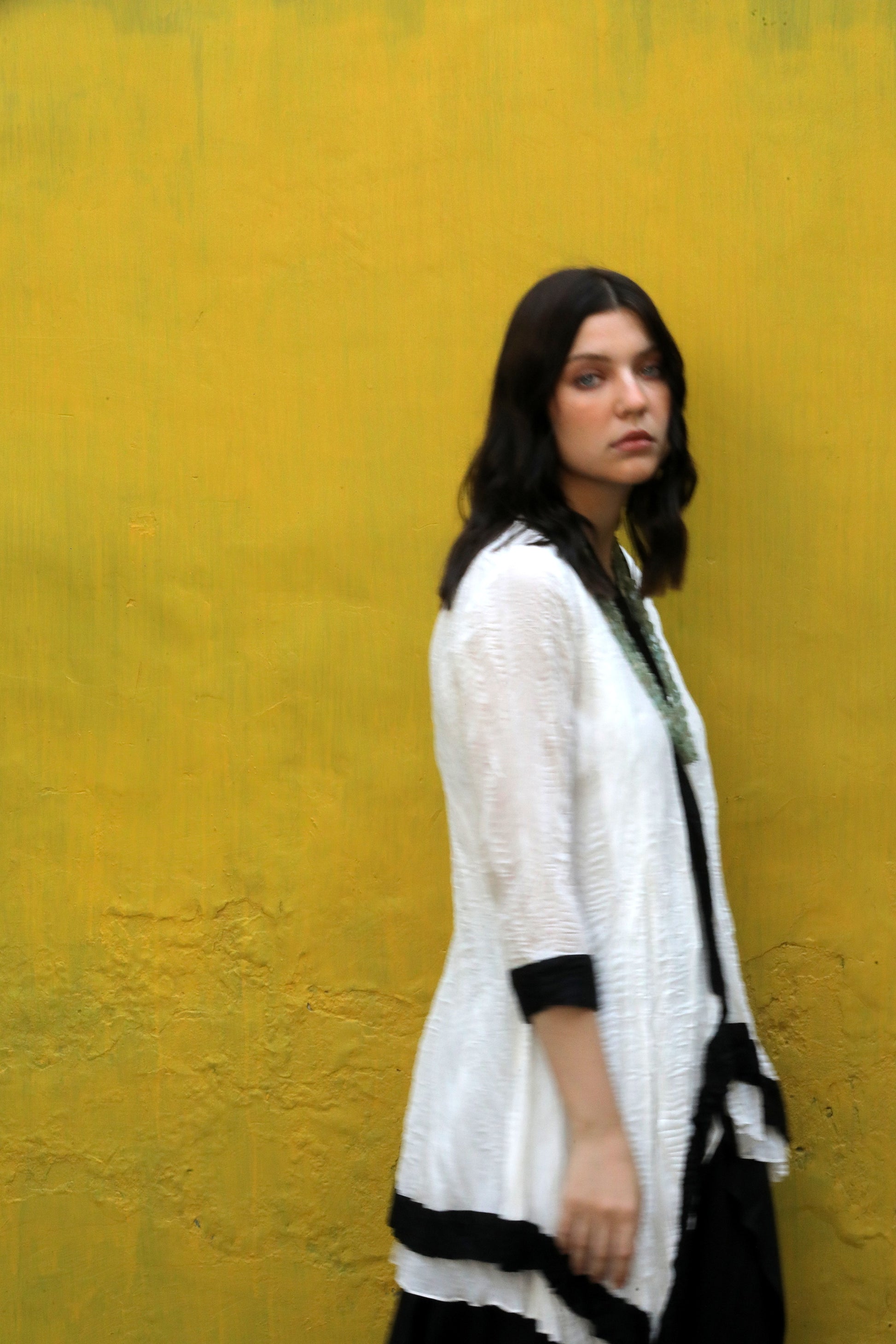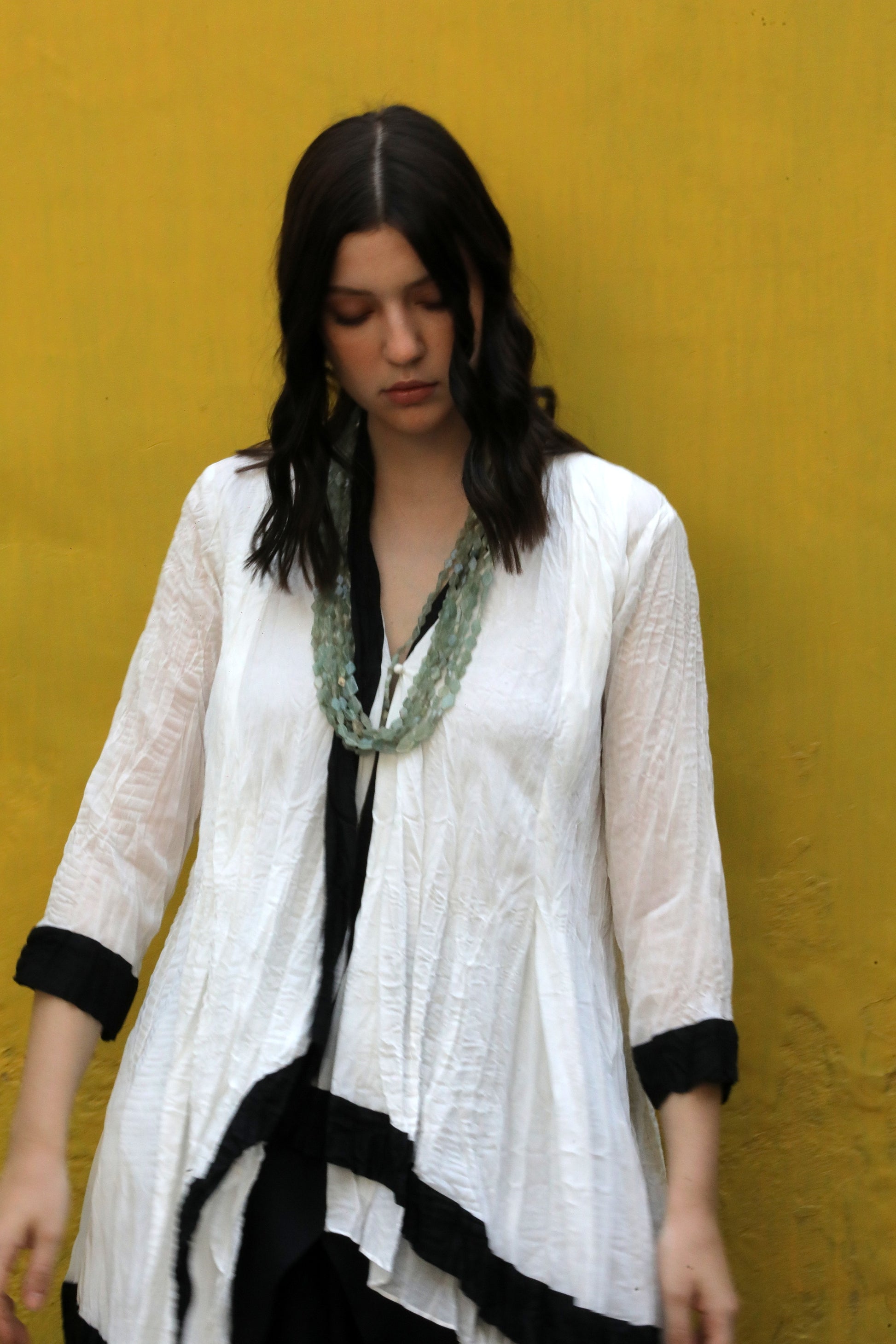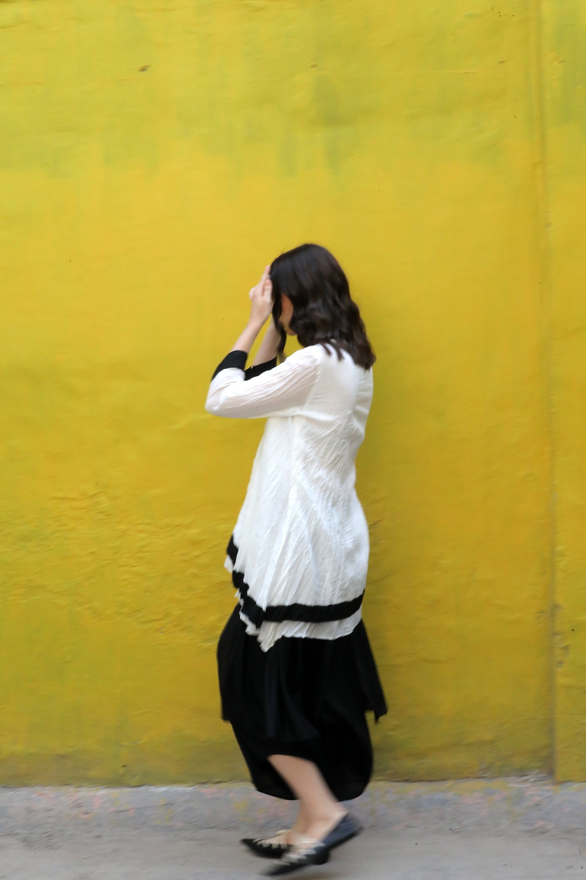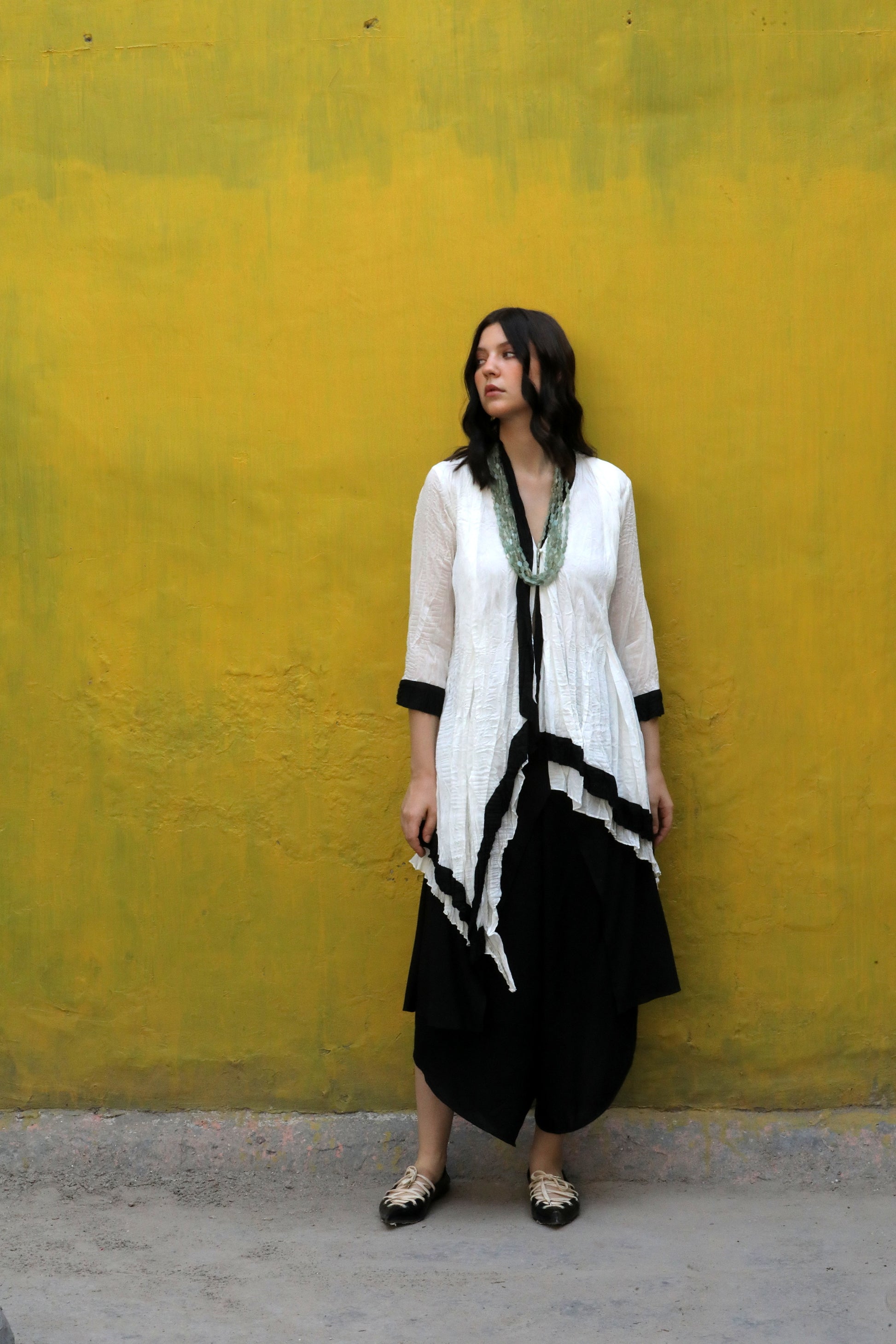 A cotton silk crushed single button asymmetric top highlighted with black border worn with a black modal signature flap pants.