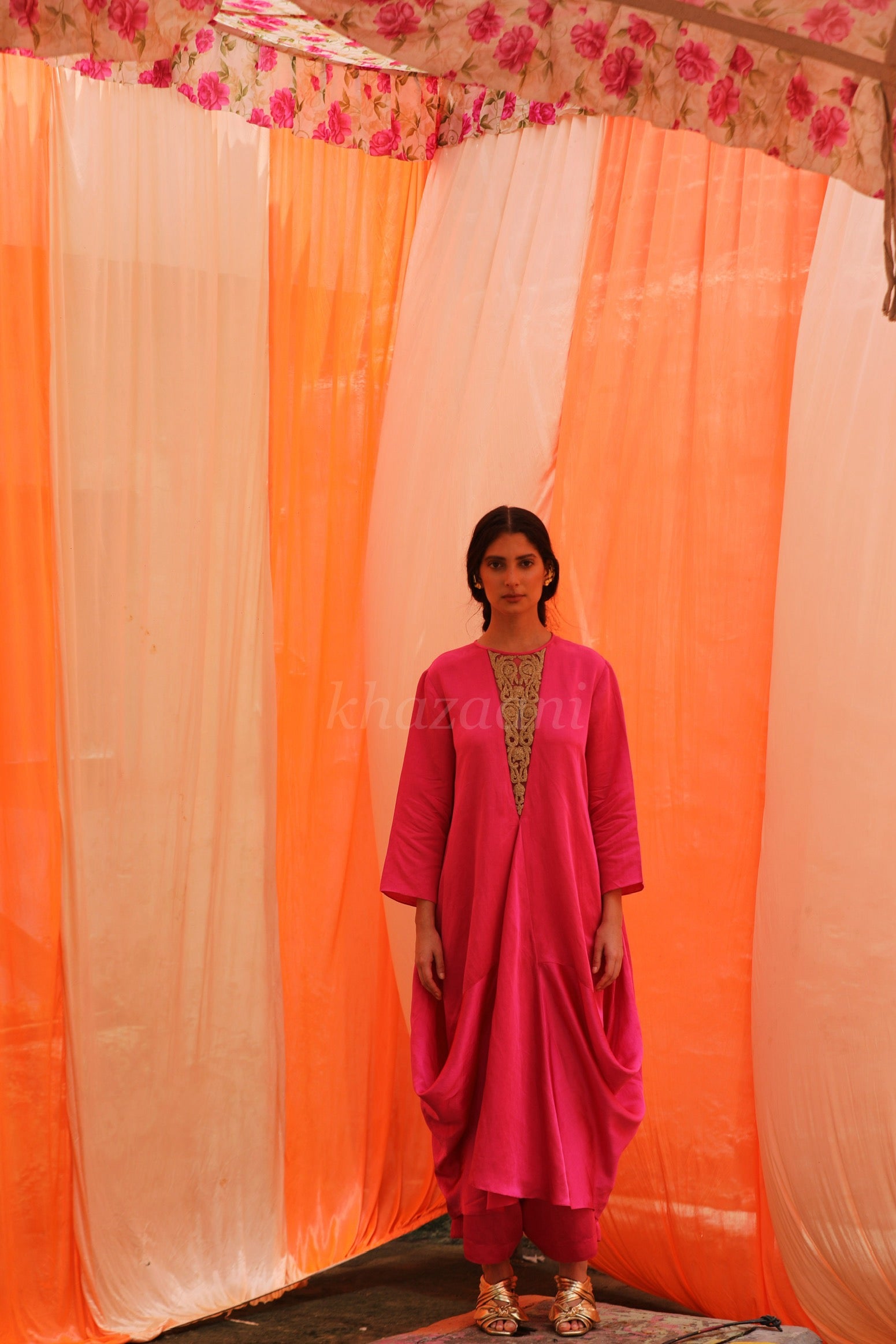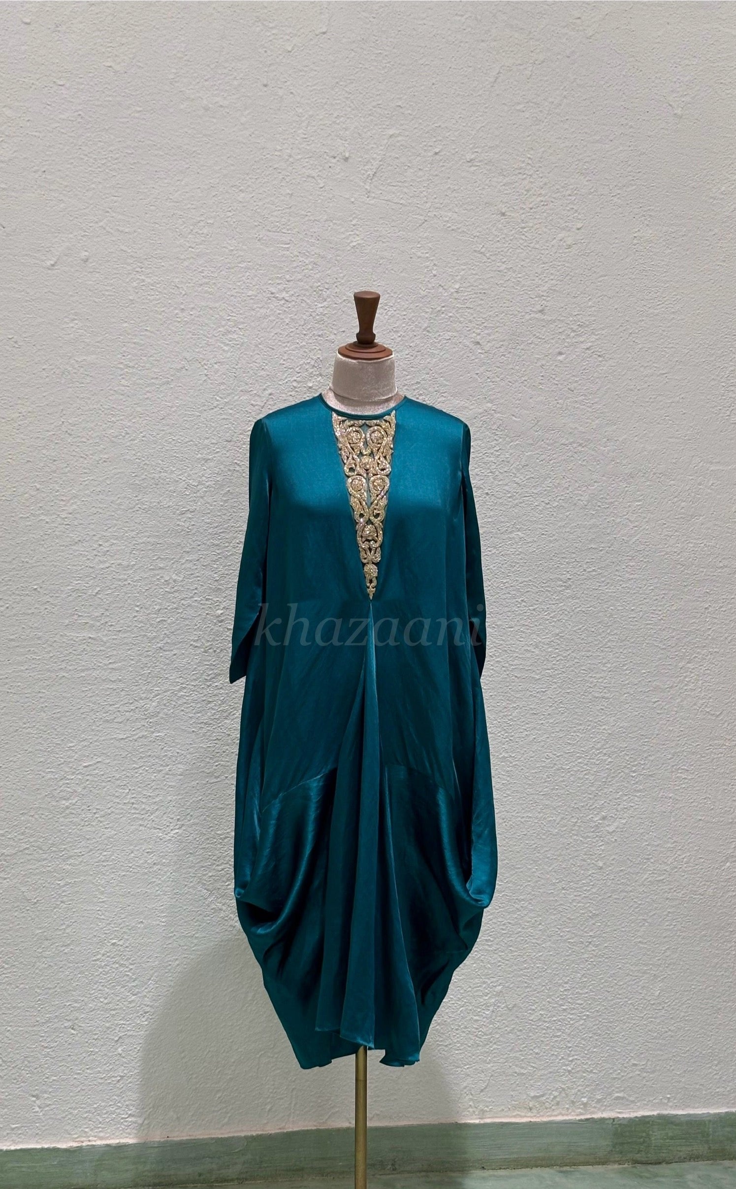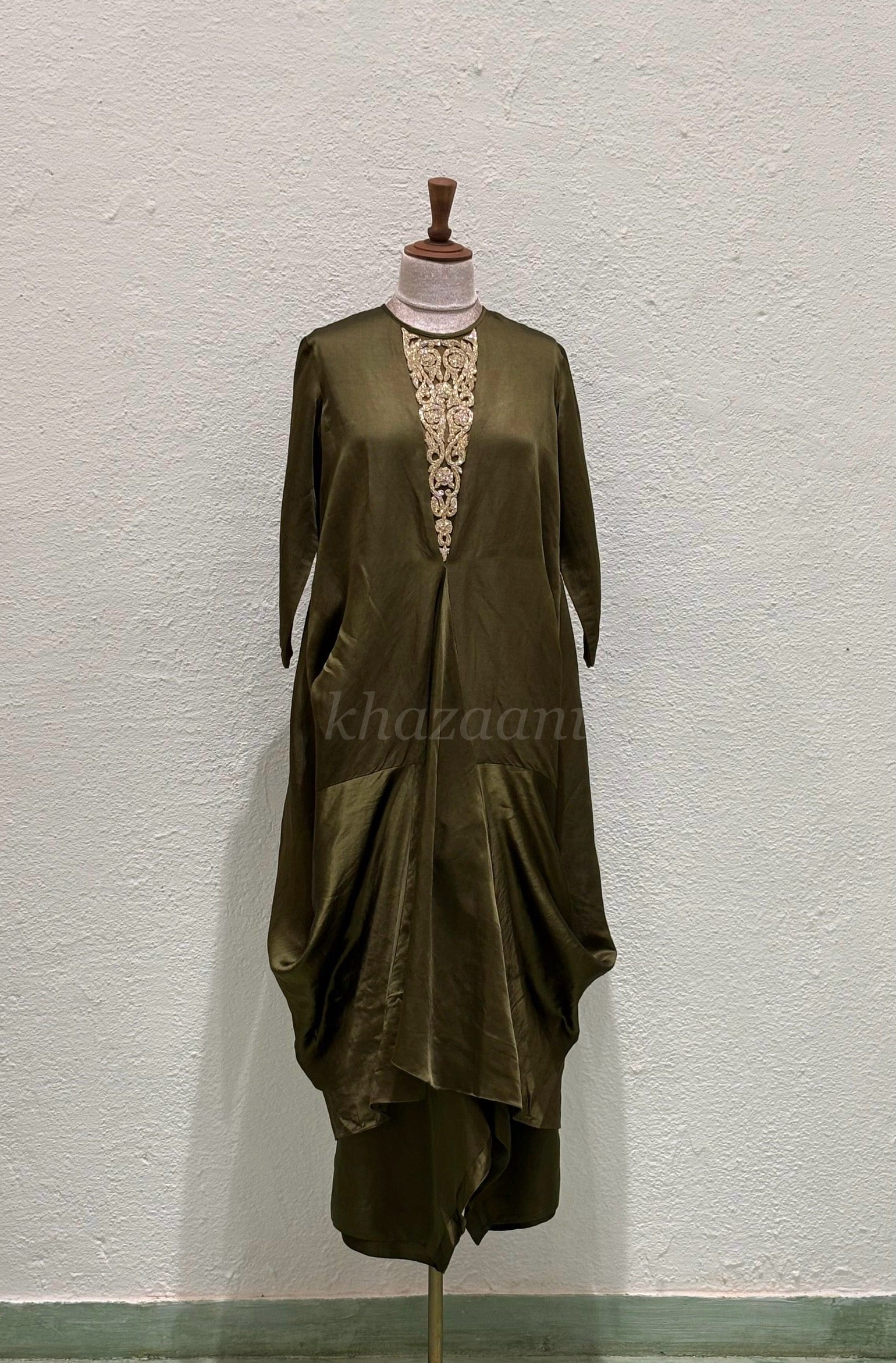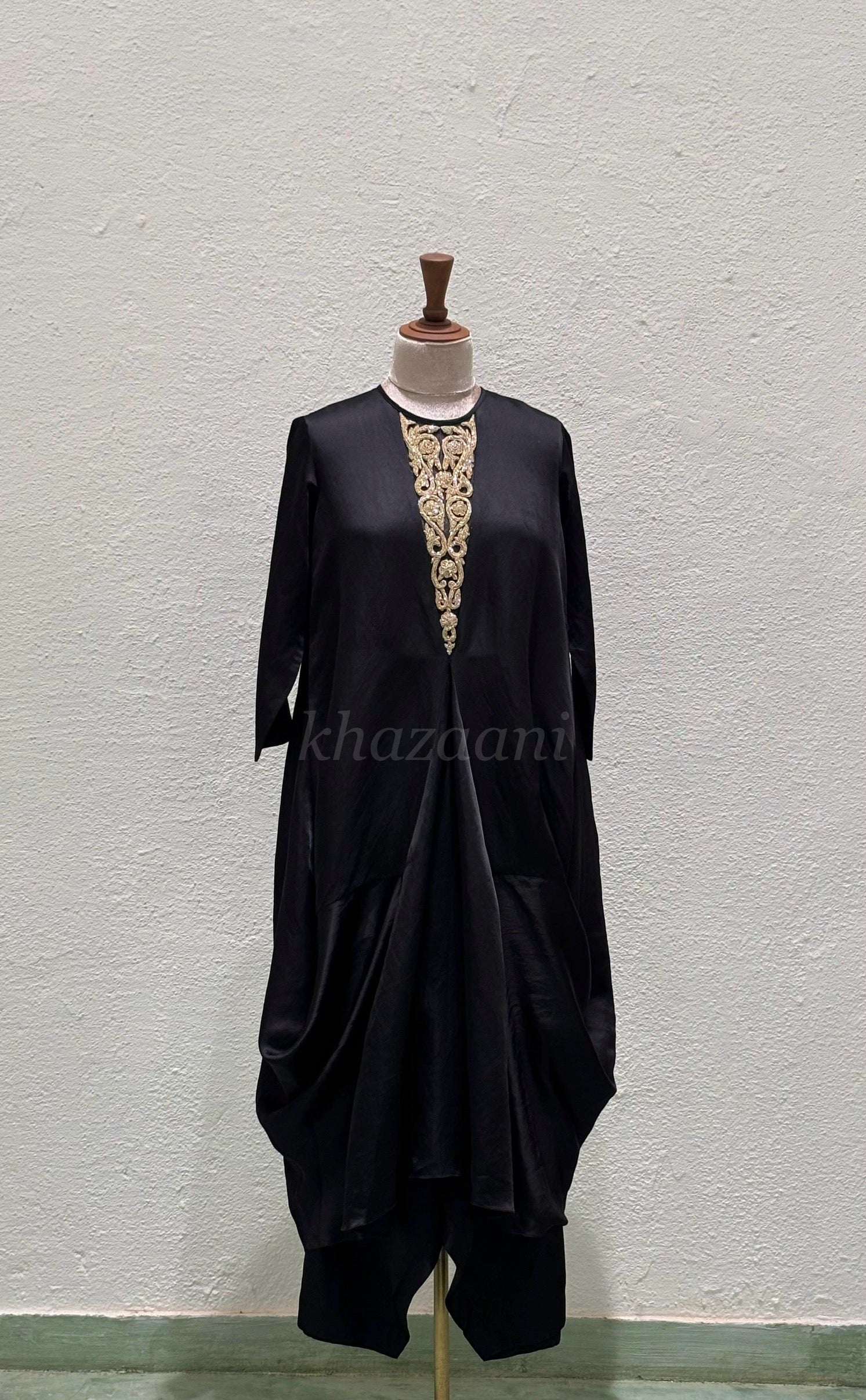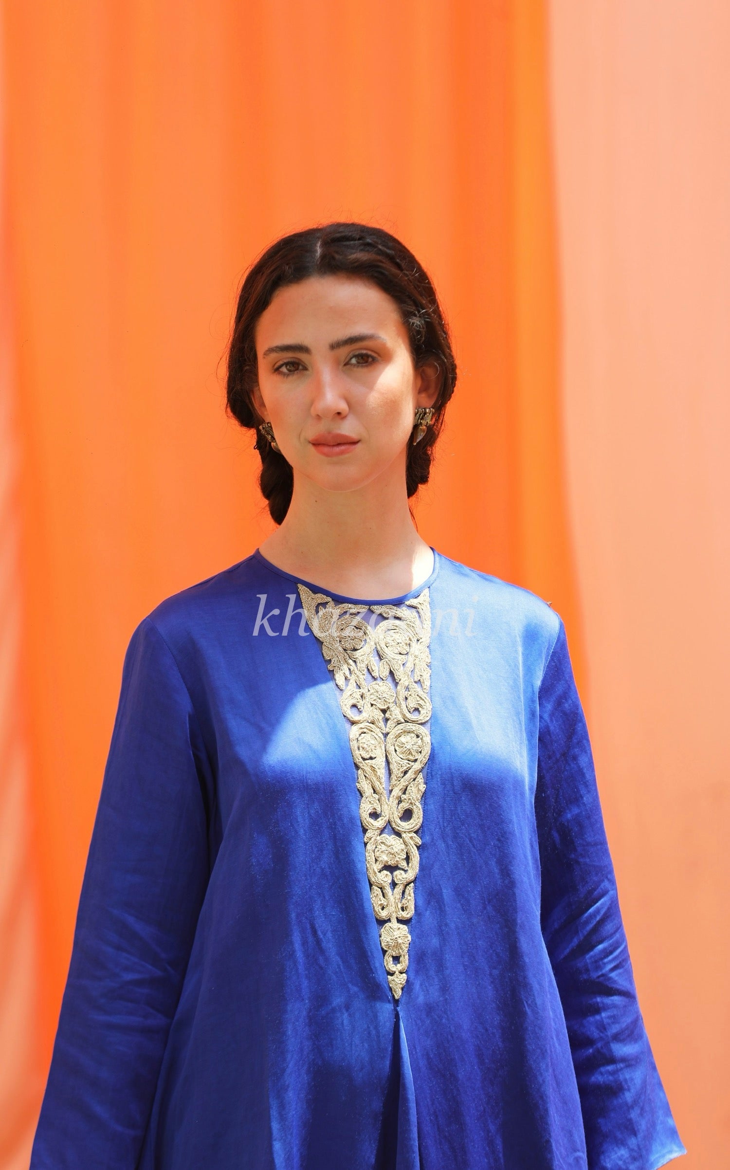 A Cotton satin draped tunic with embroidery highlight worn with pants.