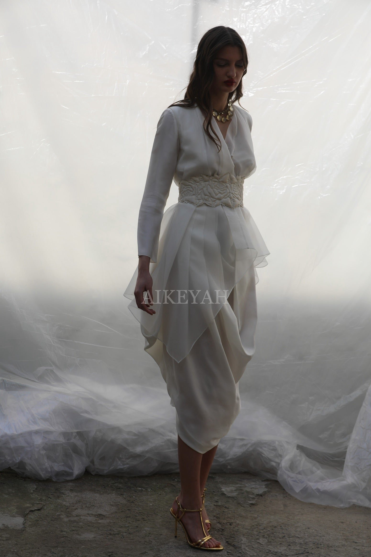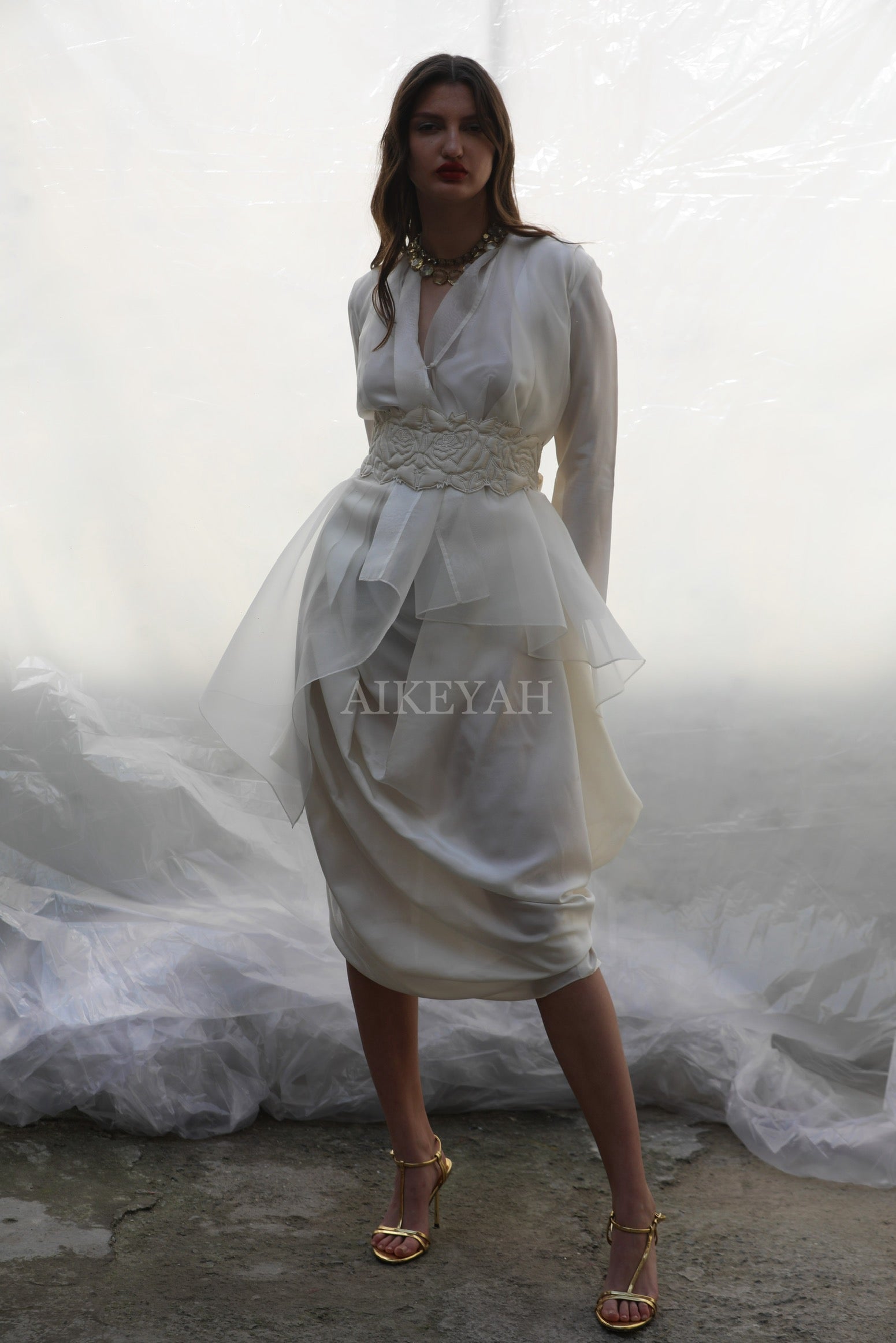 An organza asymmetric top worn with a silk drape dress and cinched at the waist with signature quilted tie up belt.
