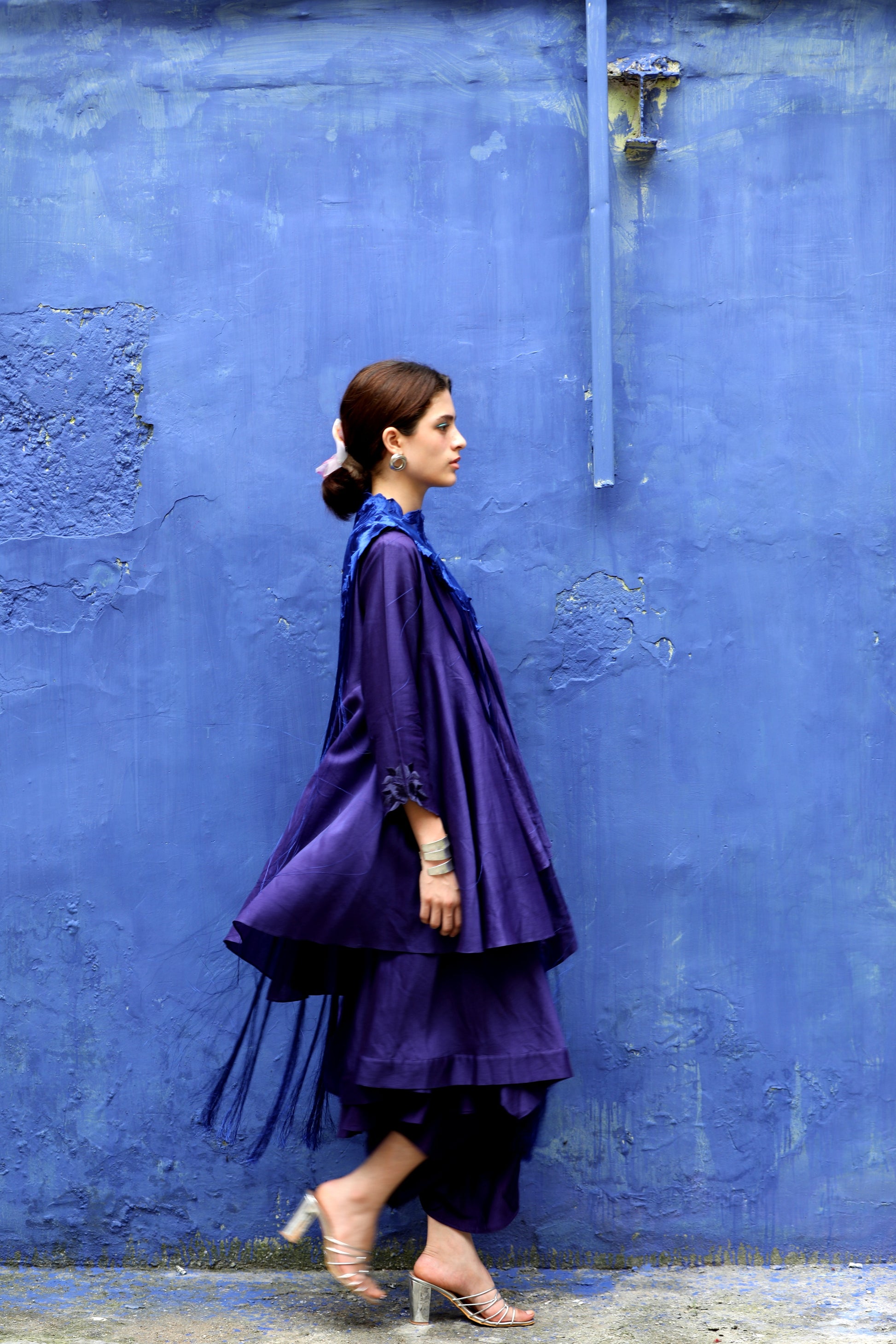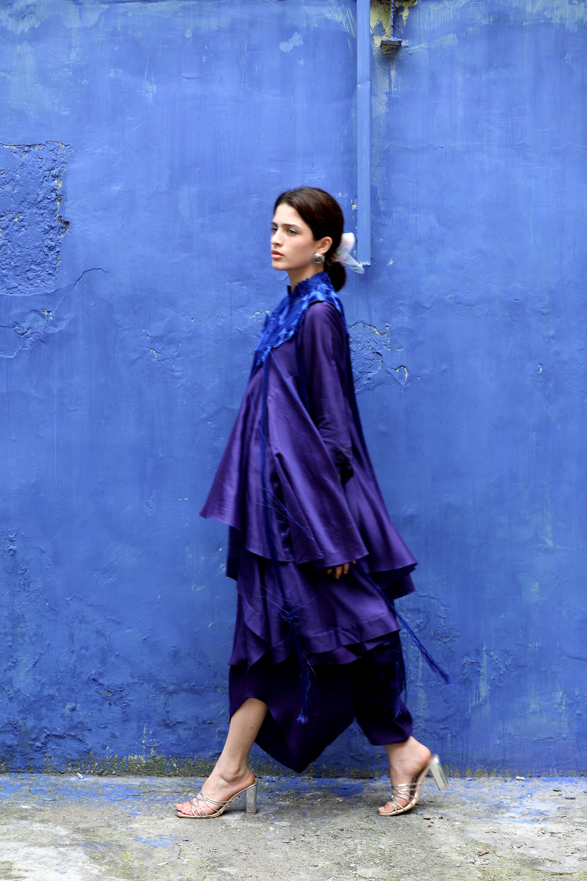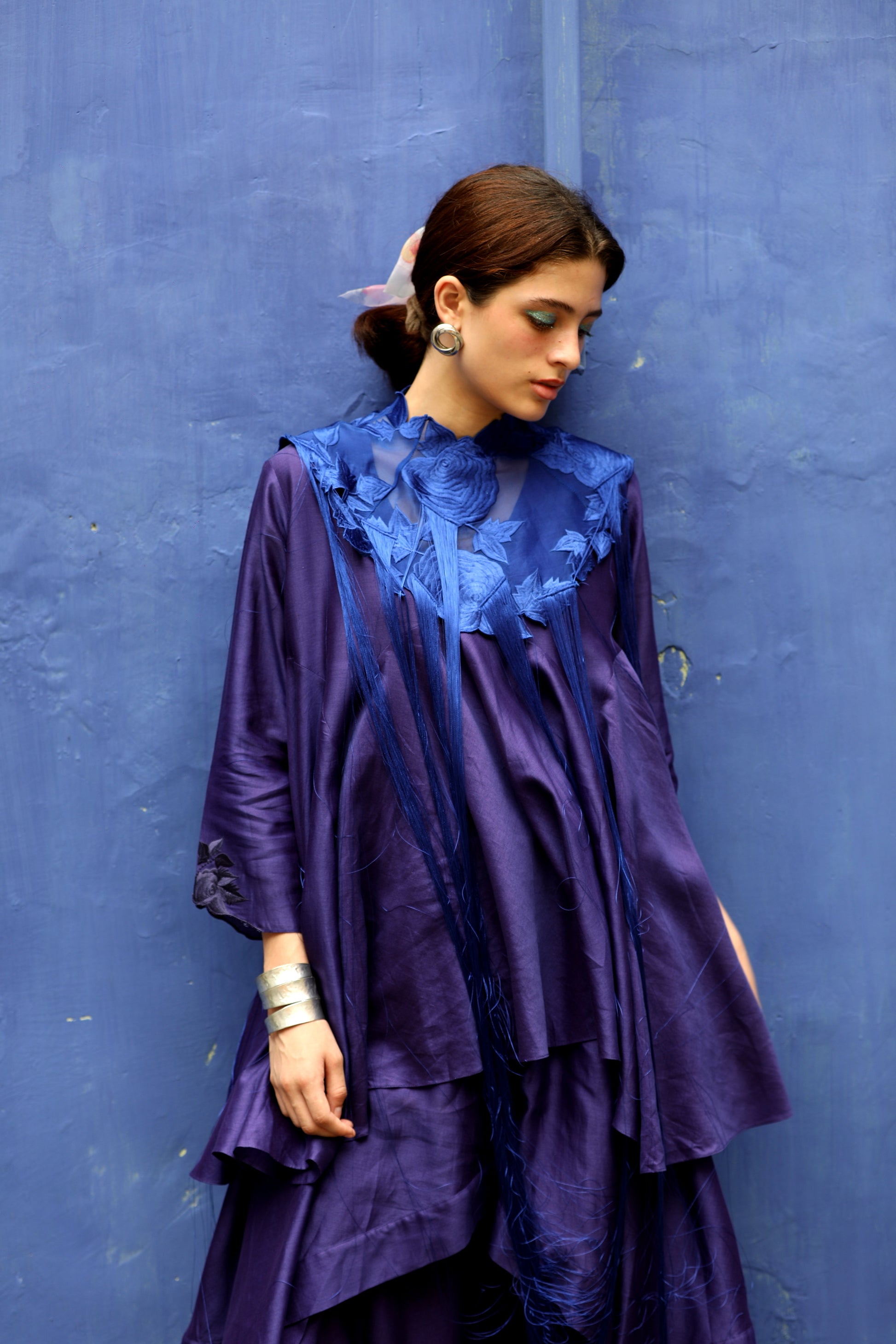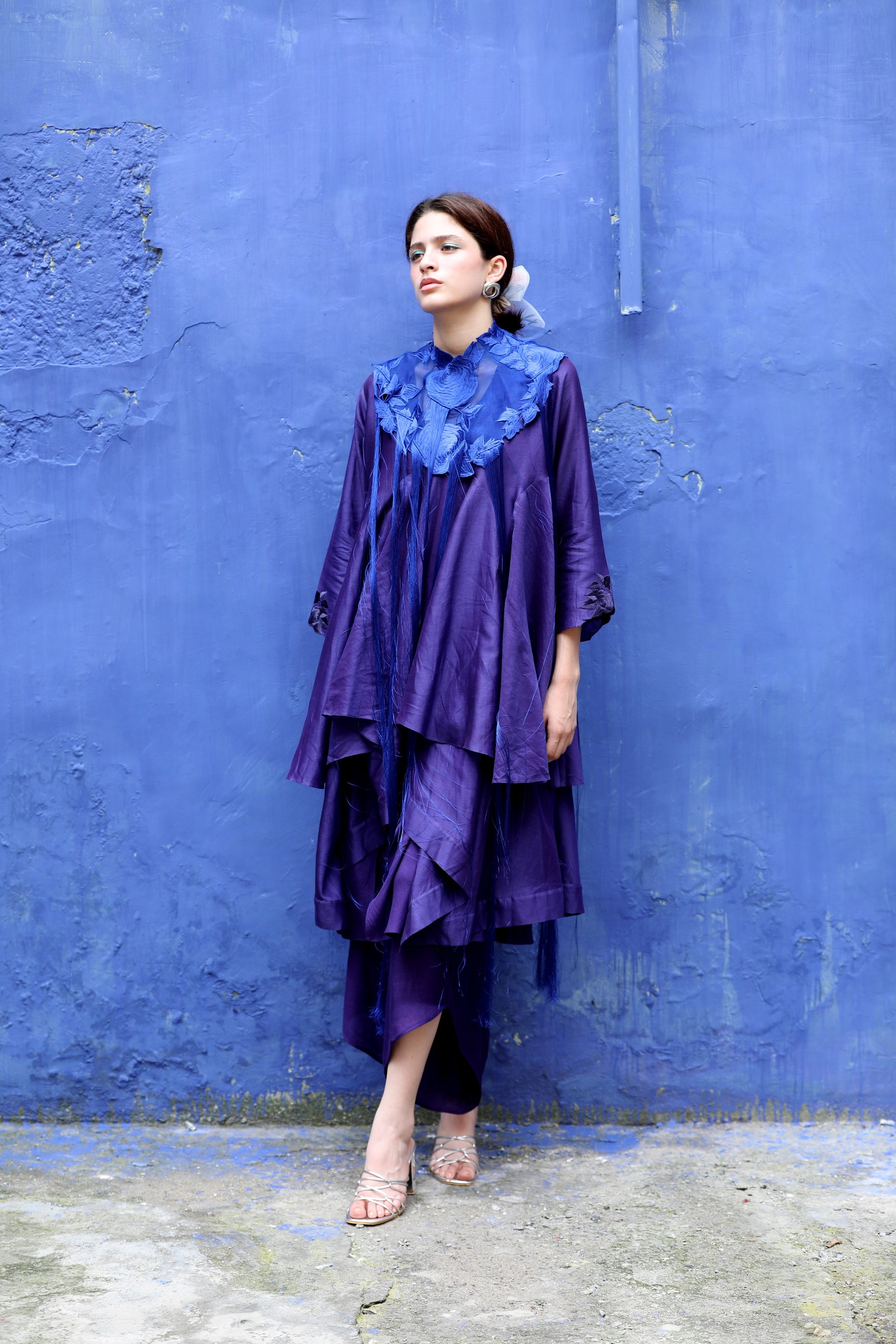 A brinjal blue colored chanderi layered asymmetric top worn with signature flap pants in shantung and an embroidered collar with fringes in contrasting electric blue color.