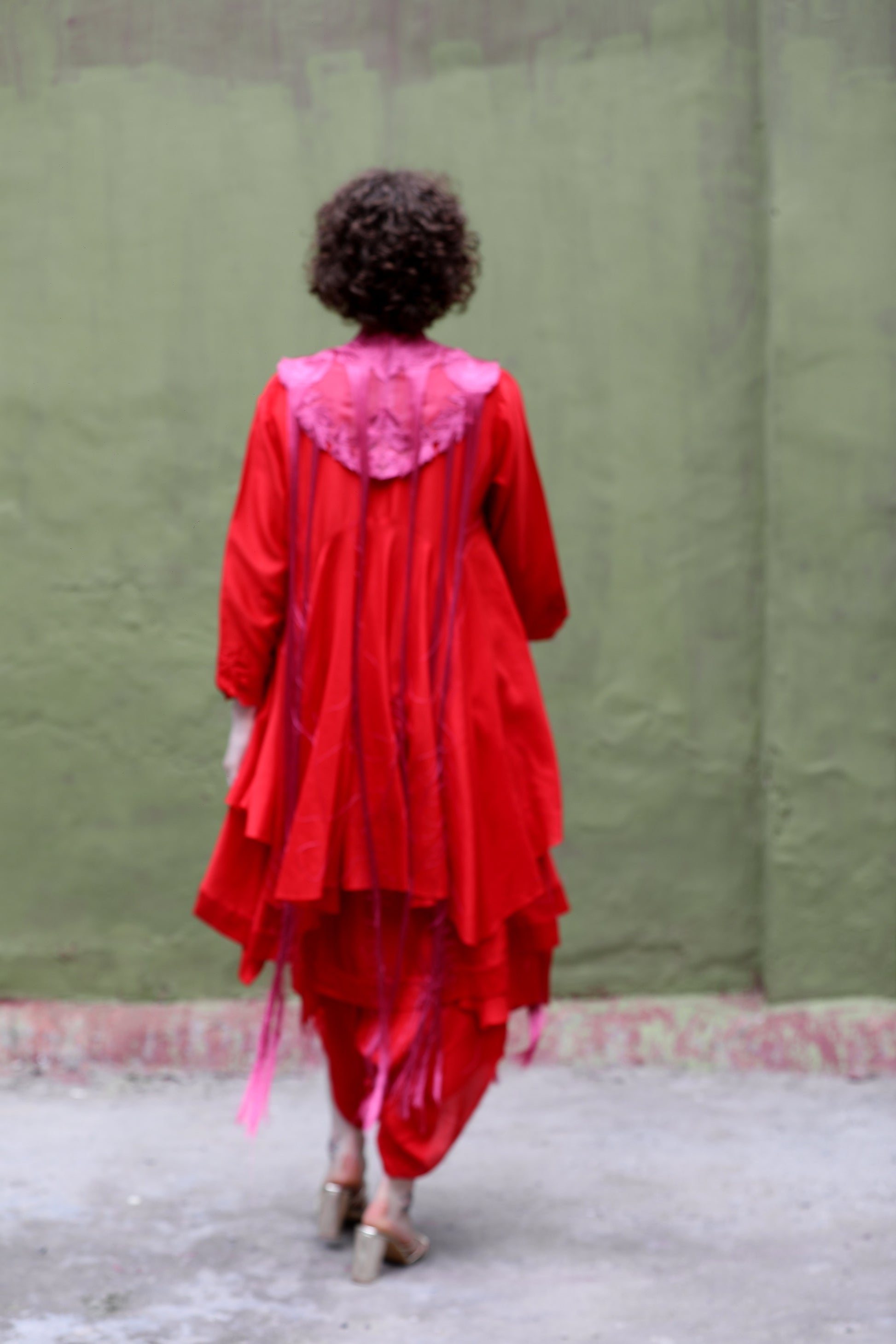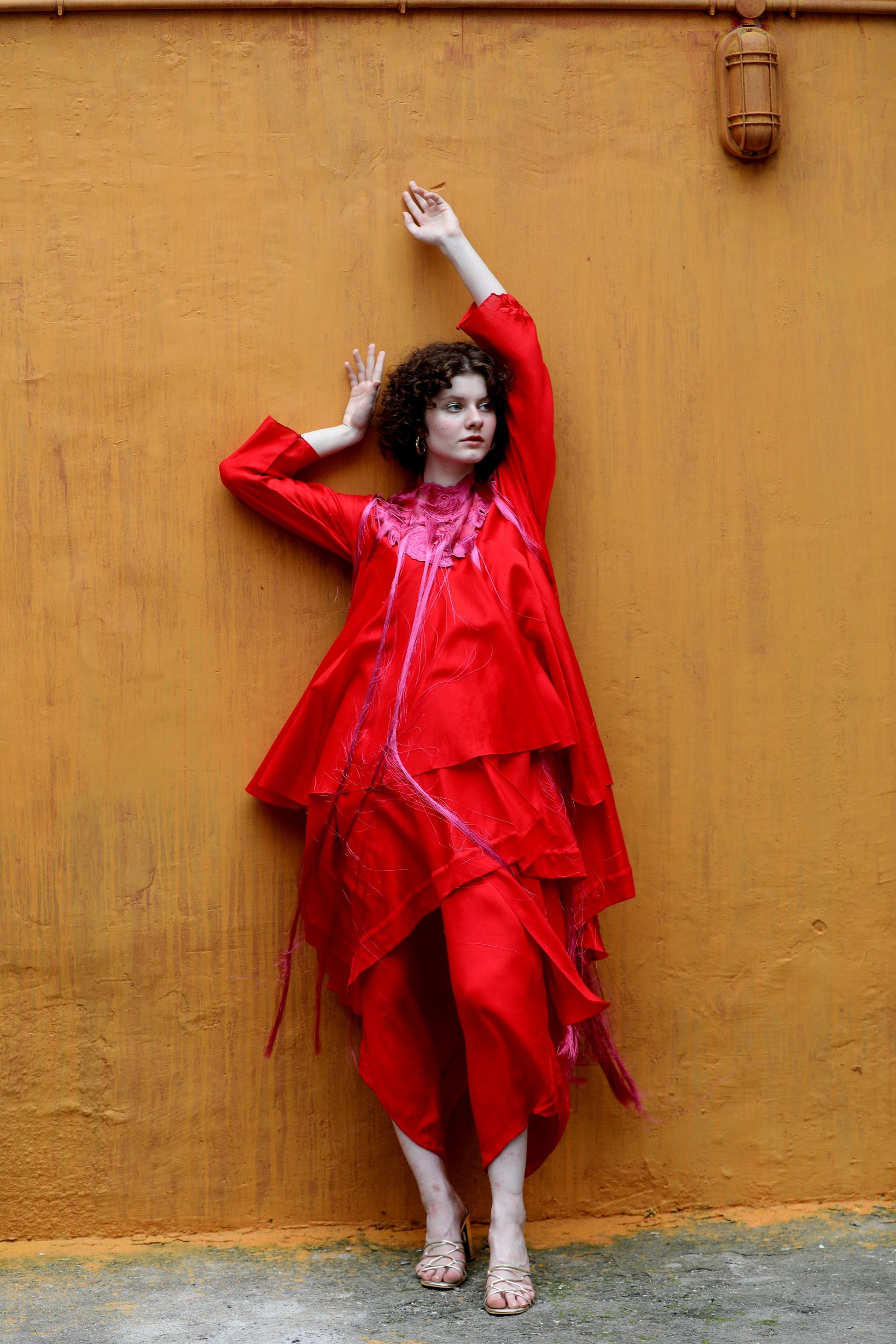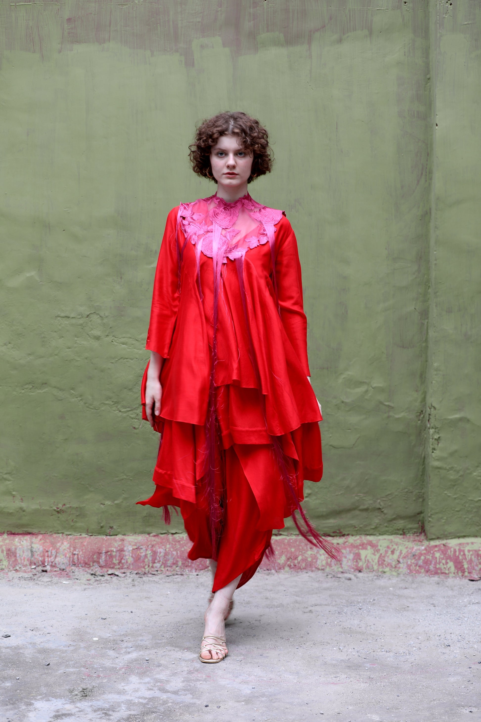 A Red colored chanderi layered asymmetric top worn with signature flap pants in shantung and an embroidered collar with fringes in contrasting Candy Pink color.
