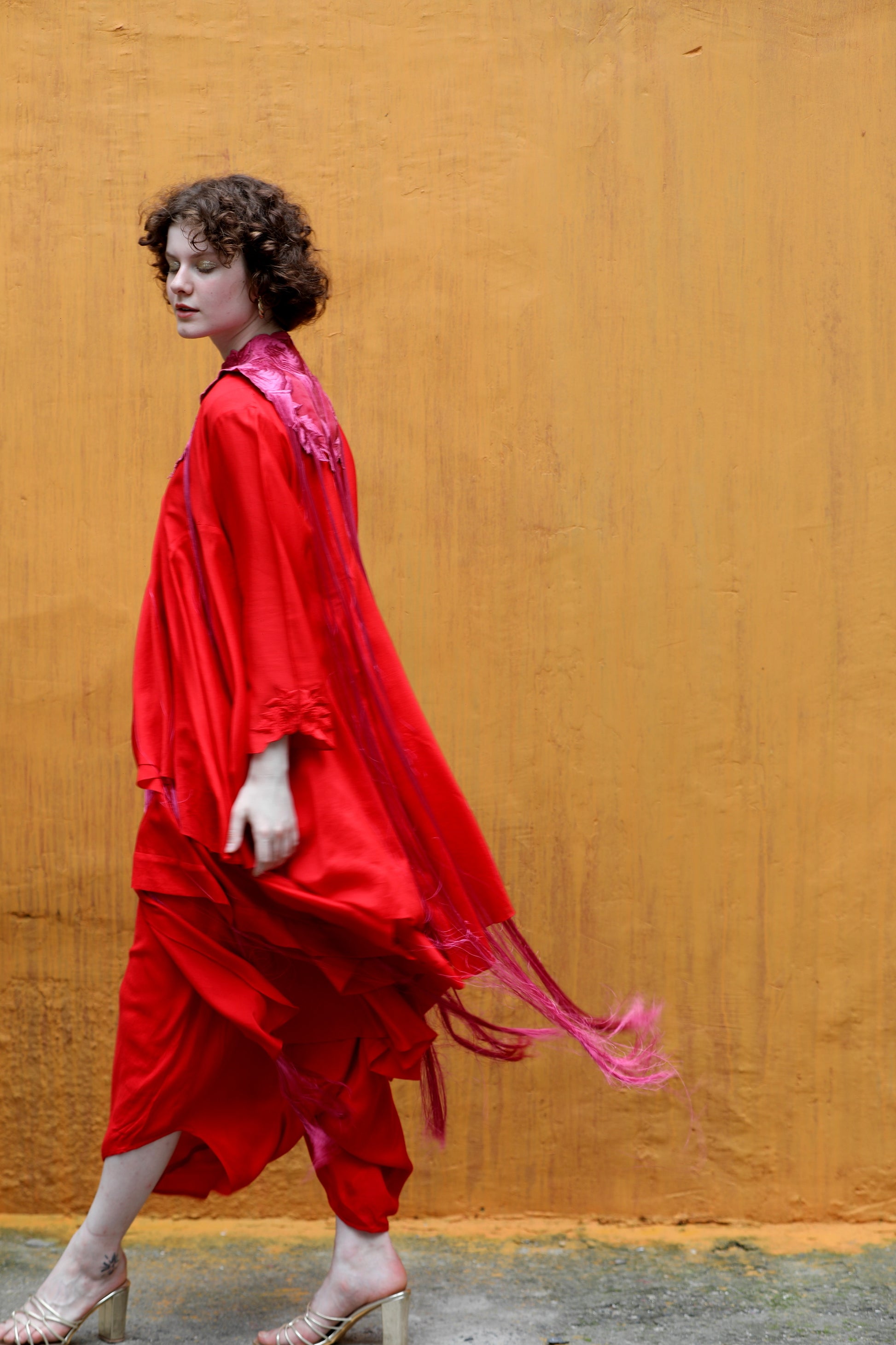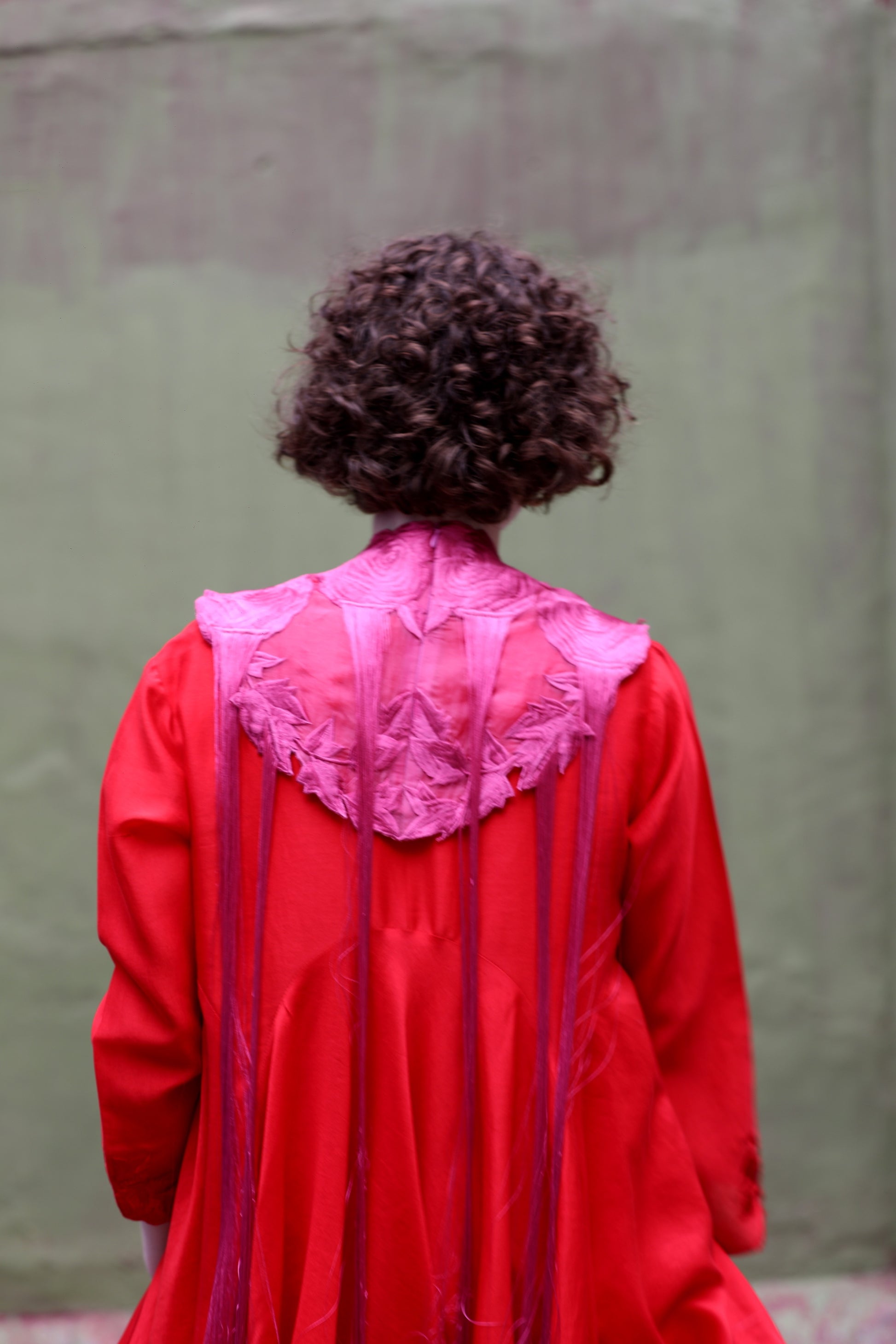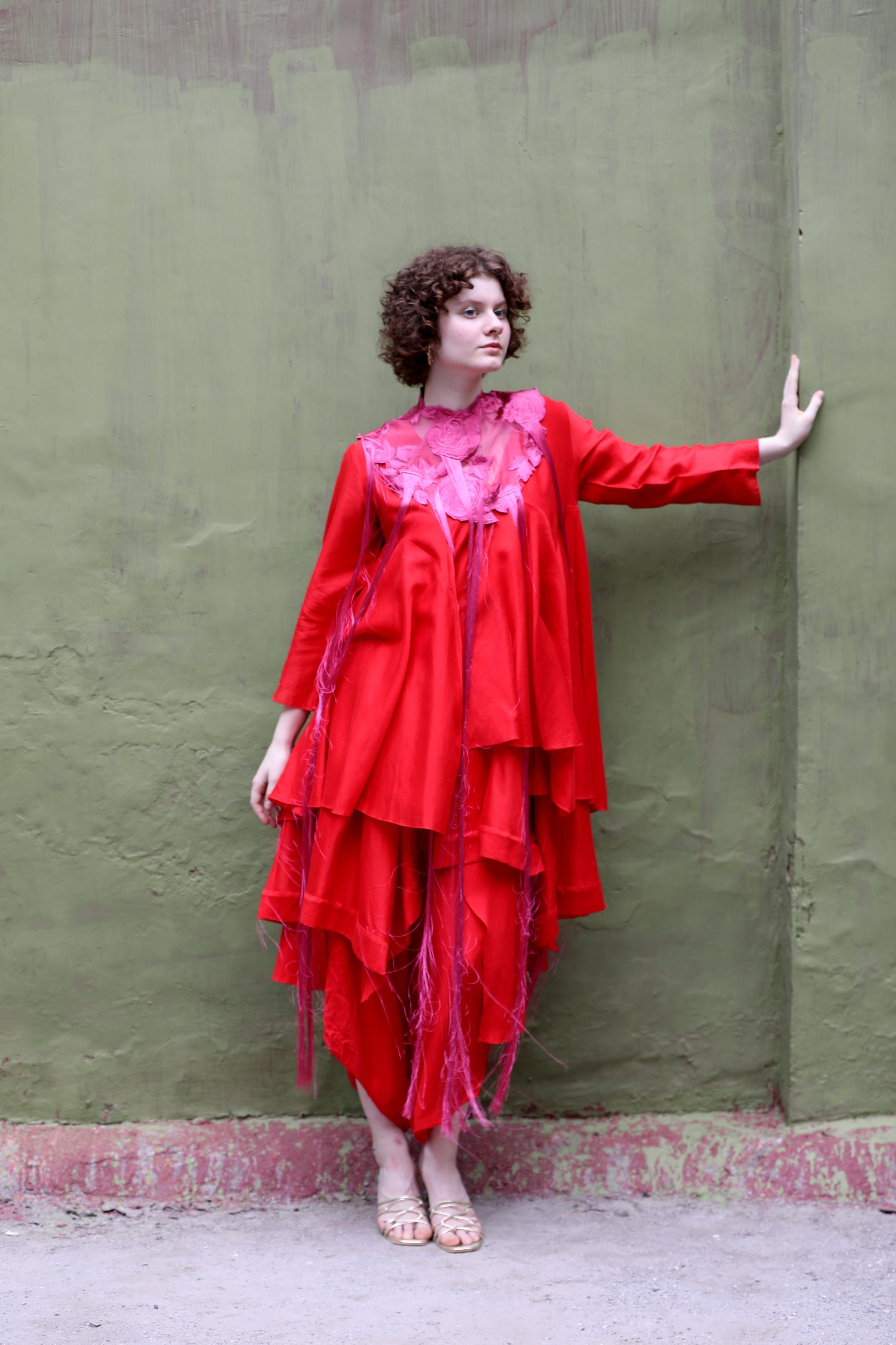 A Red colored chanderi layered asymmetric top worn with signature flap pants in shantung and an embroidered collar with fringes in contrasting Candy Pink color.
