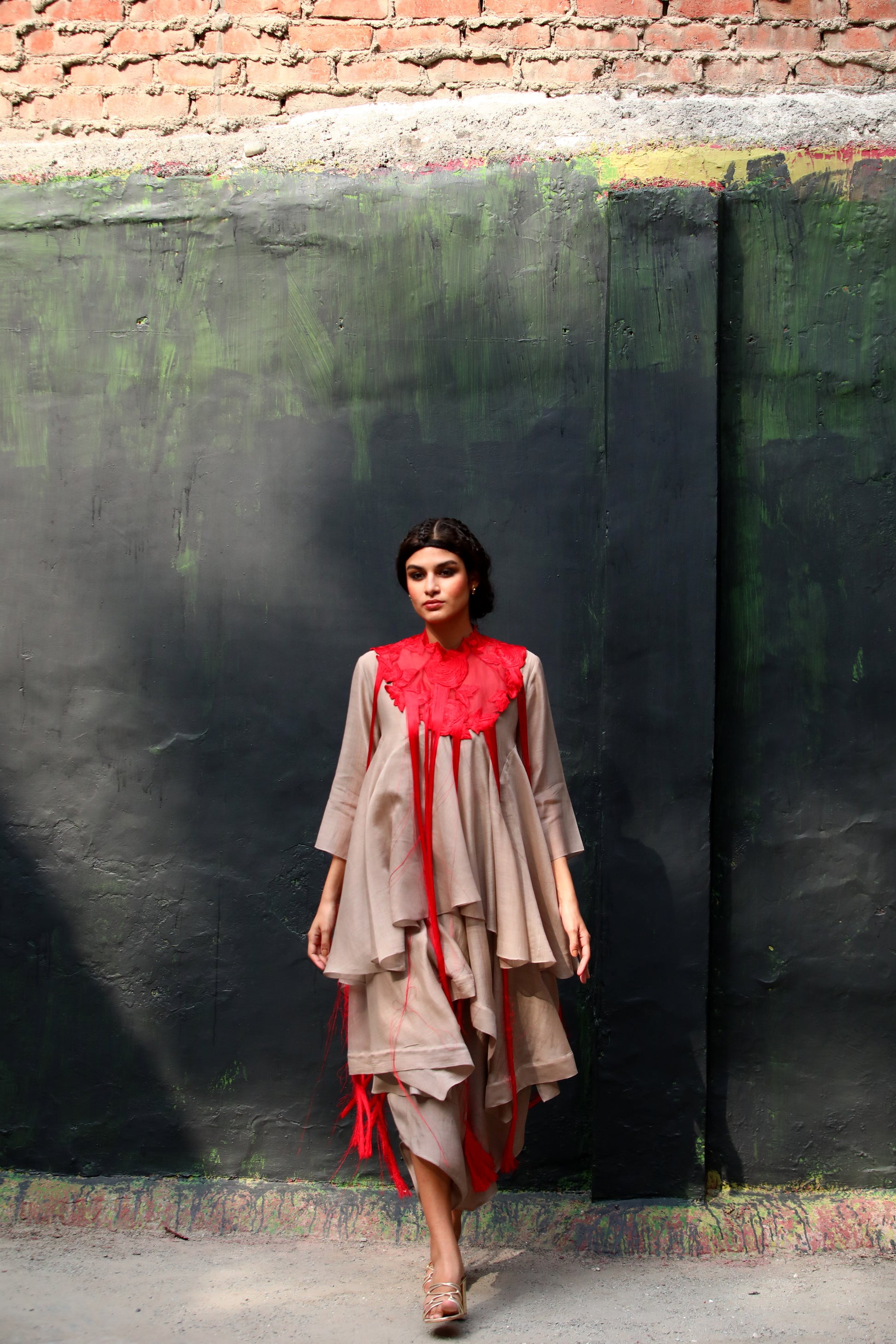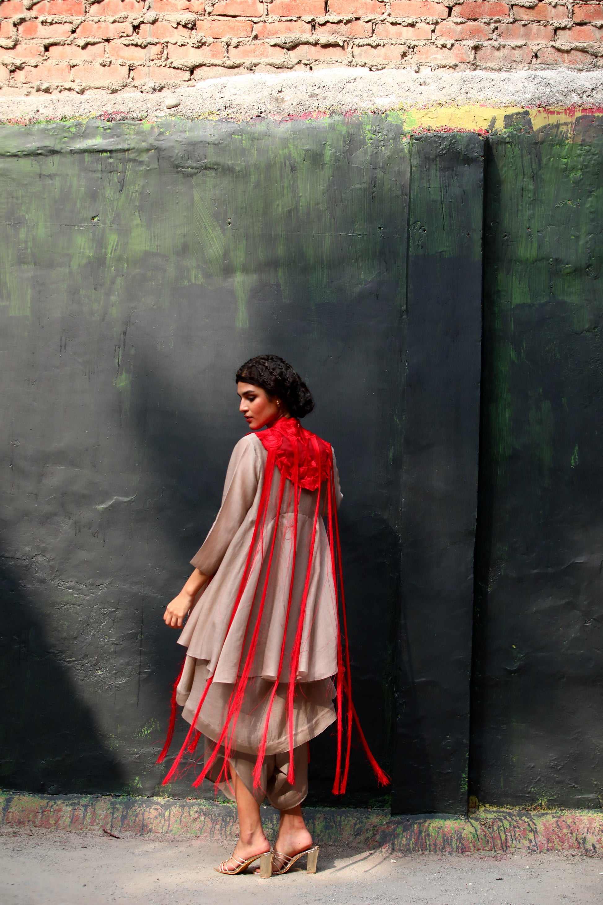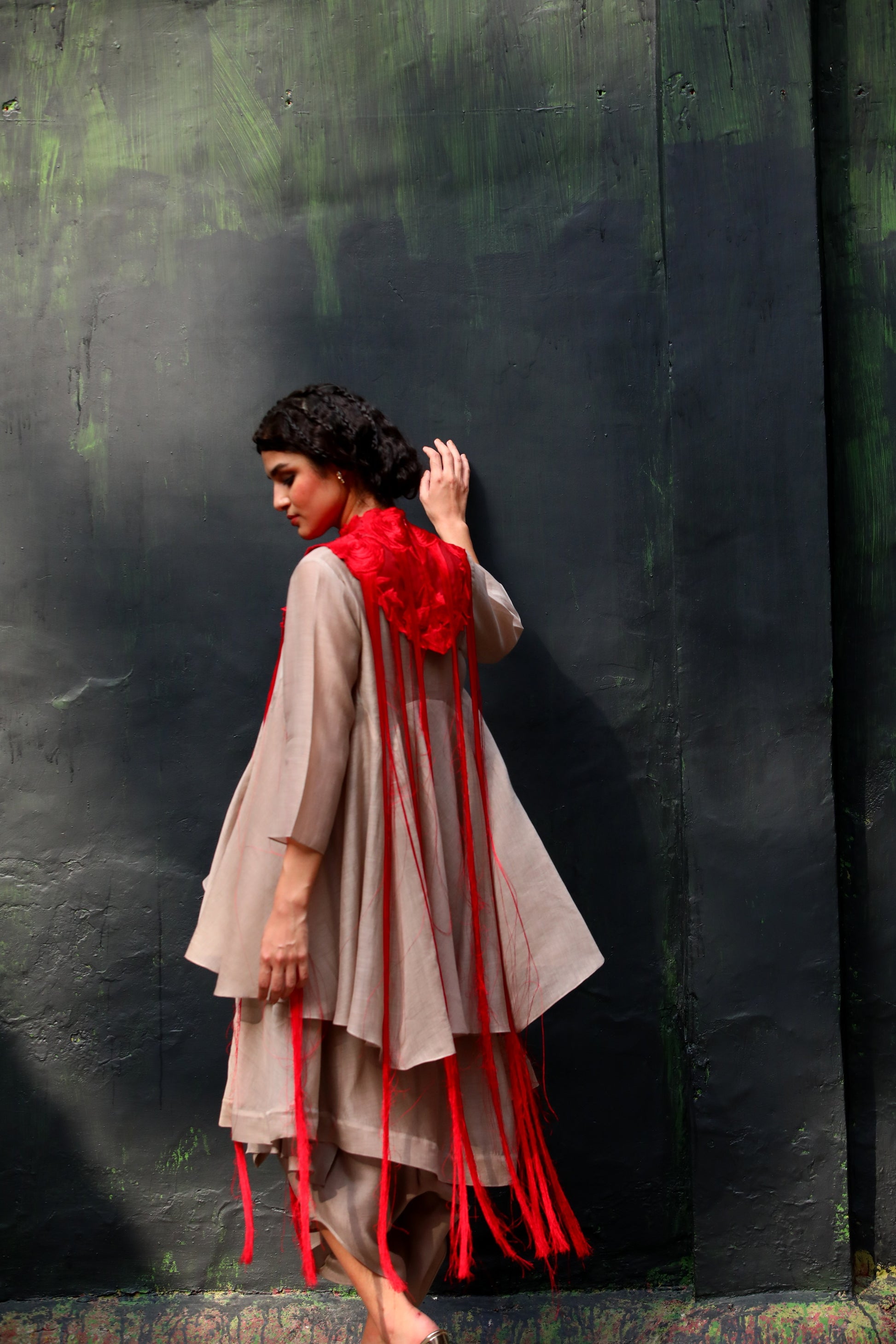 A grey chanderi layered asymmetric top worn with signature flap pants in shantung and an embroidered collar with fringes in contrasting Red color.