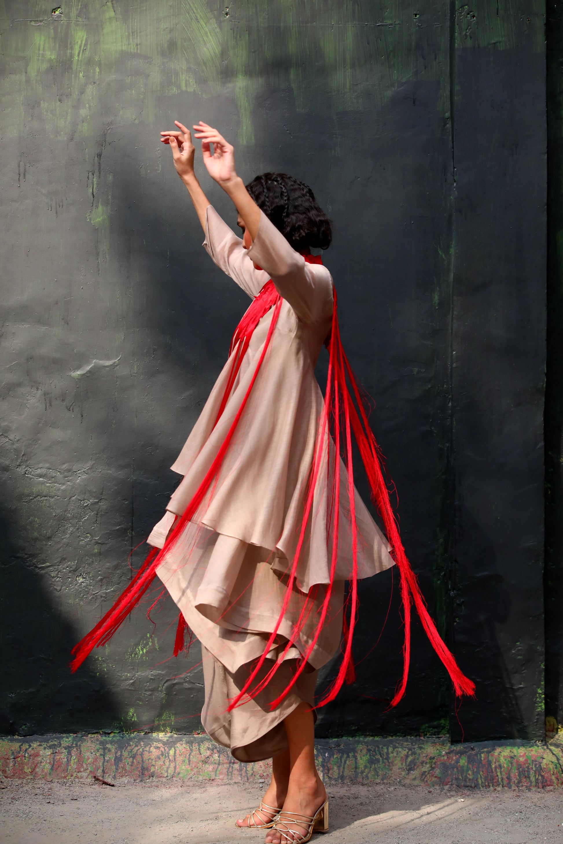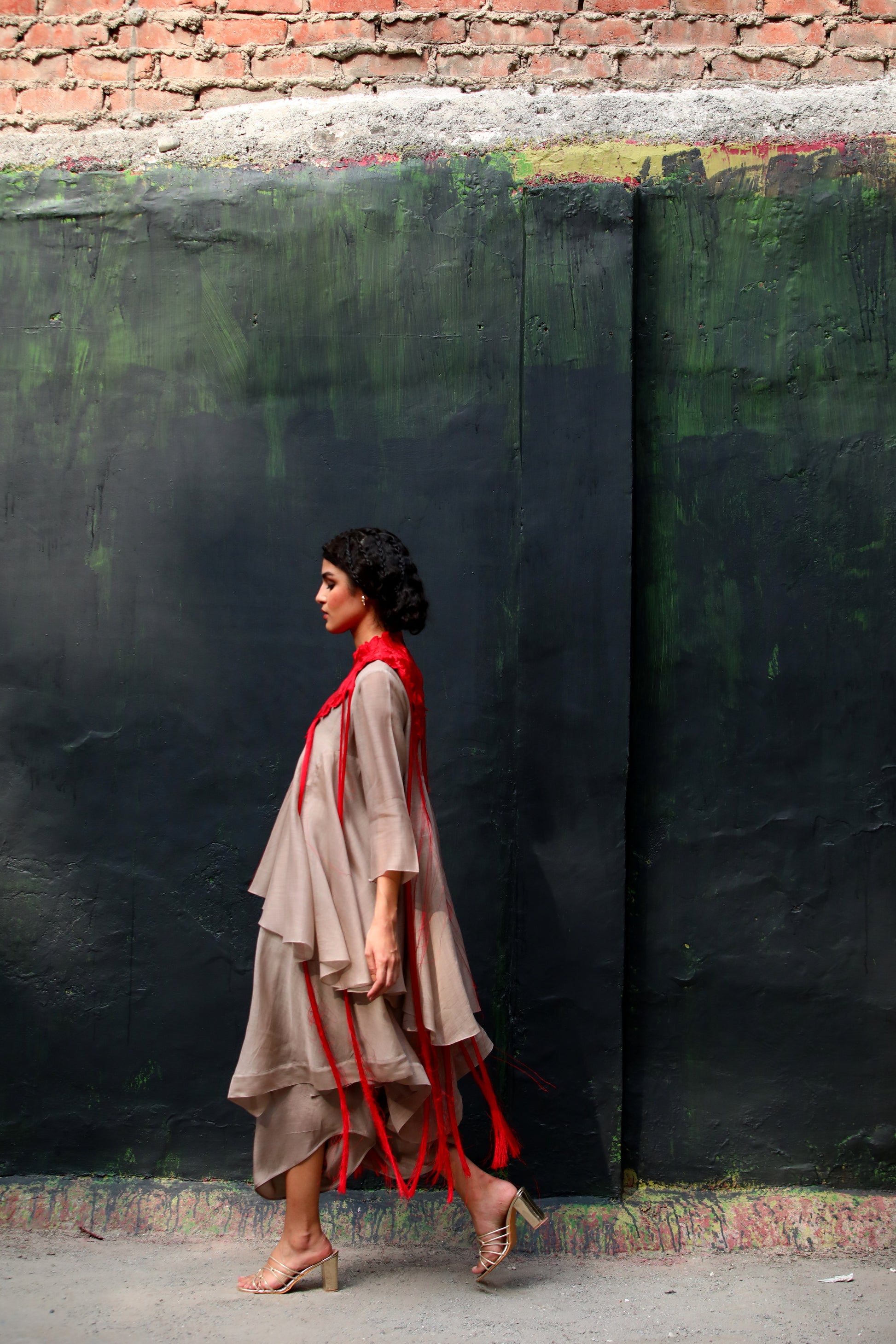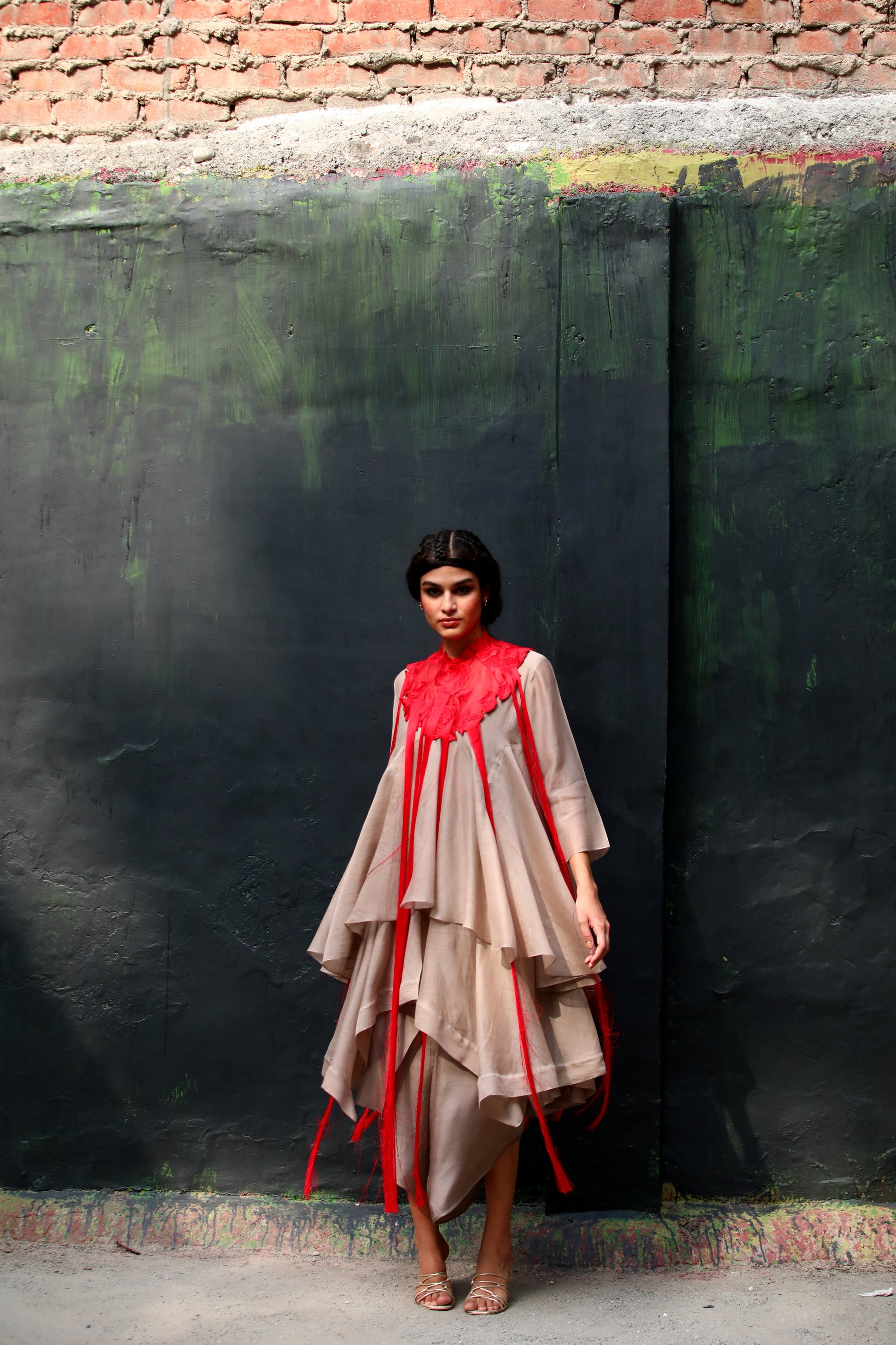 A grey chanderi layered asymmetric top worn with signature flap pants in shantung and an embroidered collar with fringes in contrasting Red color.