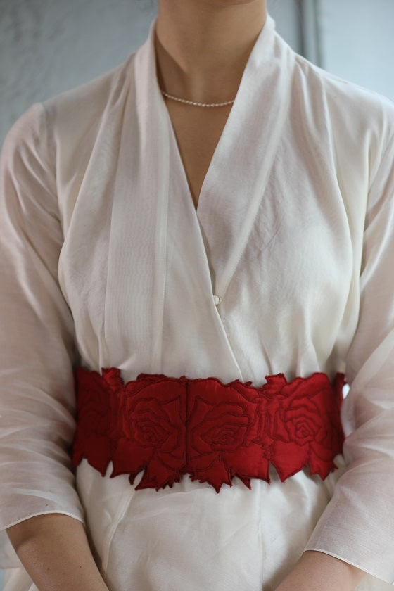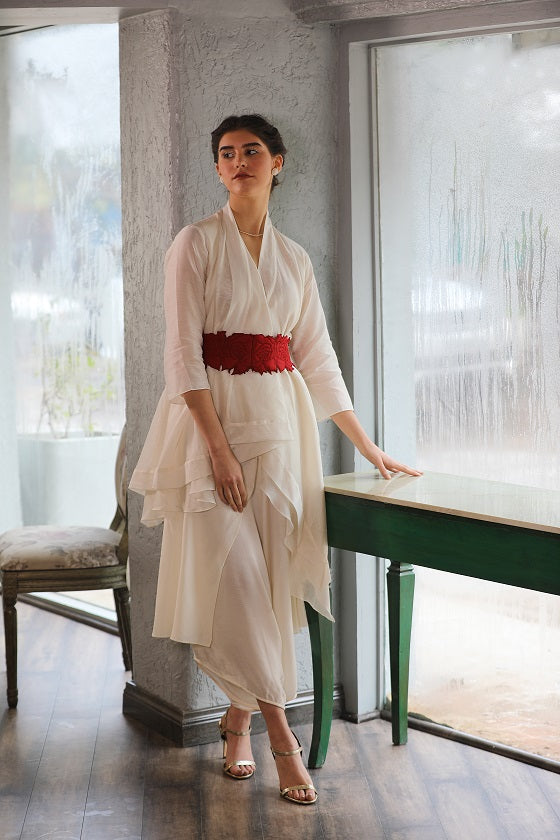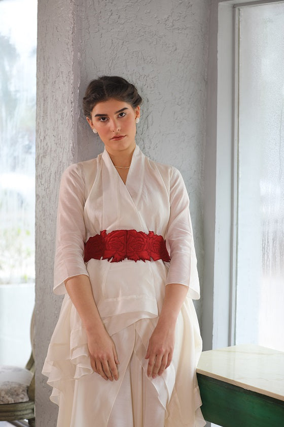 Single button asymmetric chanderi top cinched at waist with a quilted silk floral belt in red worn with Aikeyah's signature flap pants in shantoon.