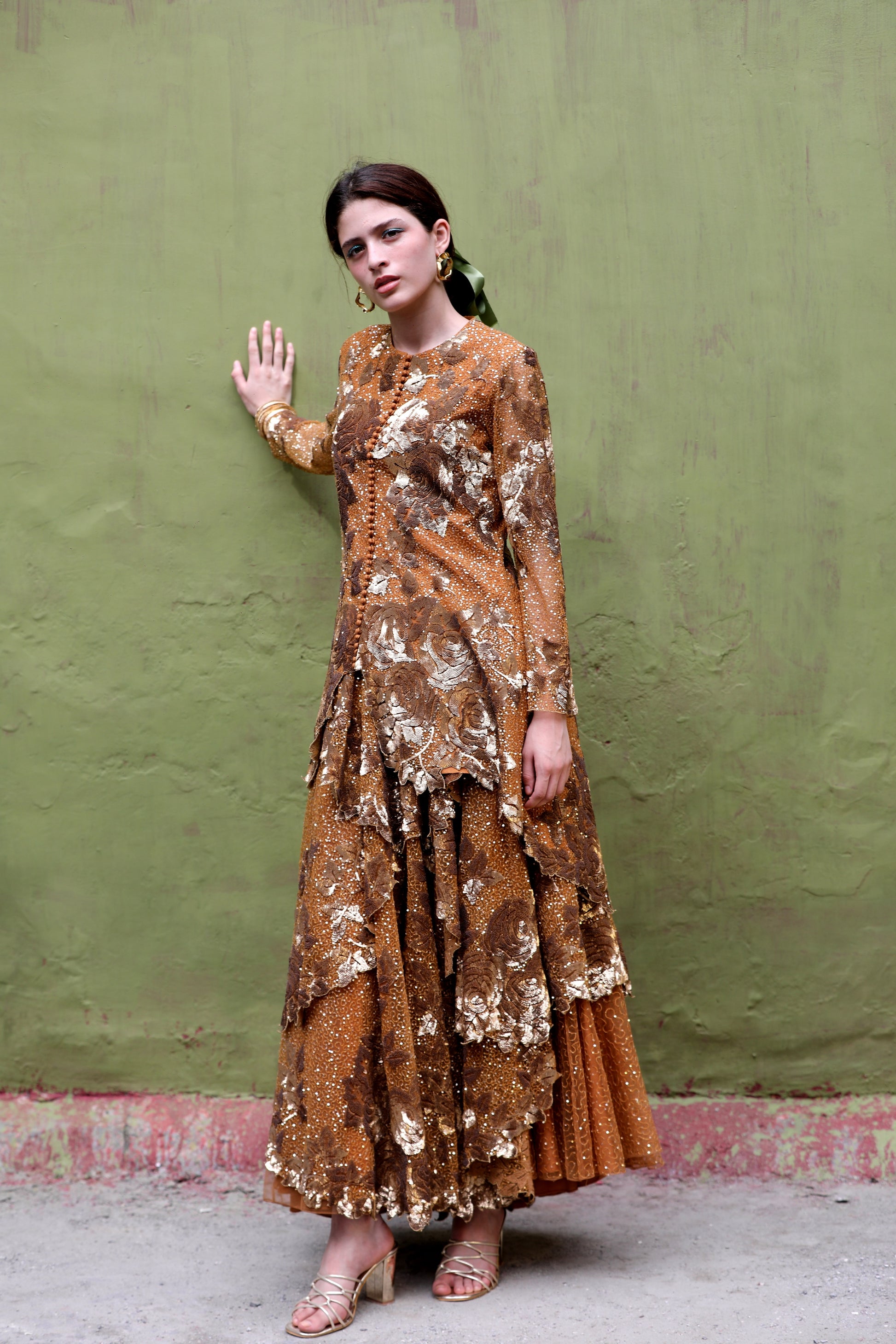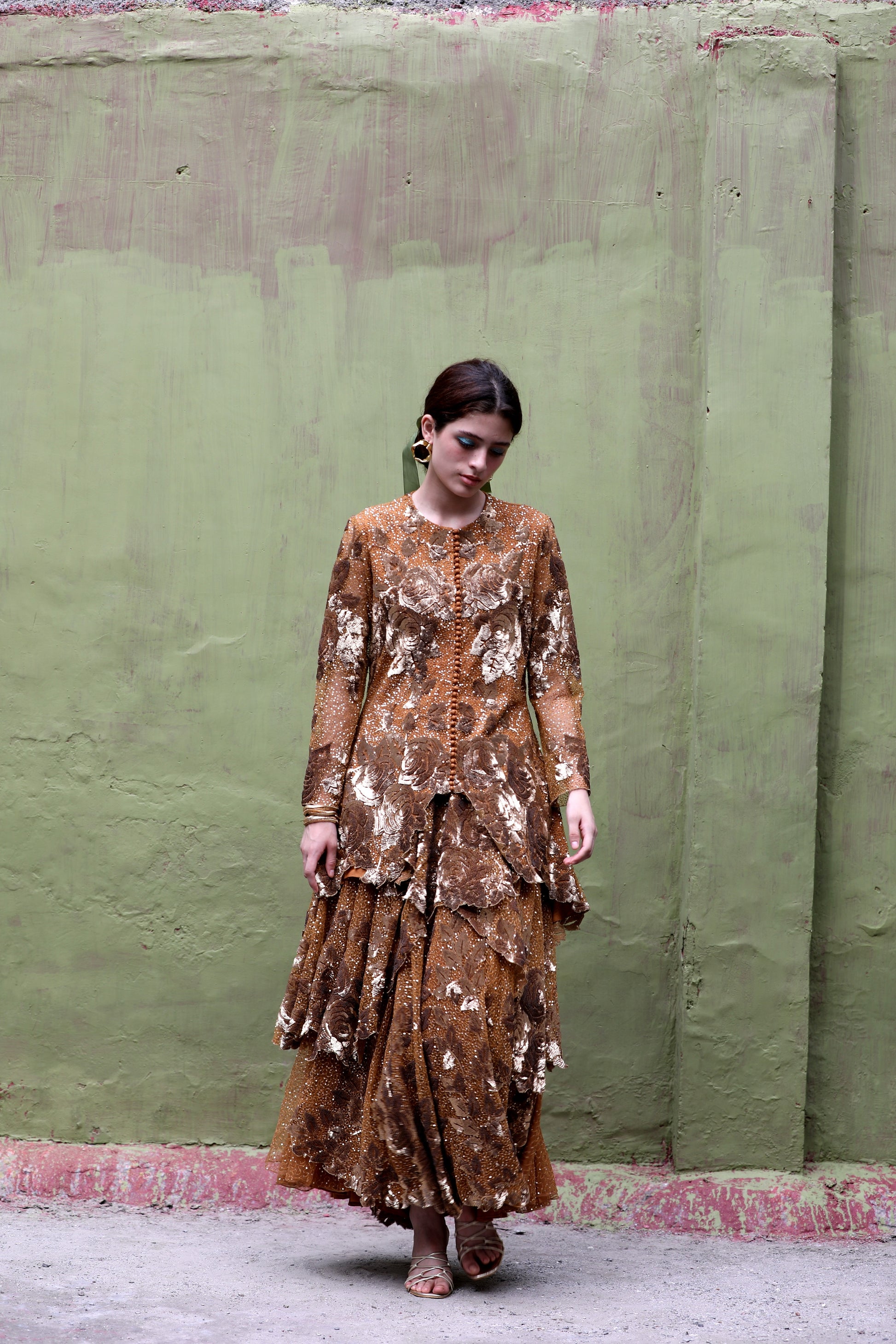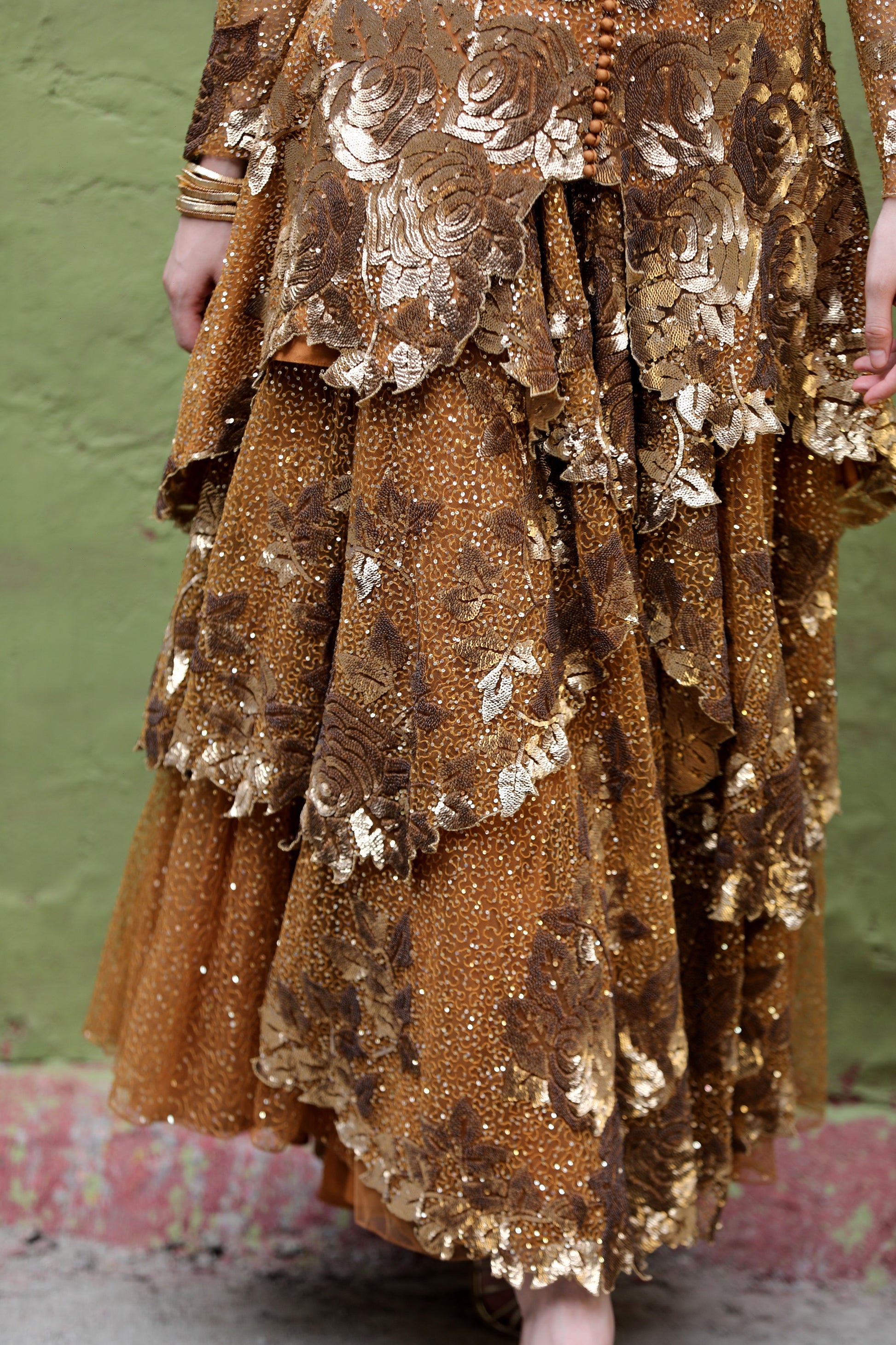 Gold sequins hand embroidered on tulle in Signature floral onto a button down top and multi tier flare skirt.