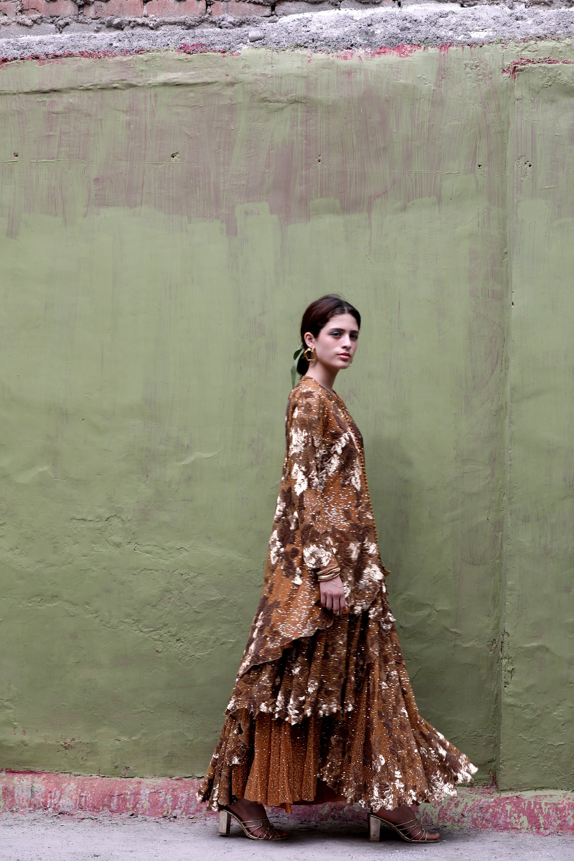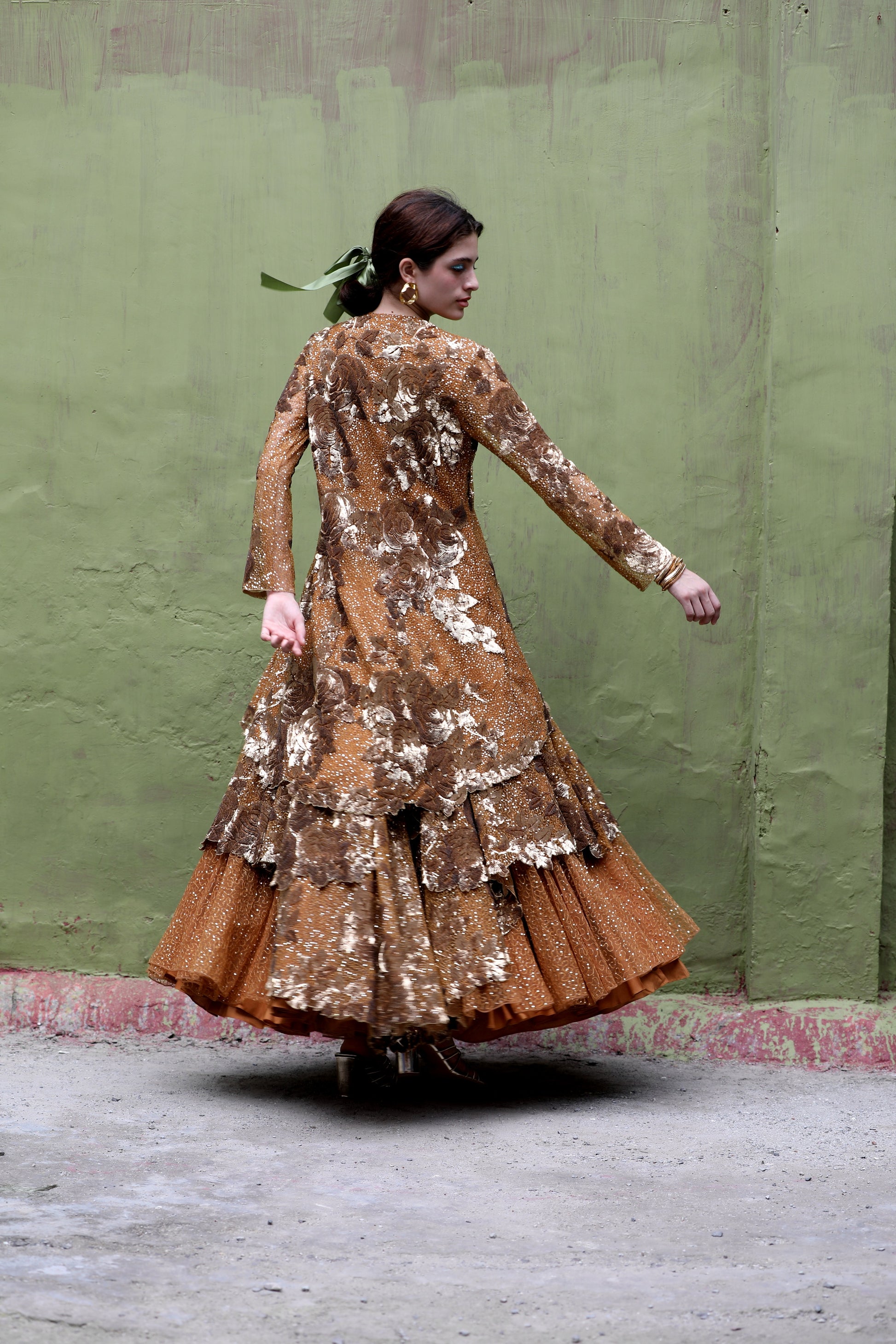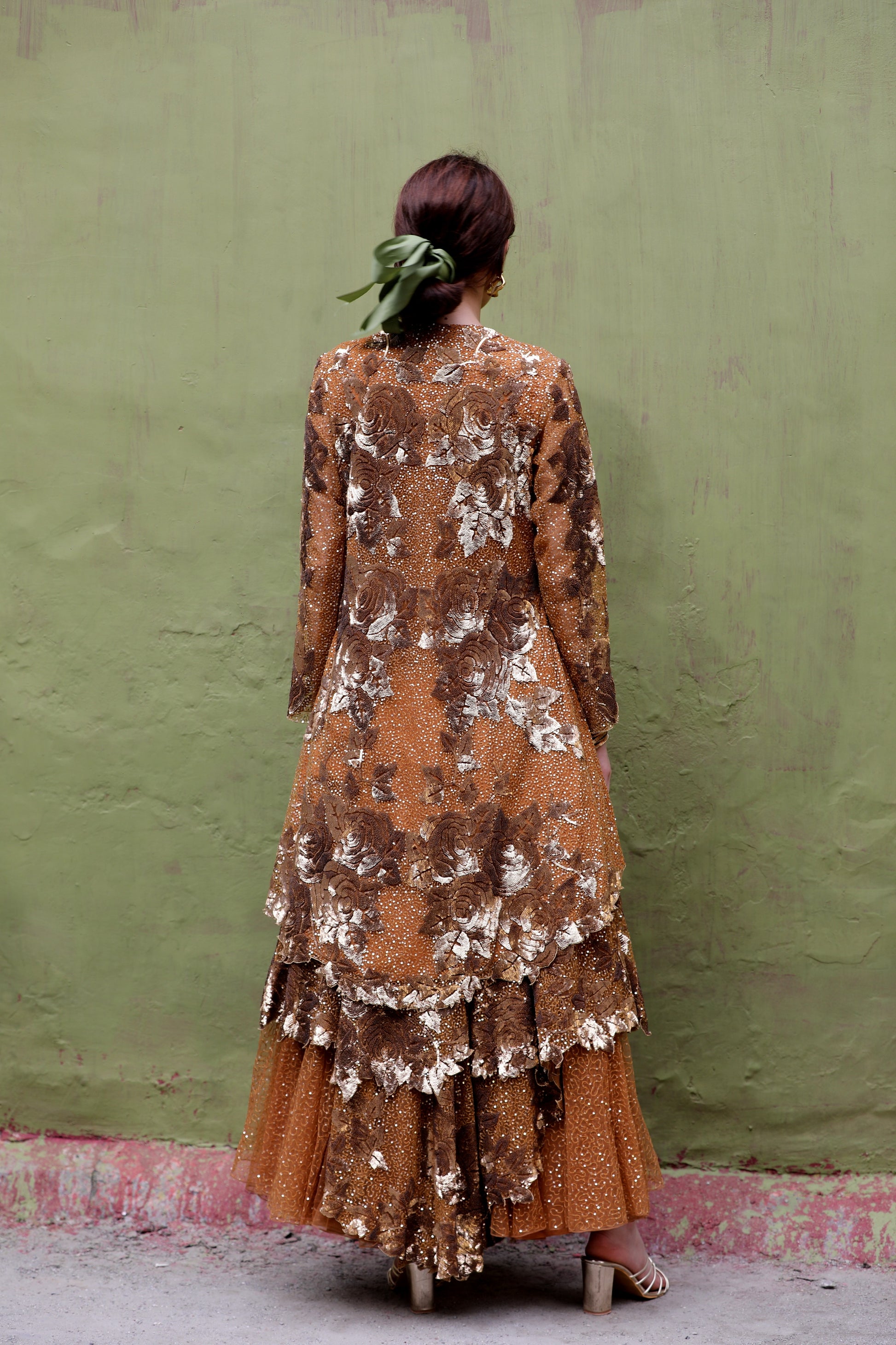 Gold sequins hand embroidered on tulle in Signature floral onto a button down top and multi tier flare skirt.