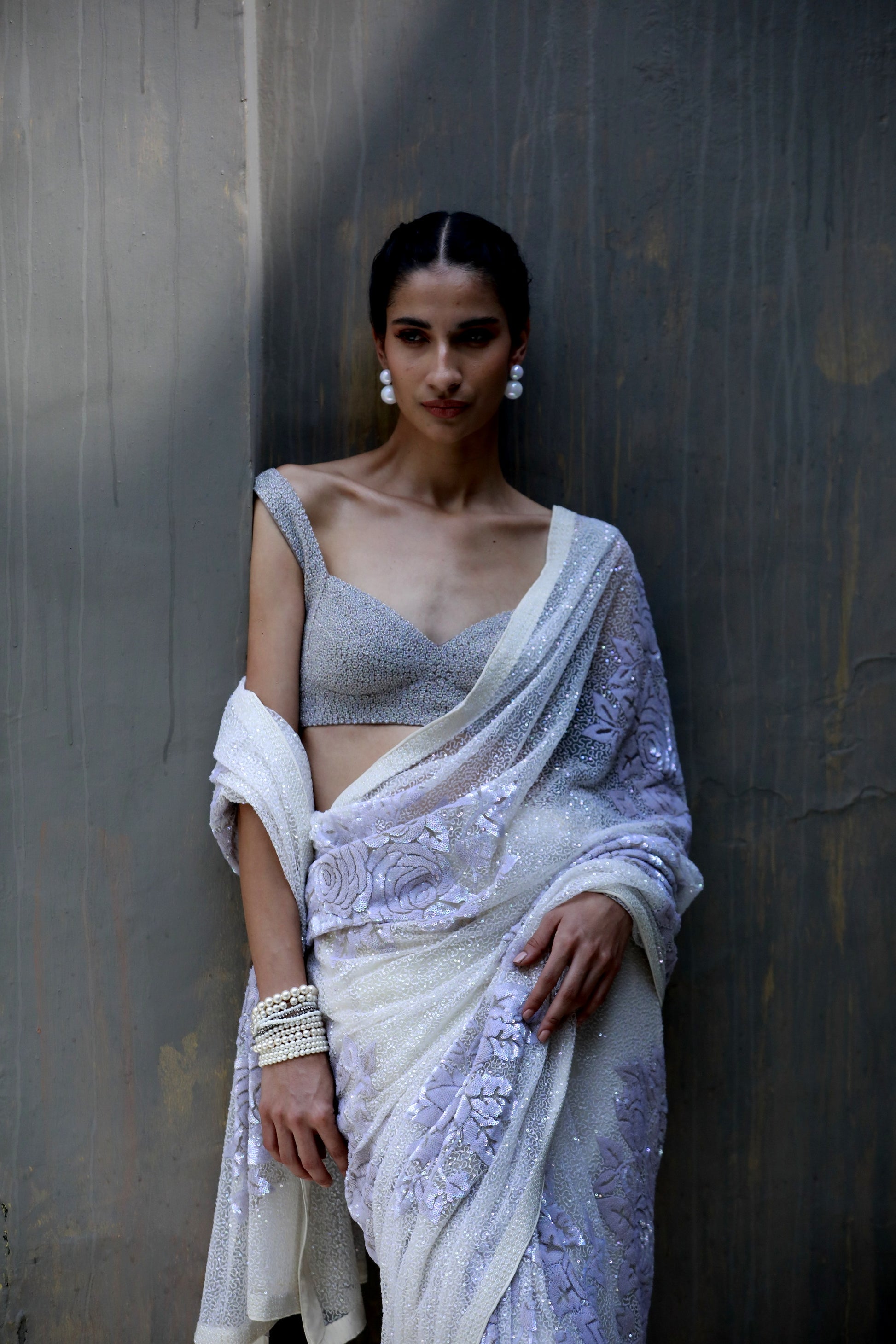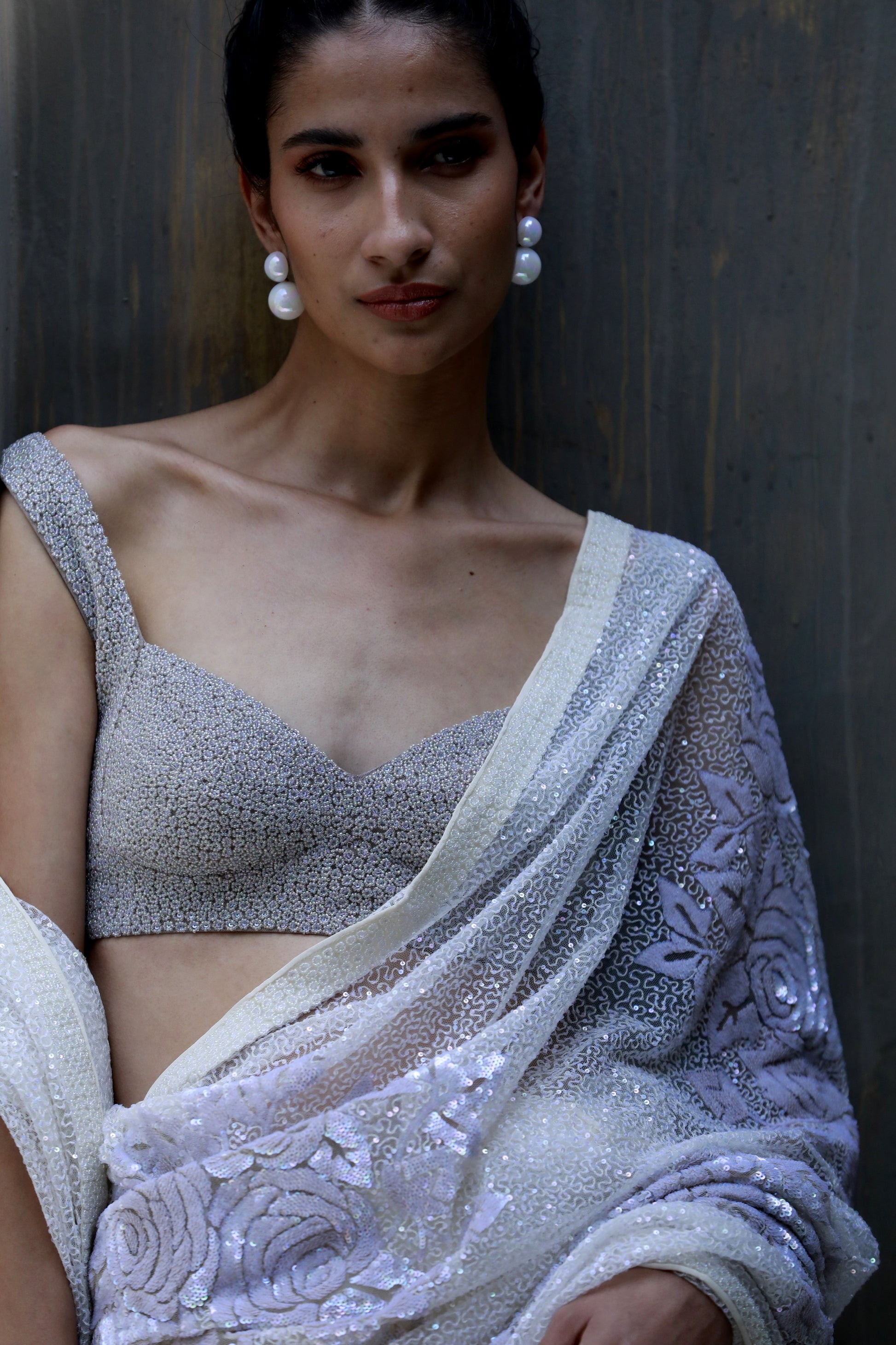 A hand embroidered bandeau blouse in red worn with a tulle fully embellished sari and a mashru silk petticoat embroidered in threads all in Signature Floral.